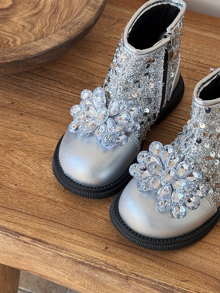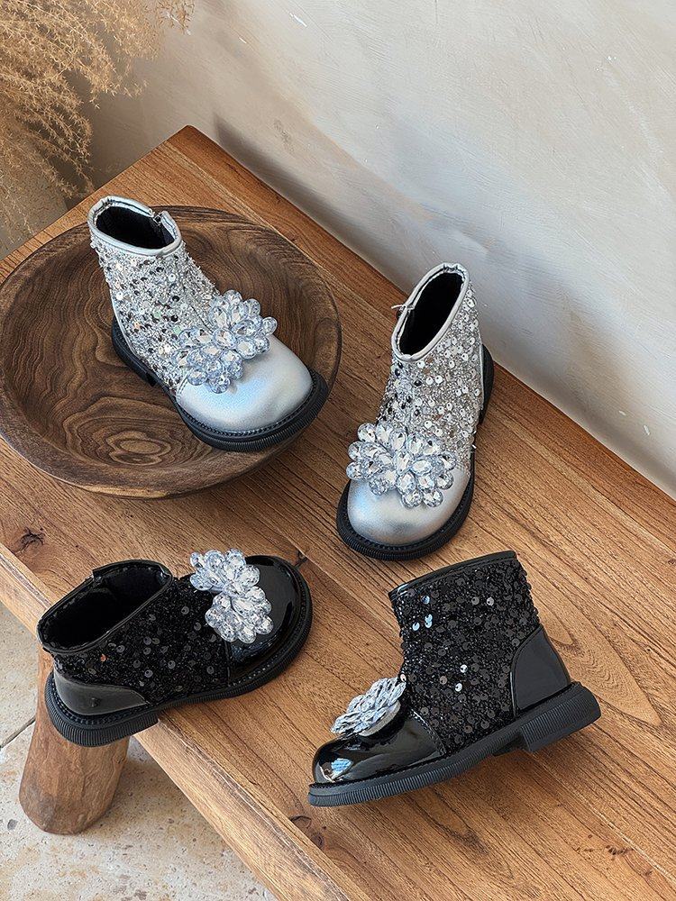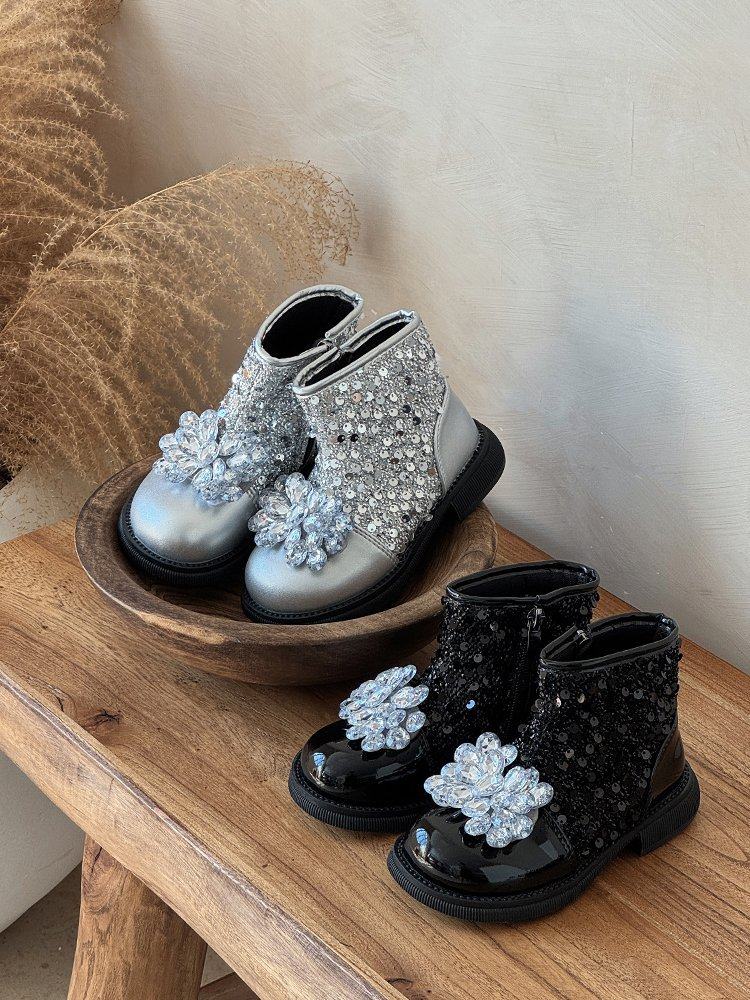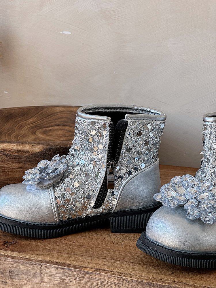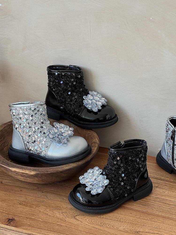 Girls Princess Short Boots Autumn and Winter Children's Boots Sequined Crystal Princess Shoes Silver Style Little Girls Martin Boots