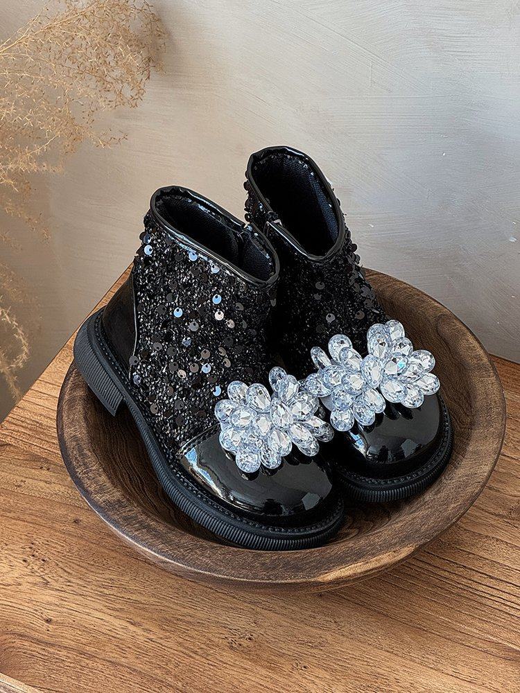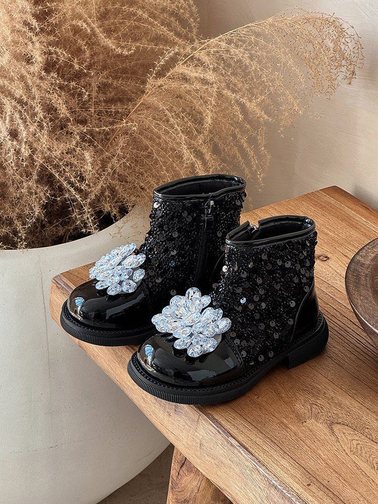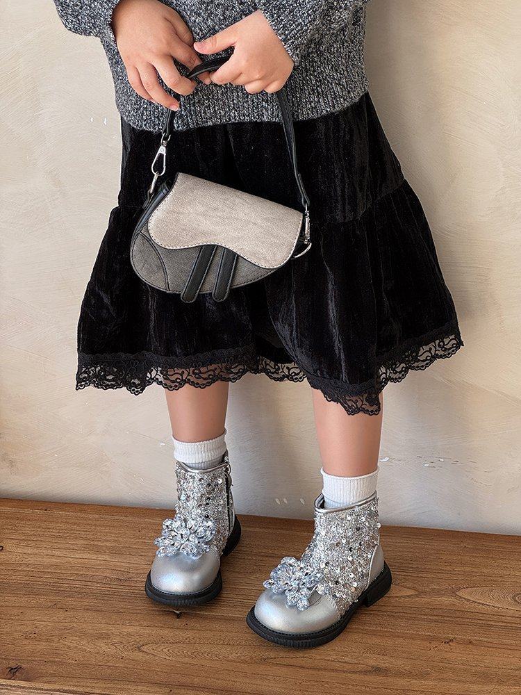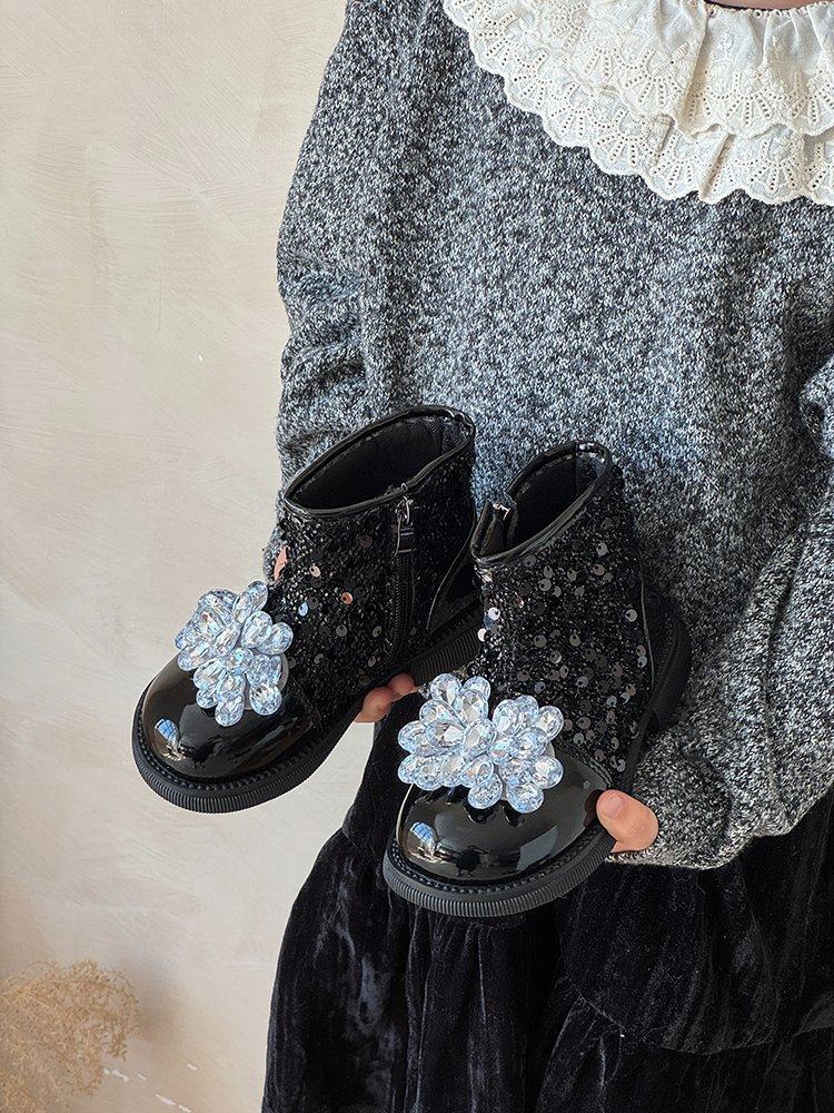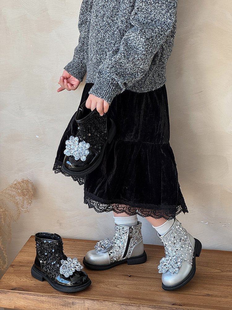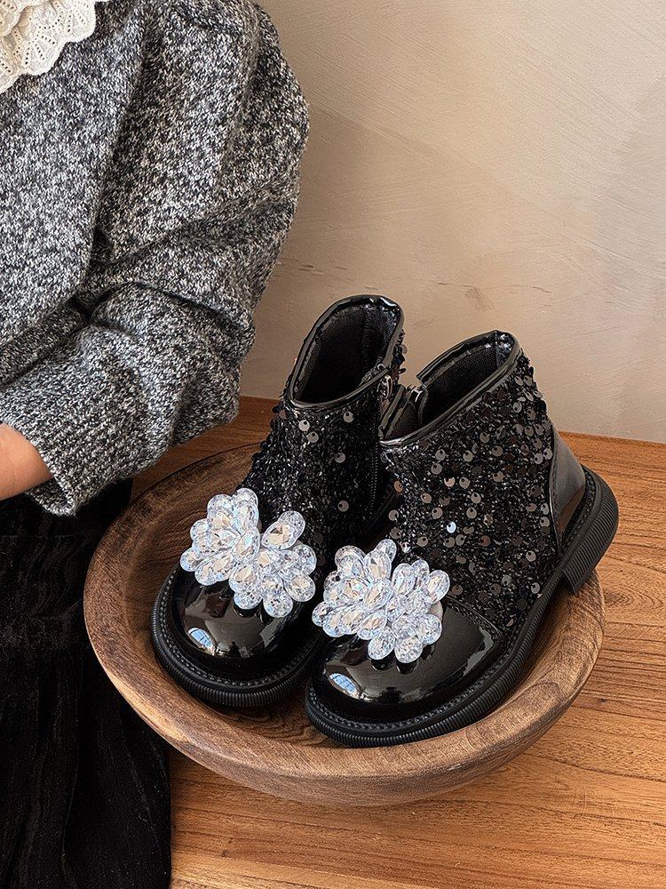 Girls Princess Short Boots Autumn and Winter Children's Boots Sequined Crystal Princess Shoes Silver Style Little Girls Martin Boots