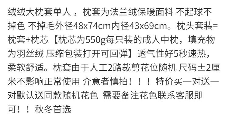 | Size specifications | 48*74cm plush pillowcase [pack of two],48*74cm plush pillowcase [one pack],Special offer: buy one pair and get one pair free (4 pillowcases are actually shipped),One pillow (1 pillow core + 1 pillowcase) |