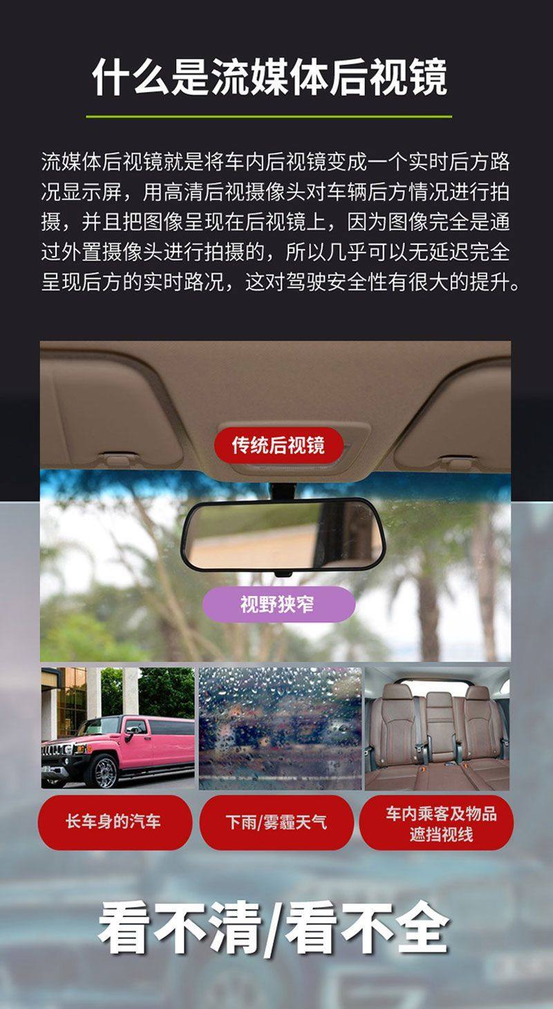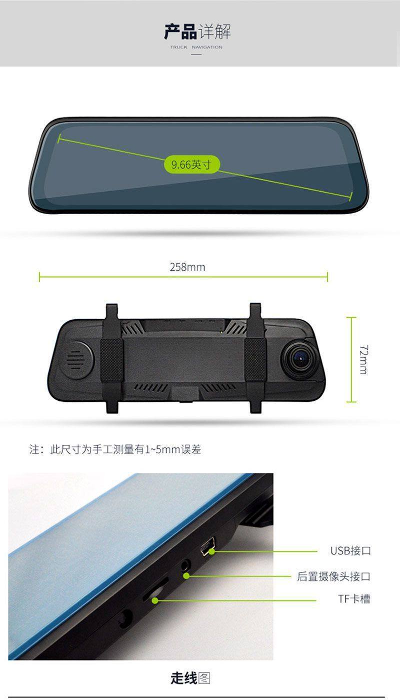 | Function | Reverse image,Loop recording,Parking monitoring,Collision sensing,Enhanced night vision,Screen deformation correction,Before and after recording |