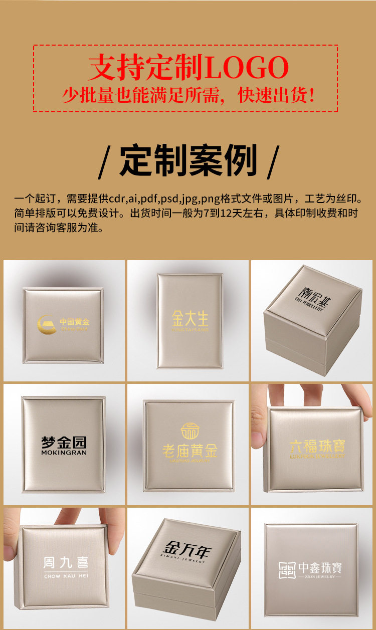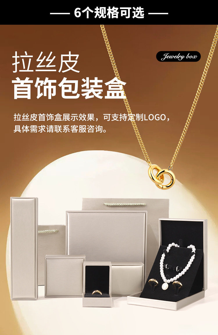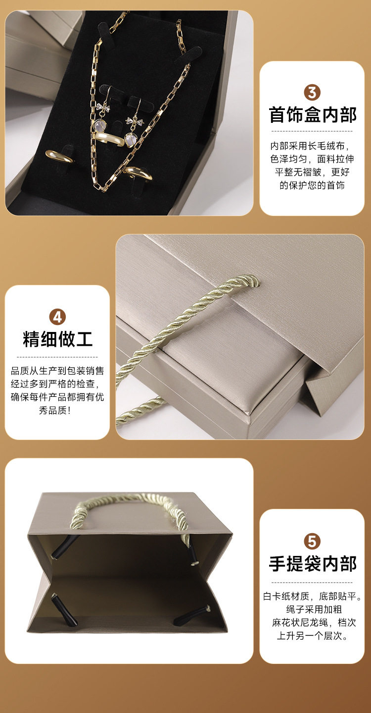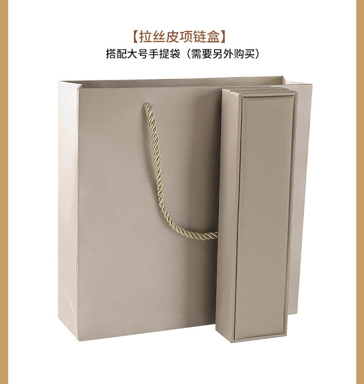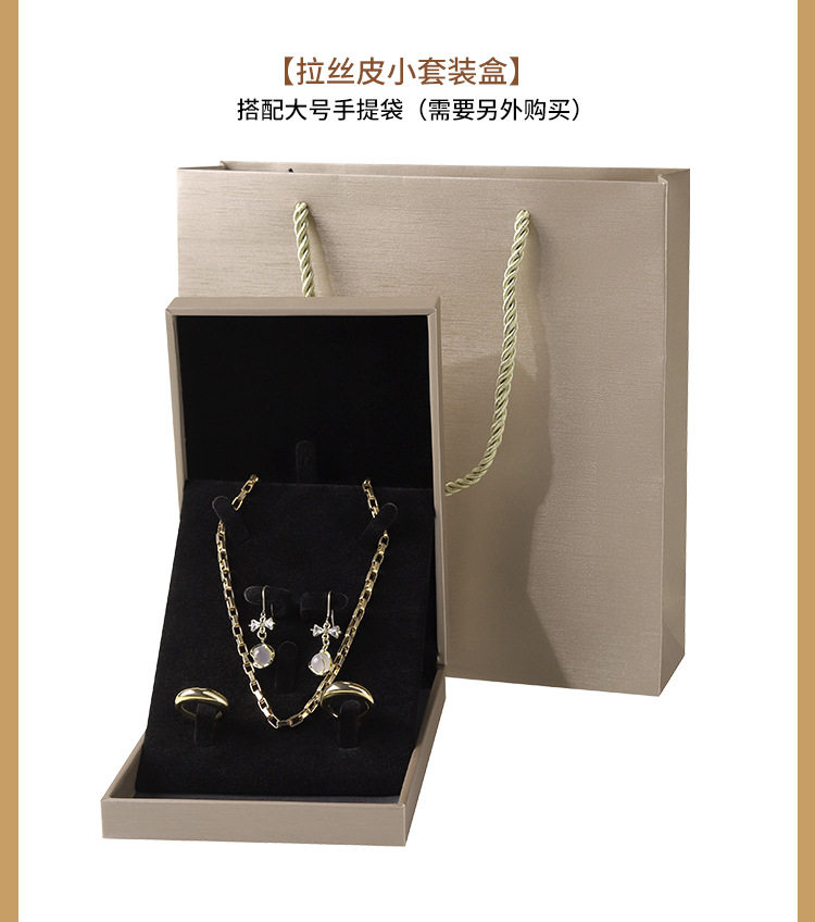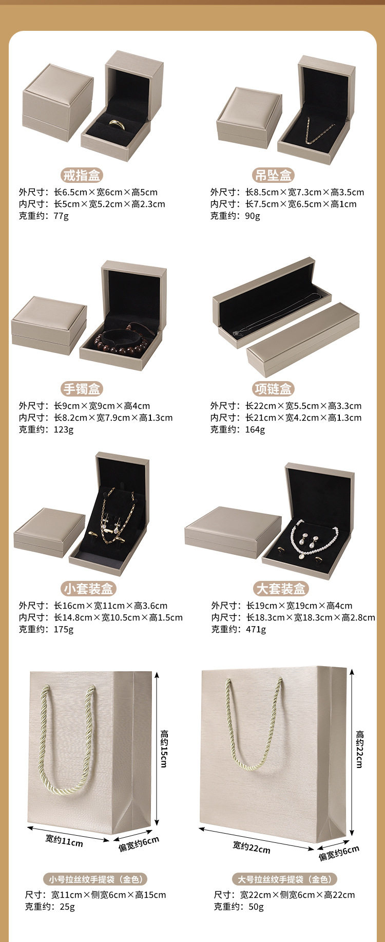| Specifications and models | Gold brushed; black velvet inside ring box 6*6.5*5,Gold brushed; black velvet inside, pendant box 7.5*8.5*3.5,Gold brushed; black velvet inside bracelet box 9*9*4,Gold brushed; black velvet inside, long chain box 22*5.5*3.5,Gold brushed; small tote bag 11*6*15,Gold brushed; large tote bag 22*6*22,Silver gray brushed; black velvet inside, ring box 6*6.5*5,Silver gray brushed; black velvet inside, pendant box 7.5*8.5*3.5,Silver gray brushed; black velvet inside bracelet box 9*9*4,Silver gray brushed; black velvet inside, long chain box 22*5.5*3.5,Silver gray brushed; small handbag 11*6*15,Silver gray brushed; large tote bag 22*6*22,Blue brushed; black velvet inside ring box 6*6.5*5,Blue brushed; black velvet inside, pendant box 7.5*8.5*3.5,Blue brushed; black velvet inside bracelet box 9*9*4,Blue brushed; black velvet inside, long chain box 22*5.5*3.5,Blue brushed; small tote bag 11*6*15,Blue brushed; large tote bag 22*6*22,Maroon brushed; black velvet inside, ring box 6*6.5*5,Maroon brushed; black velvet inside, pendant box 7.5*8.5*3.5,Maroon brushed; black velvet inside bracelet box 9*9*4,Maroon brushed; black velvet inside, long chain box 22*5.5*3.5,Maroon brushed; small handbag 11*6*15,Maroon brushed; large handbag 22*6*22,Black brushed; black velvet inside ring box 6*6.5*5,Black brushed; black velvet inside, pendant box 7.5*8.5*3.5,Black brushed; black velvet inside bracelet box 9*9*4,Black brushed; black velvet inside, long chain box 22*5.5*3.5,Black brushed; large set 19*19*4.5 |