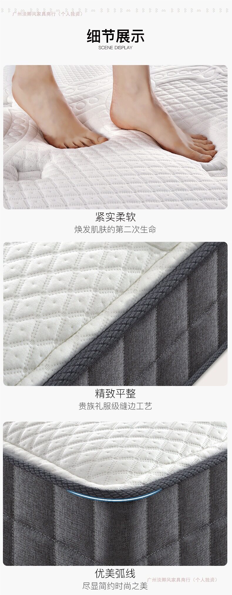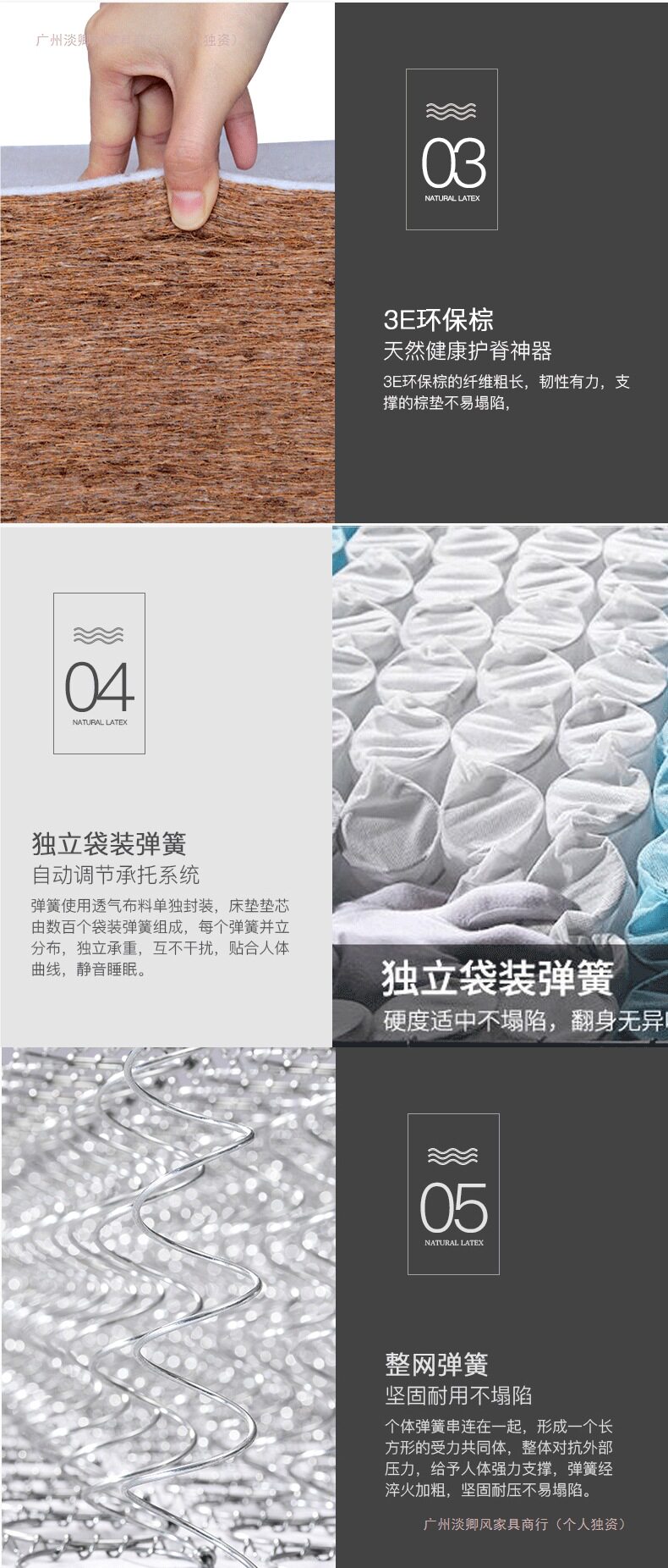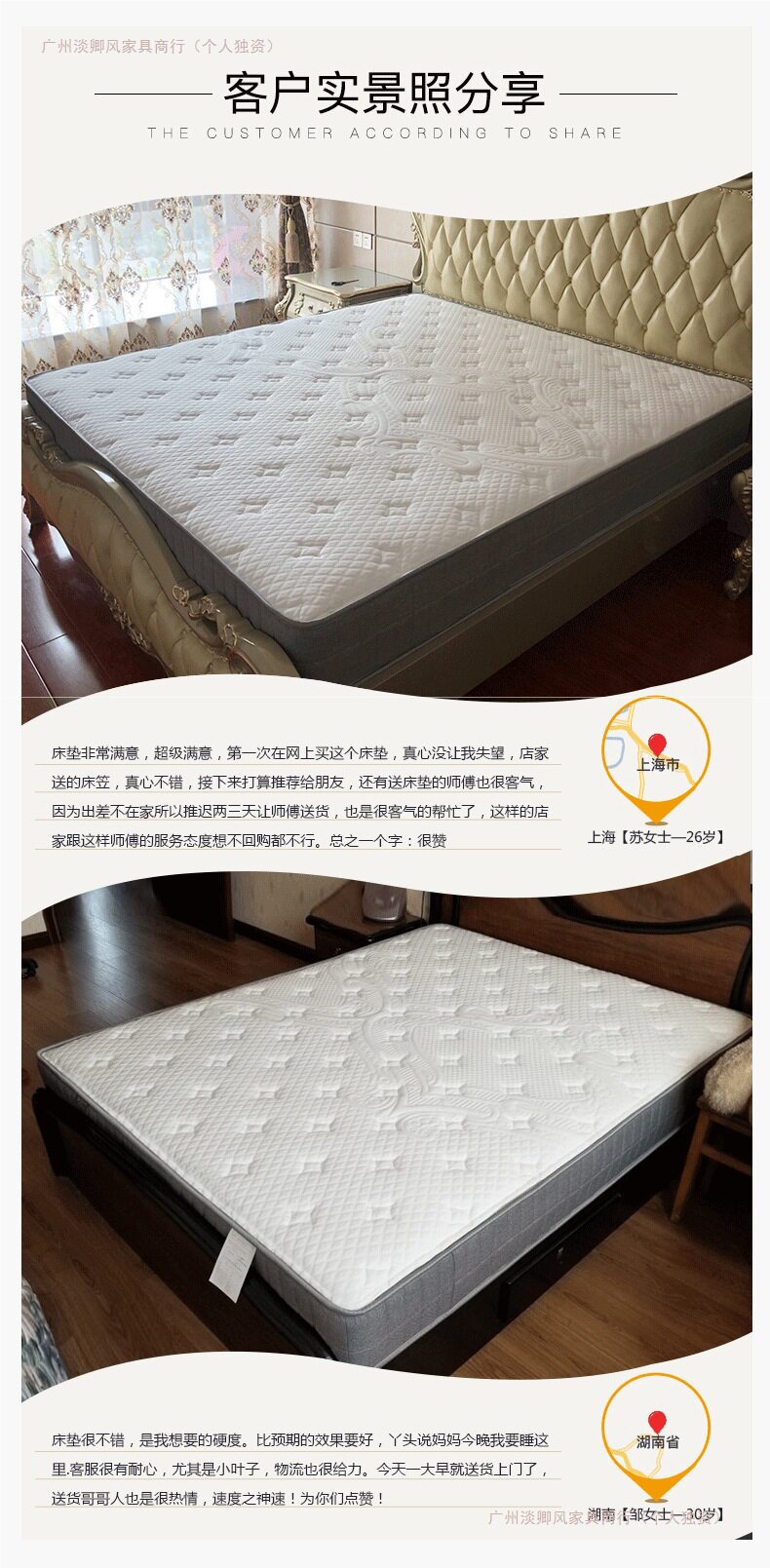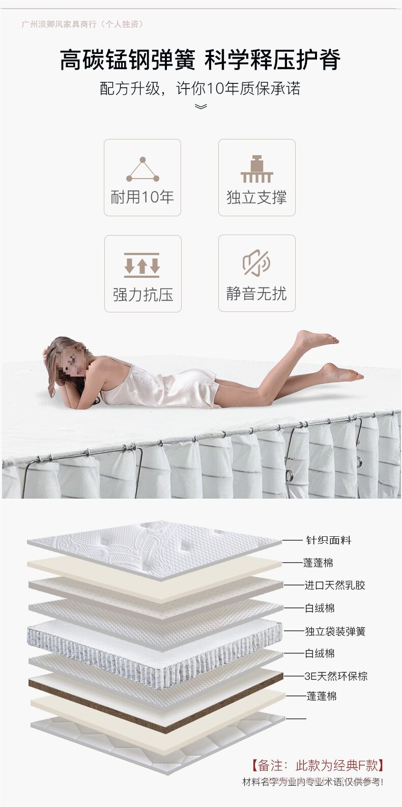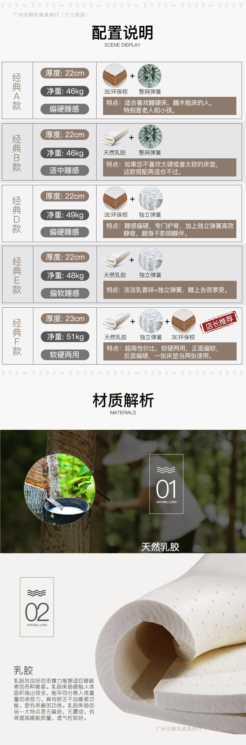 | Color | Classic model a: environmentally friendly brown + whole mesh spring (harder, about 22cm),Classic b model: latex + full mesh spring (moderate about 22cm),Classic d model: environmentally friendly brown + independent spring (moderate about 22cm),Classic e model: latex + independent spring (soft about 22cm),Classic f style: latex + independent + brown (one side is soft and the other is hard, about 23cm) |