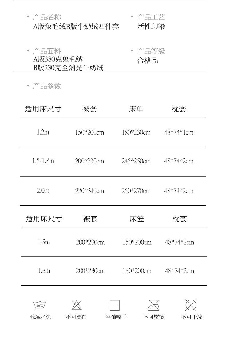 | Size specifications | 1.2m three-piece bed sheet set: 150*200cm quilt cover 180*230 bed sheet 48*74 pillowcase,1.5/1.8m bed sheet four-piece set: quilt cover 200*230cm bed sheet 245*250cm pillowcase 48*74cm*2,2.0m bed sheet four-piece set: quilt cover 220*240cm bed sheet 250*270cm pillowcase 48*74cm*2,1.5m four-piece fitted sheet set: 200*230 quilt cover, 150*200cm fitted sheet, 48*74 pillowcase,1.8m four-piece fitted sheet set: 200*230 quilt cover, 180*200 fitted sheet, 48*74 pillowcase |