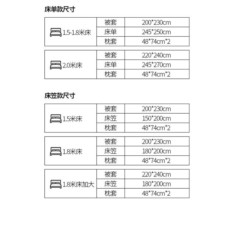 | Size specifications | 1.2m bed sheet three-piece set (suitable for quilt core 150*200cm),1.5m bed sheet four-piece set (suitable for quilt core 200*230cm),1.8m bed sheet four-piece set (suitable for quilt core 200*230cm),1.8/ 2.0m bed sheet style four-piece oversized quilt cover set (suitable for quilt core 220*240cm),1.5m fitted sheet set of four (suitable for quilt core 200*230cm),1.8m fitted sheet set of four (suitable for quilt core 200*230cm),1.8m fitted sheet and quilt cover plus four-piece set (suitable for quilt core 220*240cm) |