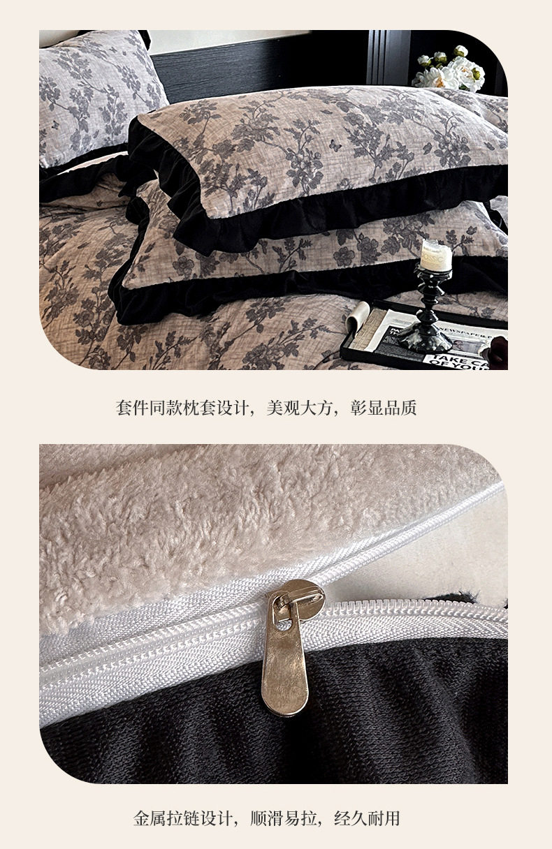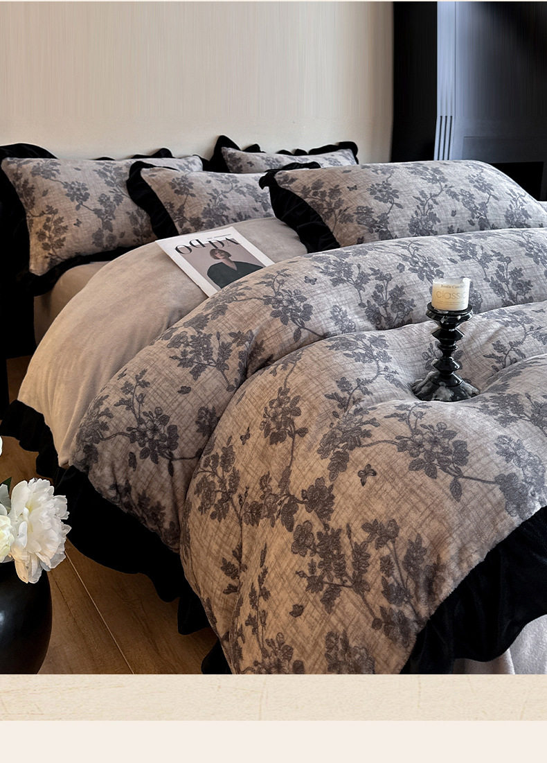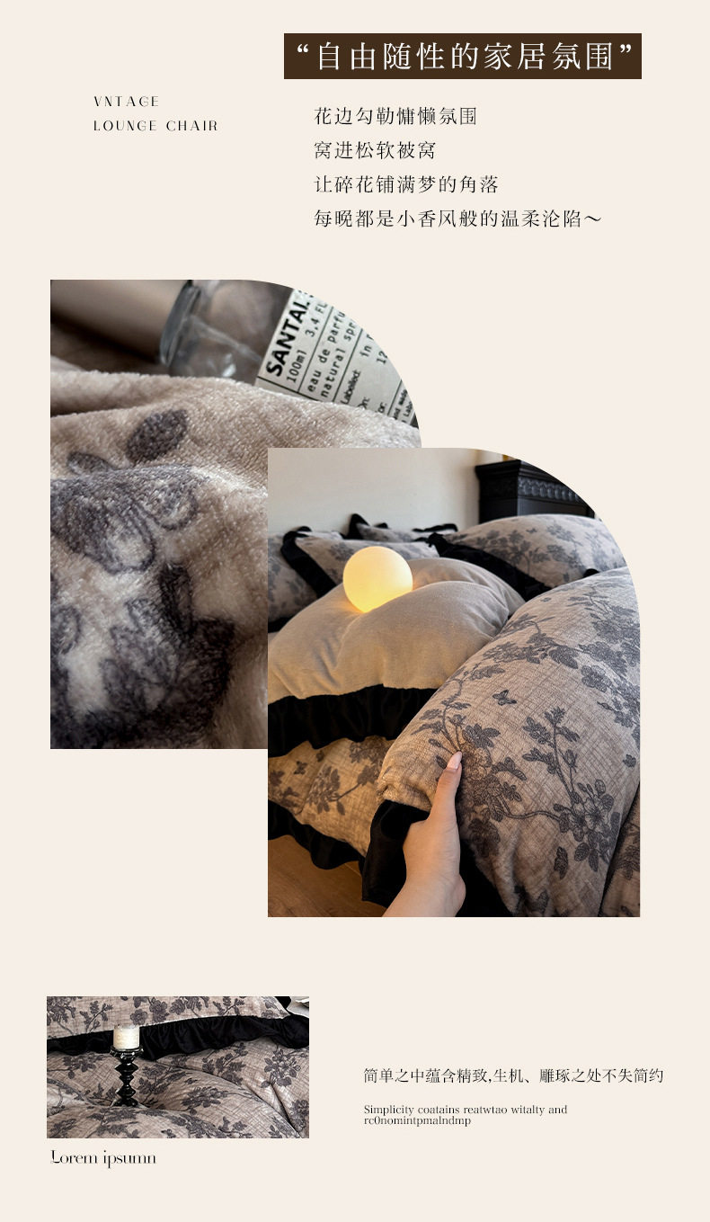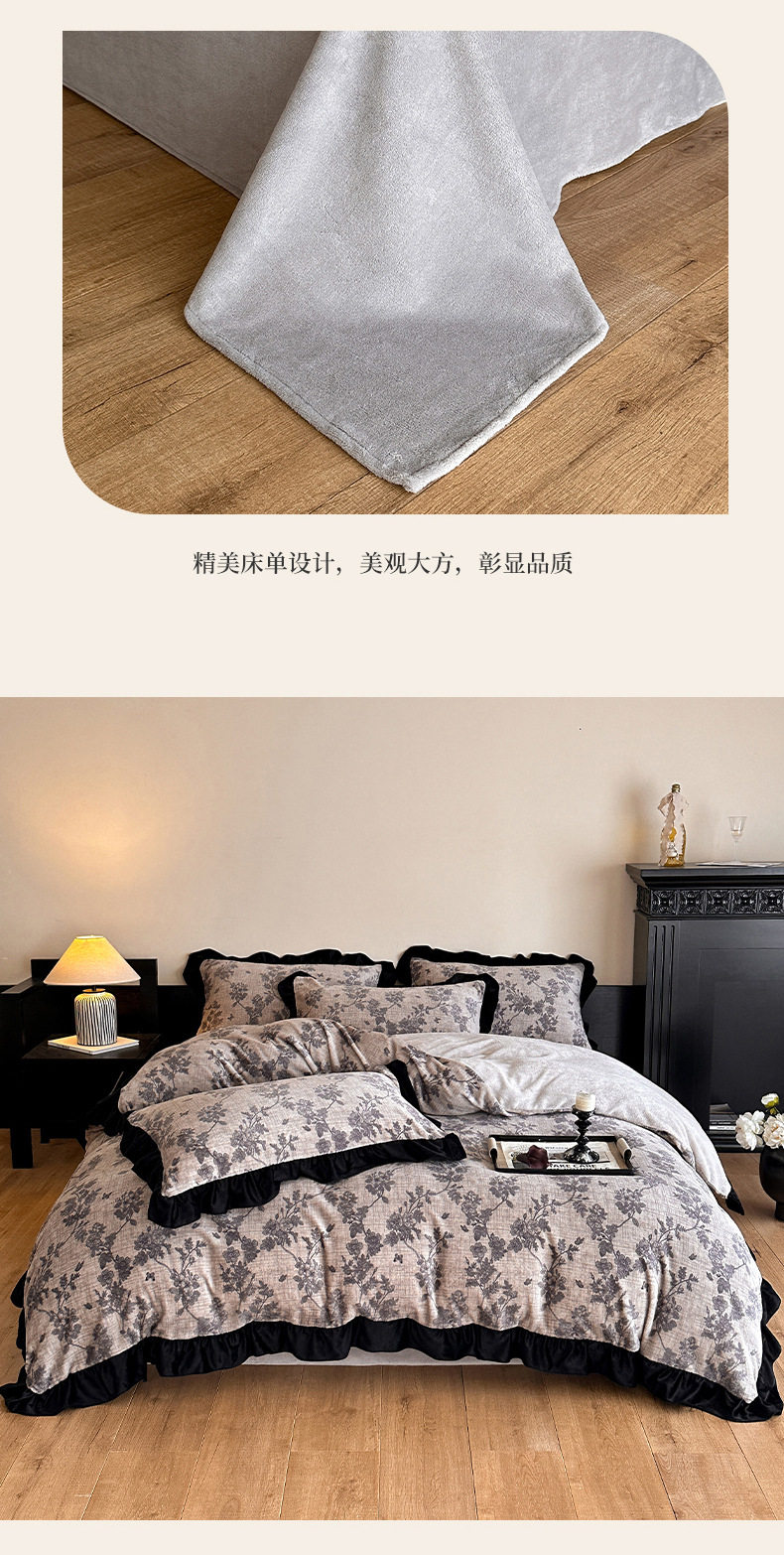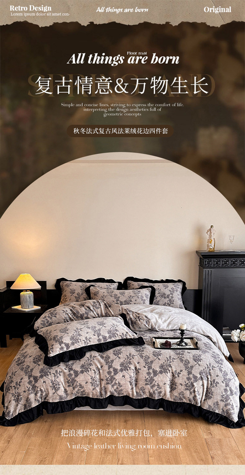Autumn and Winter French Retro Style Milk Velvet Four-Piece Set Flannel Coral Velvet Lace Quilt Cover Bed Sheetss and Fitted Bed Sheetss Three-Piece Set