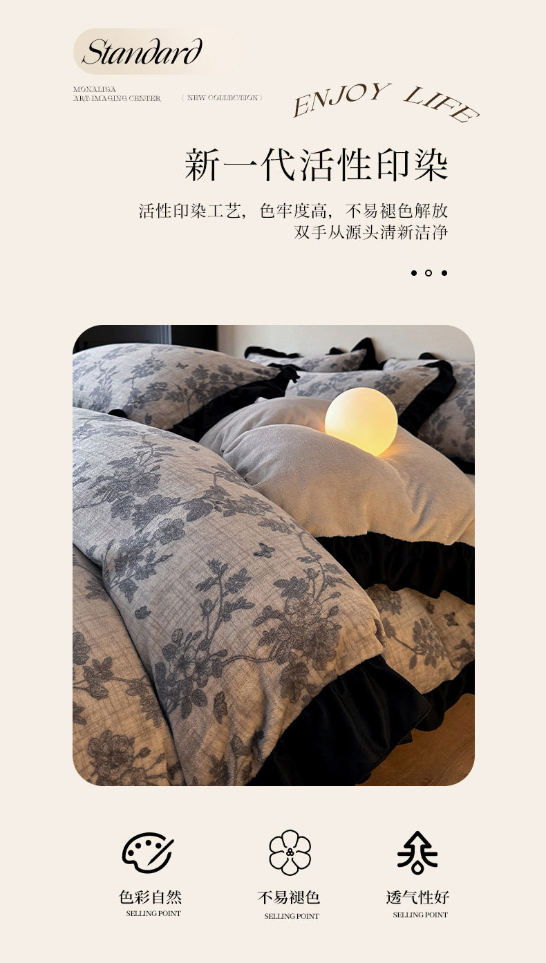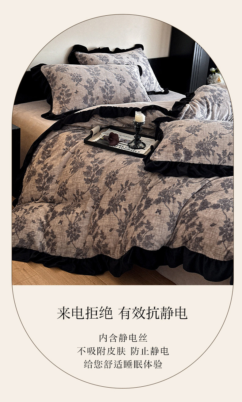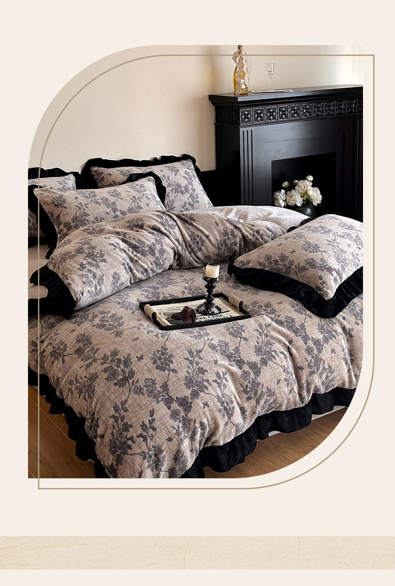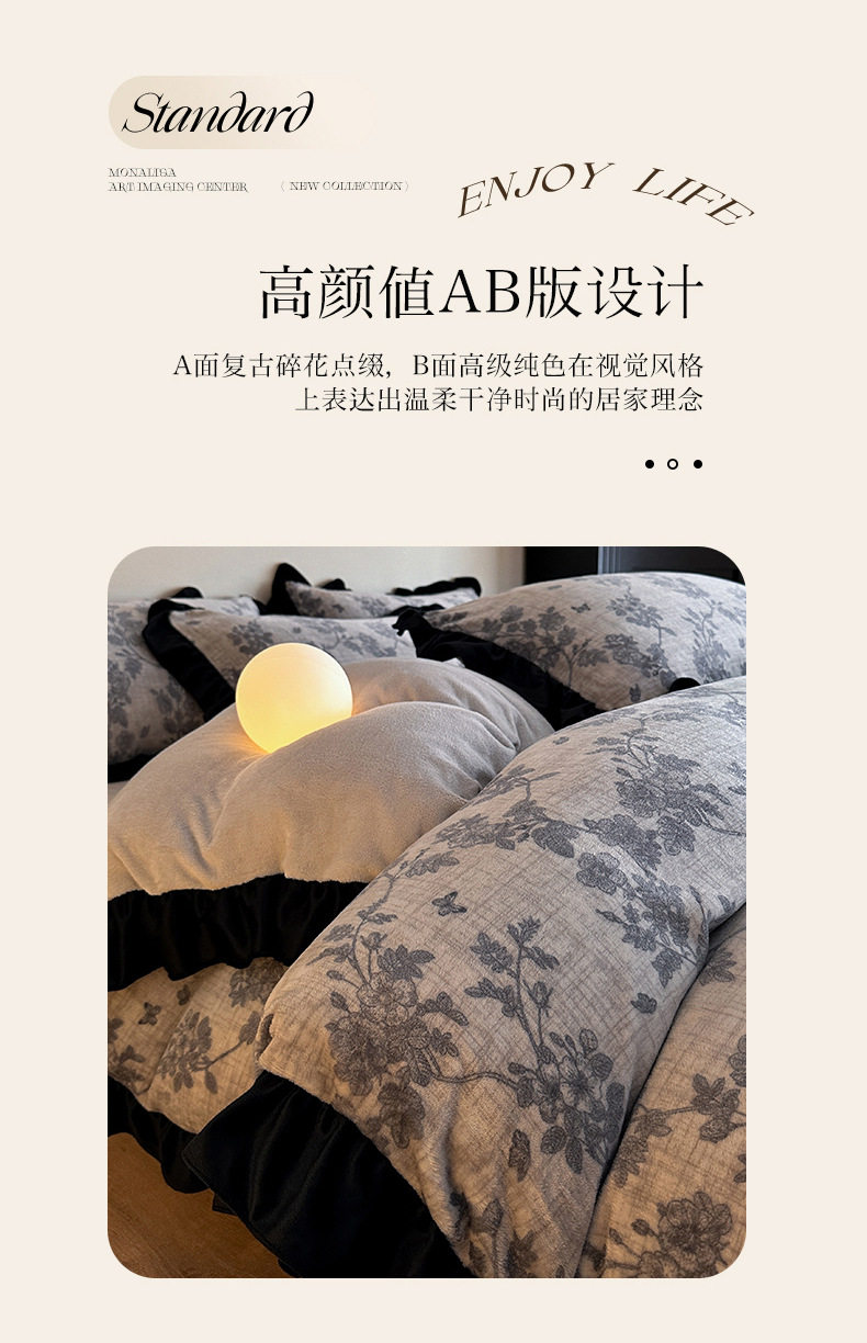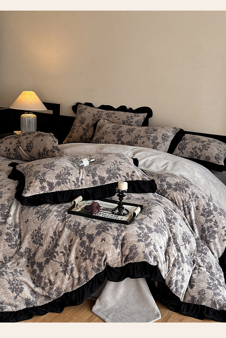 Autumn and Winter French Retro Style Milk Velvet Four-Piece Set Flannel Coral Velvet Lace Quilt Cover Bed Sheetss and Fitted Bed Sheetss Three-Piece Set