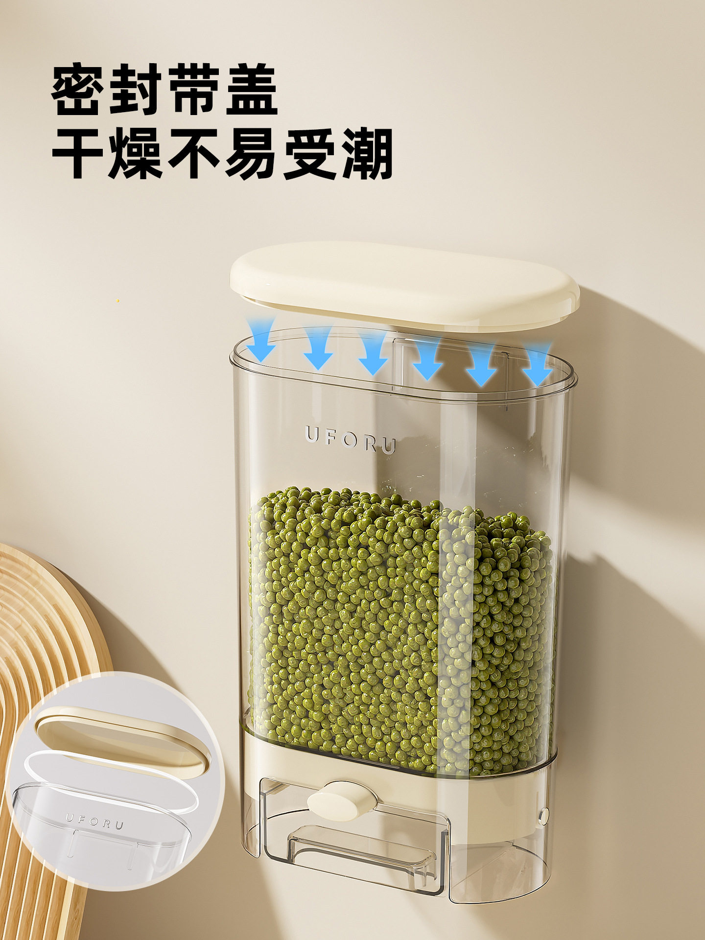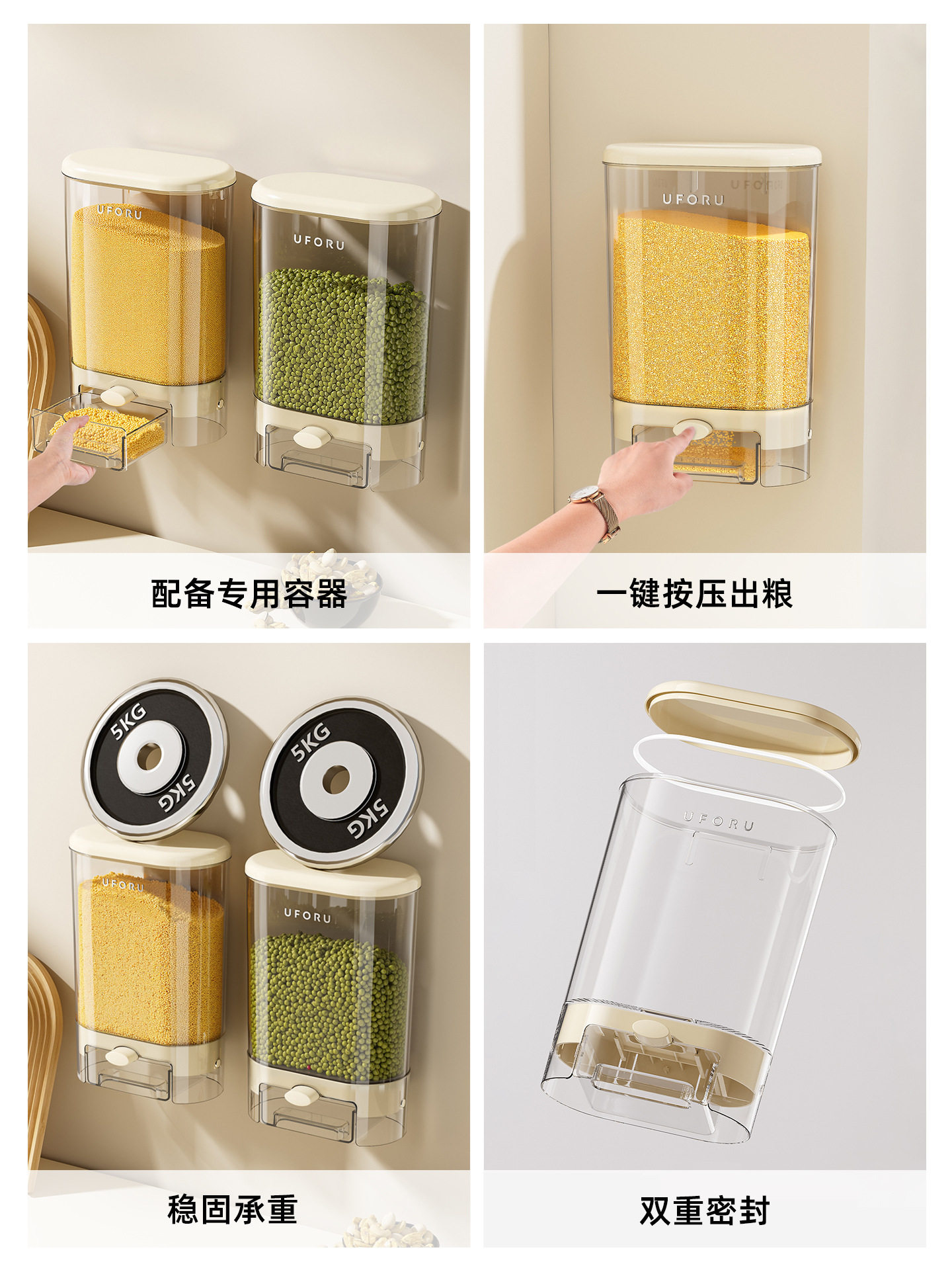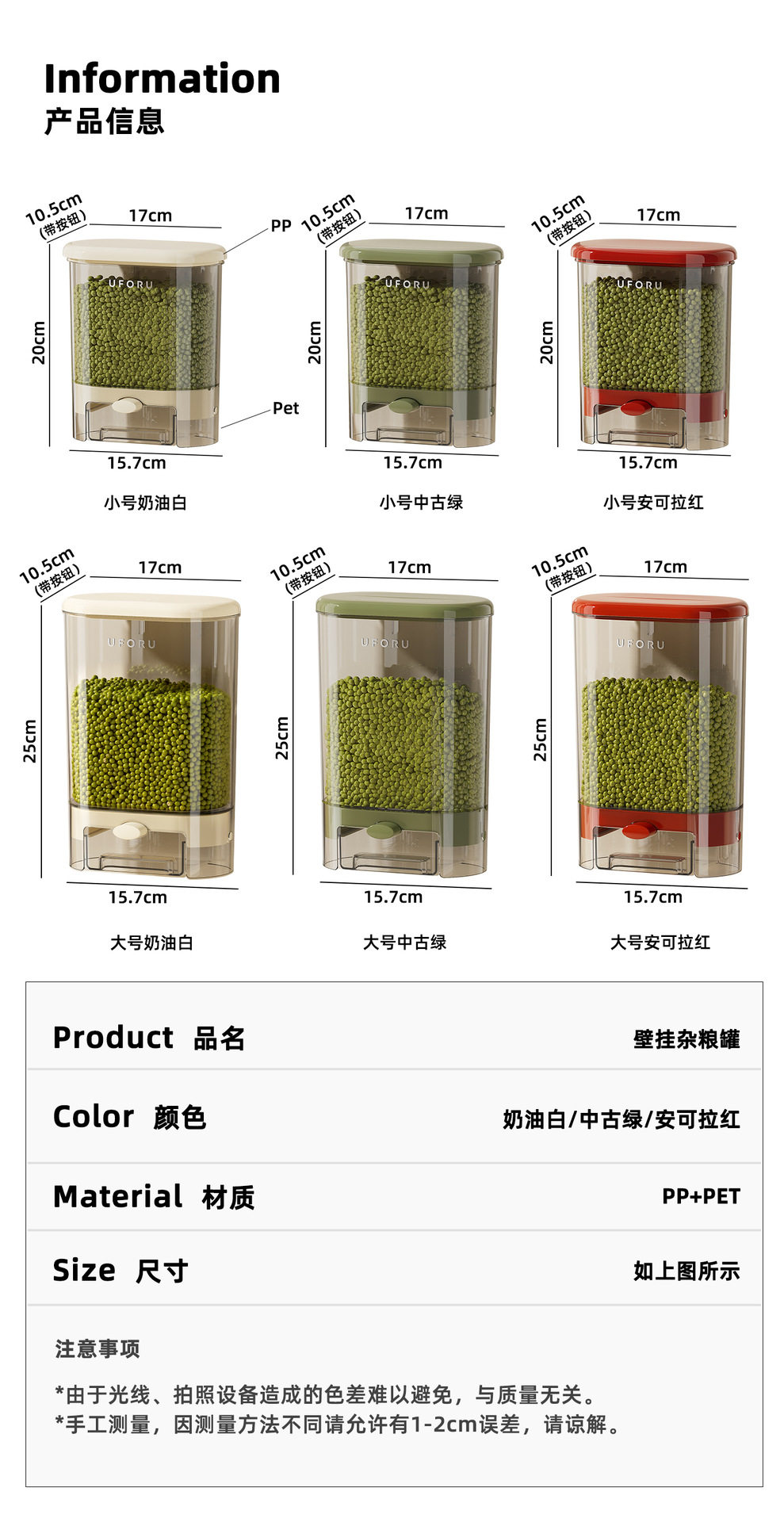 Grain Storage Box for Home Kitchen, Food-Grade Sealed Jar, Large Capacity, Wall-Mounted, Press-To-Dispense Grain Jar