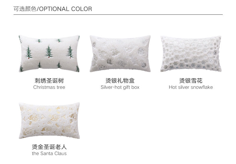 | Color | Embroidered christmas tree,Bronzing santa claus,Hot silver gift box,Hot silver snowflake,Golden tree on white background,Two gray and one red tree,Embroidered pine tree |