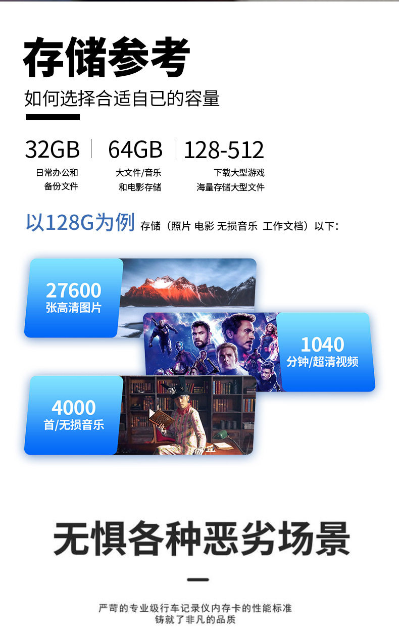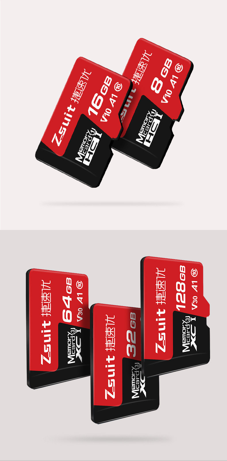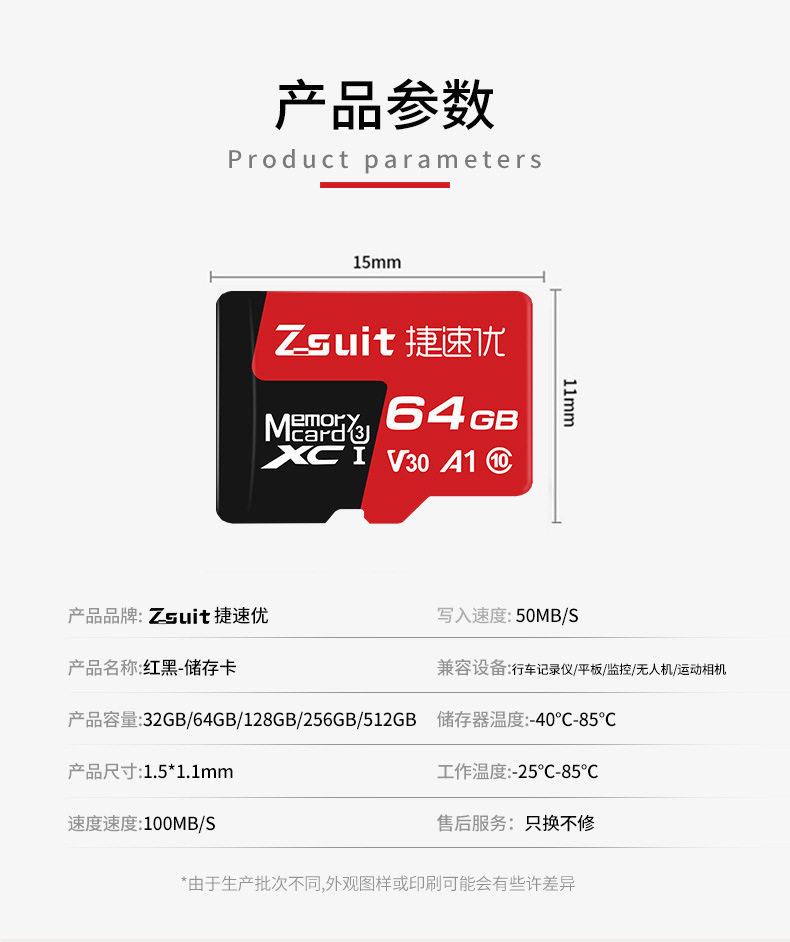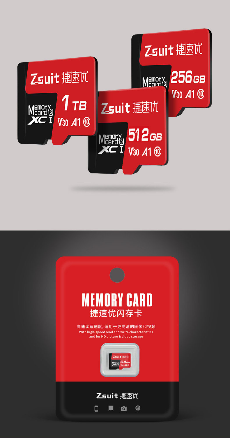 | Capacity | 【8GB】C10,【16GB】C10/U3,【32GB】C10/U3,【64GB】C10/U3/A1/V30,【128GB】U3/A1/V30,【256GB】U3/A1/V30,【512GB】U3/A2/V60,【1TB】U3/A2/V60 |