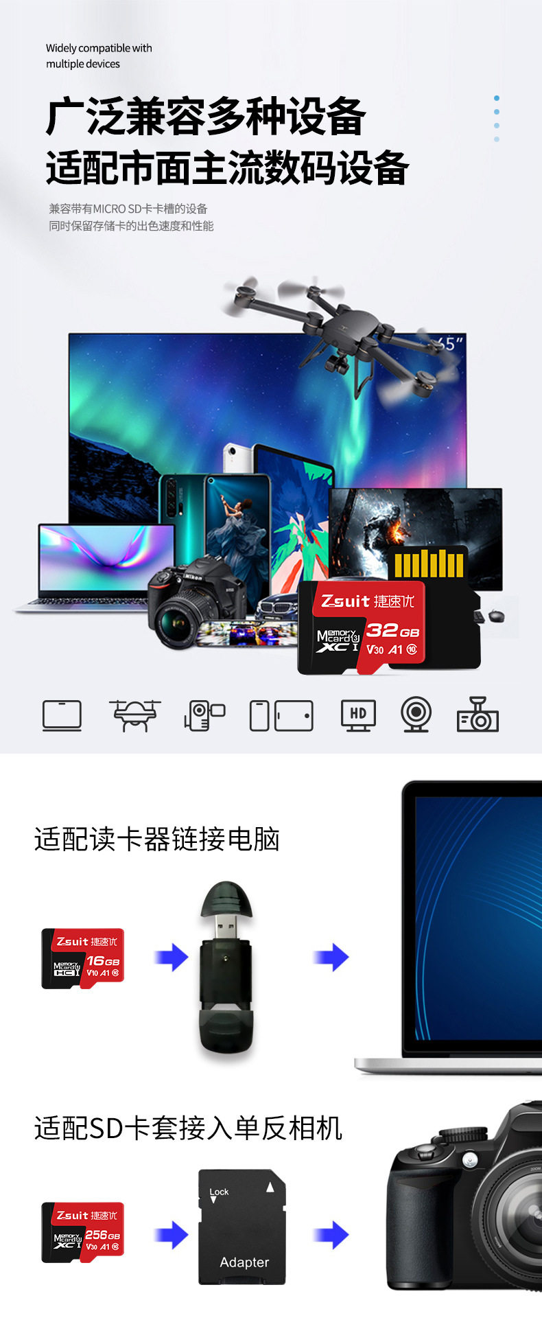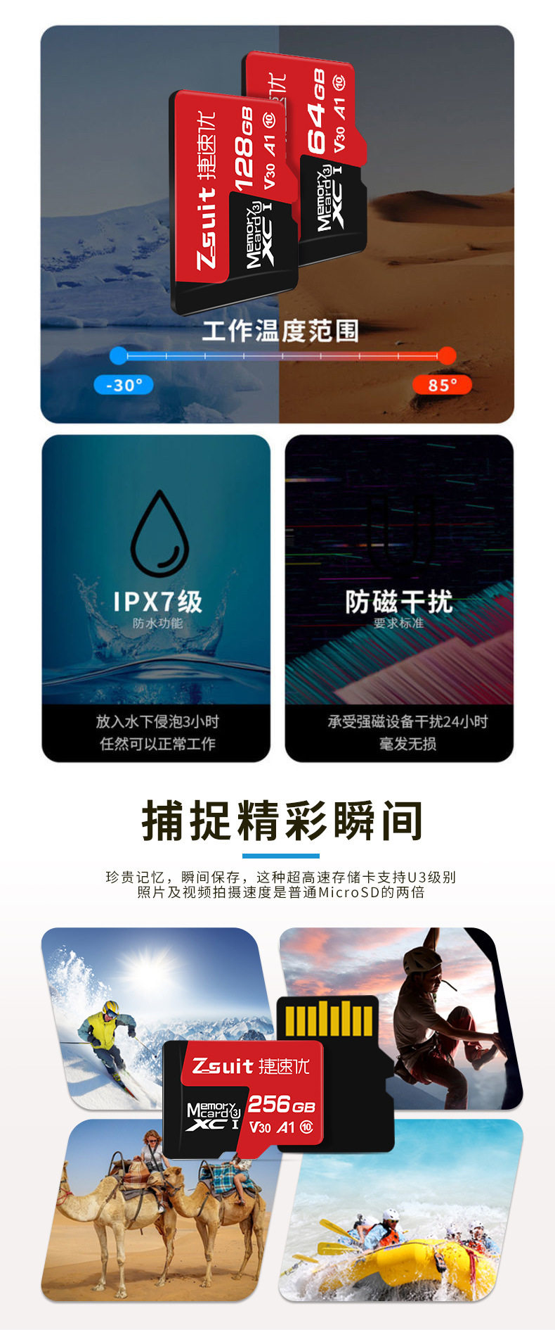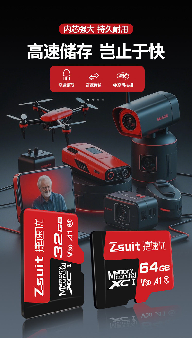 | Capacity | 【8GB】C10,【16GB】C10/U3,【32GB】C10/U3,【64GB】C10/U3/A1/V30,【128GB】U3/A1/V30,【256GB】U3/A1/V30,【512GB】U3/A2/V60,【1TB】U3/A2/V60 |