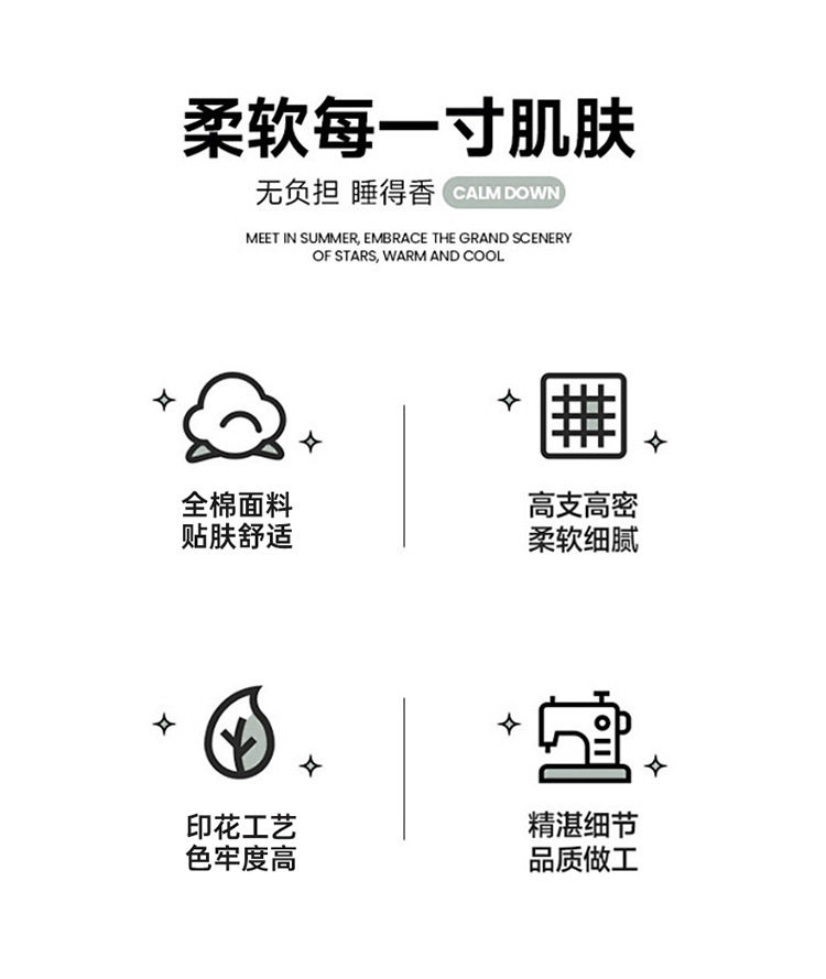 | Size specifications | 1.2m bed sheet three-piece quilt cover 150*200 bed sheet 180*230 pillowcase 48*74*1❋☽☽,1.5m bed sheet style four-piece quilt cover 200*230 bed sheet 245*250 pillowcase 48*74*2❋☽☽,1.8m bed sheet four-piece quilt cover 200*230 sheets 245*250 pillowcases 48*74*2❋☽☽,2.0m bed sheet style four-piece quilt cover 220*240 bed sheet 245*270 pillowcase 48*74*2❋☽☽ |