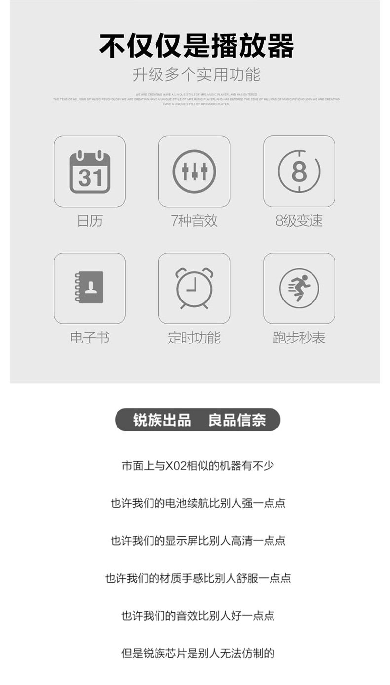 | Memory capacity | 4g-official standard configuration,4g-package one [metal headphones],4g-package 2 [hifi bass headphones],8g-official standard configuration,8g-package one [metal headphones],8g-package 2 [hifi bass headphones],4g (bluetooth version)-official standard,4g (bluetooth version)-package 1 [metal headphones],4g (bluetooth version)-package 2 [hifi bass headphones],4g (bluetooth version)-package three [wireless bluetooth headset],8g (bluetooth version)-official standard,8g (bluetooth version)-package 1 [metal headphones],8g (bluetooth version)-package 2 [hifi bass headphones],8g (bluetooth version)-package three [wireless bluetooth headset],16g (bluetooth version)-official standard,16g (bluetooth version)-package 1 [metal headphones],16g (bluetooth version)-package 2 [hifi bass headphones],16g (bluetooth version)-package three [wireless bluetooth headset] |