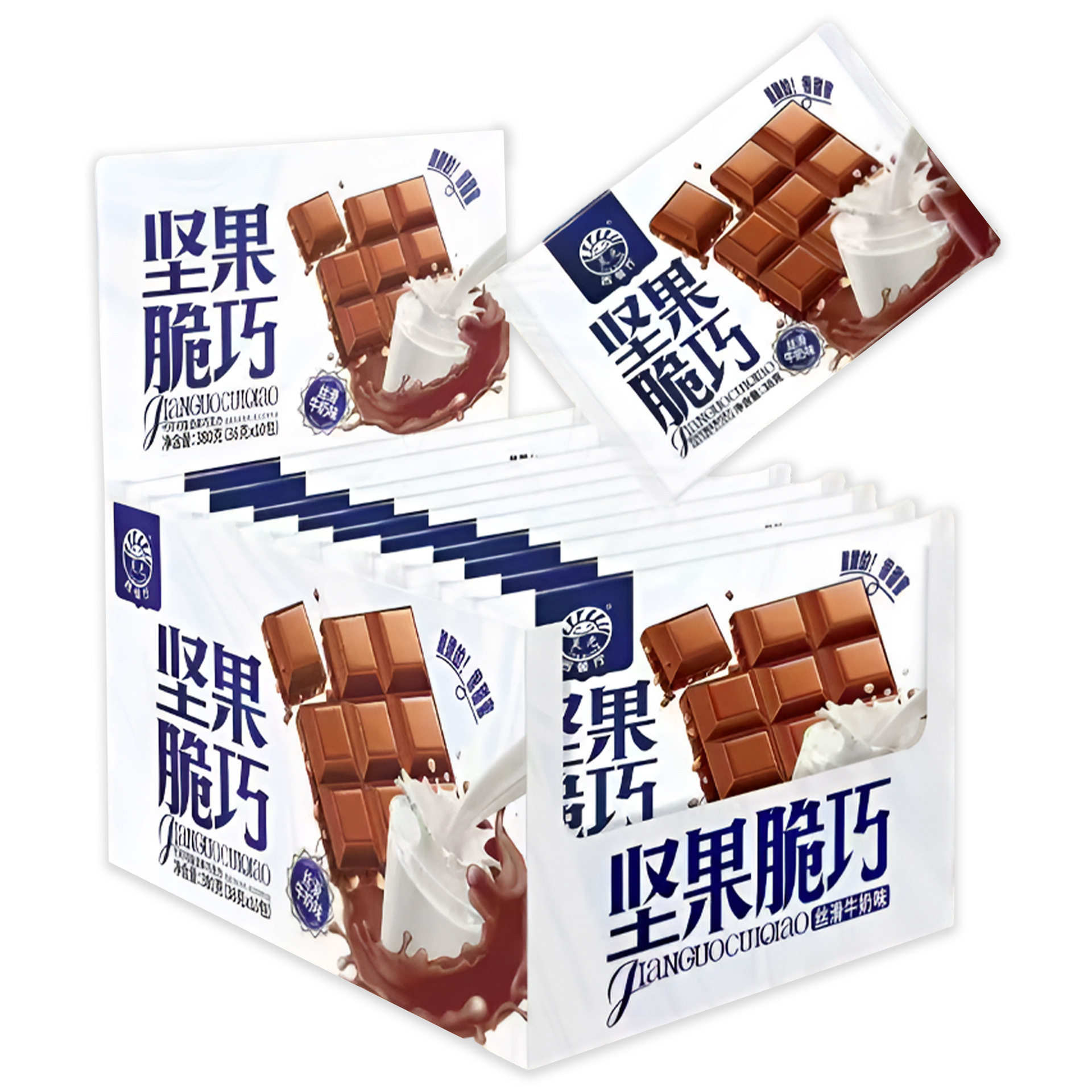 | Raw materials and ingredients | White sugar, cocoa butter substitute, whey powder, cocoa powder, skimmed milk powder, whole milk powder, crispy rice, crushed peanuts, crushed walnuts, crushed hazelnuts, phospholipid food flavors and fragrances |