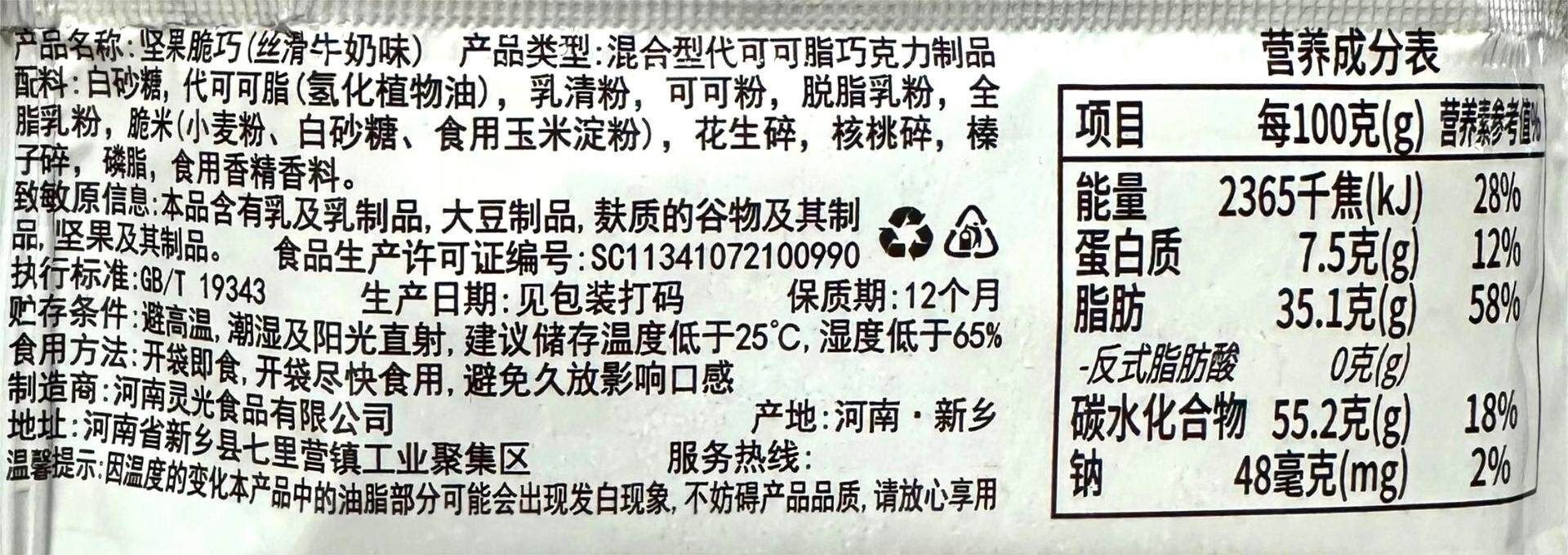 | Packaging specifications | Lingguang nut crisp milk flavor 38g,Lingguang nut crisp dark chocolate flavor 38g |