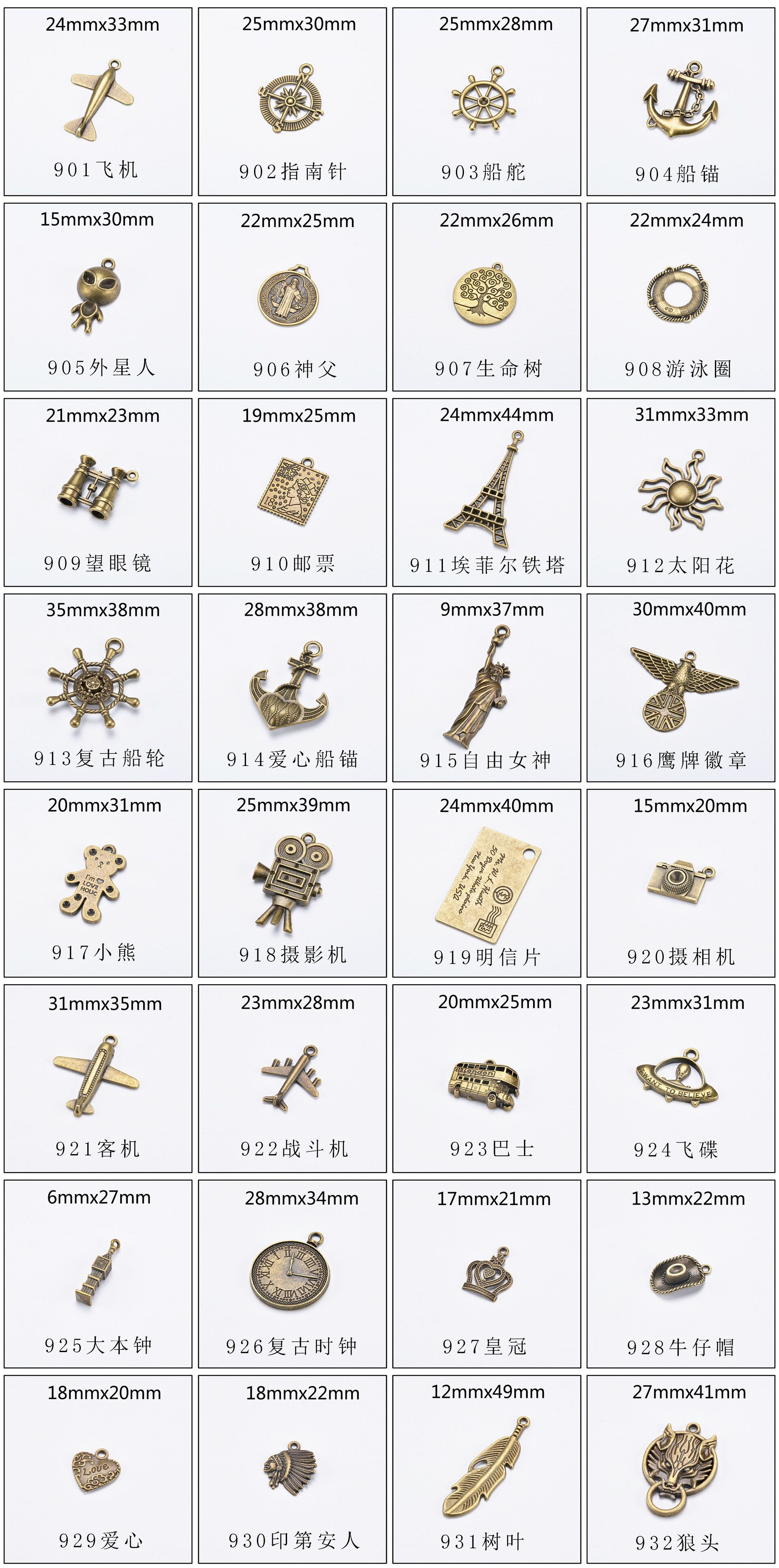 | Color | 901 aircraft,902 compass,903 rudder,904 anchor,905 alien,906 father,907 tree of life,908 swimming ring,909 telescope,910 stamp,911 eiffel tower,912 sunflower,913 vintage boat wheel,914 love anchor,915 statue of liberty,917 little bear,918 camera,919 envelope postcard,920 camera,921 passenger plane,922 fighter,Bus 923,924 flying saucer,925 big ben,926 vintage clock,927 crown,928 cowboy hat,929love,930 indians,931 leaves,932 wolf head,Single shot wax thread 40cm,One lobster clasp,916 eagle badge |