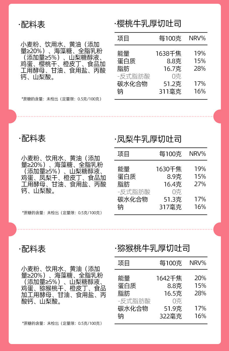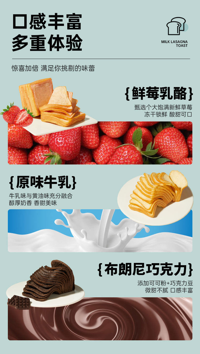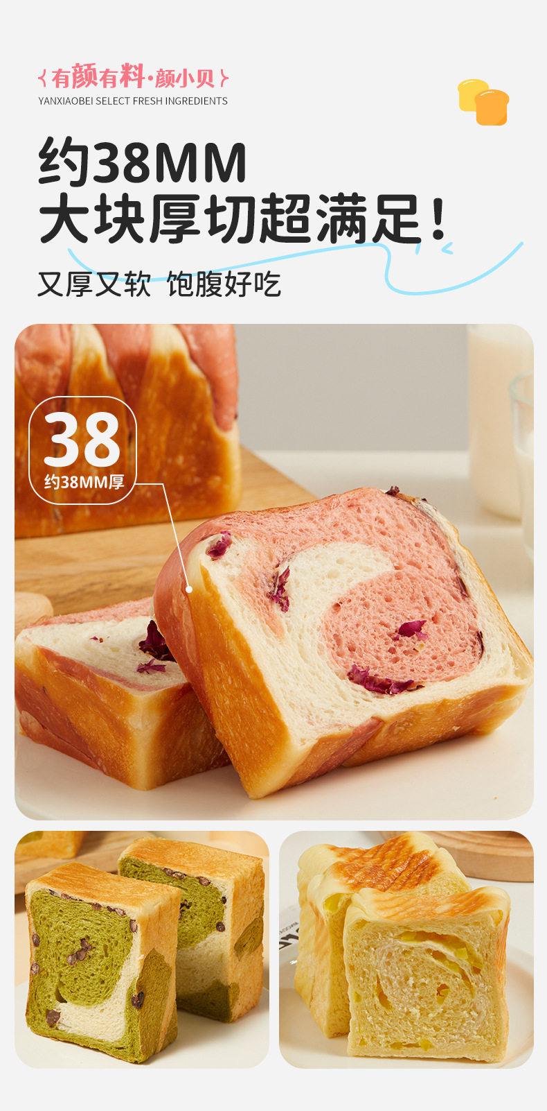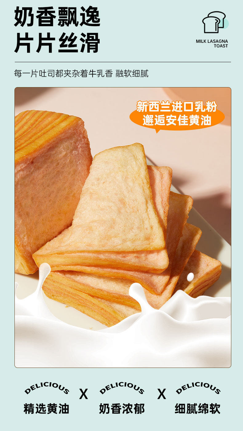 | Packaging specifications | 3 packs of 255g thousand-layer toast [cocoa brownie + fresh milk + fresh berry cheese],6 packs of thick-cut toast totaling 500g [mixed pack of 6 flavors],6 packs of thick-cut toast totaling 500g [original + tiramisu + cranberry] mixed,6 packs of thick-cut toast totaling 500g [pineapple cut + cherry cut + kiwi cut],6 packs of thick-cut toast totaling 500g [rose + milk puff blueberry + matcha red bean] mixed,6 packs of thick-cut toast totaling 500g [milk-flavored original flavor],6 packs of thick-cut toast totaling 500g [tiramisu],6 packs of thick-cut toast totaling 500g [cranberry],6 packs of thick-cut toast totaling 500g [pineapple fruit cut],6 packs of thick-cut toast totaling 500g [cherry fruit cut],6 packs of thick-cut toast totaling 500g [kiwi fruit cut],6 packs of thick-cut toast totaling 500g [milk rose],6 packs of thick-cut toast totaling 500g [sponge blueberry],6 packs of thick-cut toast totaling 500g [matcha red bean],12 packs of thick-cut toast totaling 1000g [mixed pack of 6 flavors],12 packs of thick-cut toast totaling 1000g [milk original flavor + tiramisu + cranberry] mixed,12 packs of 1000g thick-cut toast [pineapple cut + cherry cut + kiwi cut],12 packs of thick-cut toast totaling 1000g [rose + milk puff blueberry + matcha red bean] mixed,12 packs of thick-cut toast totaling 1000g [milk-flavored original flavor],12 packs of thick-cut toast totaling 1000g [tiramisu],12 packs of thick-cut toast totaling 1000g [cranberry],12 packs of thick-cut toast totaling 1000g [pineapple fruit cut],12 packs of thick-cut toast totaling 1000g [cherry fruit cut],12 packs of thick-cut toast totaling 1000g [kiwi fruit cut],12 packs of thick-cut toast totaling 1000g [milk rose],12 packs of thick-cut toast totaling 1000g [milk puff blueberry],12 packs of thick-cut toast totaling 1000g [matcha red bean],6 packs of 500g thousand-layer toast [cocoa brownie + fresh milk + fresh berry cheese] mixed,6 packs of 500g thousand layer toast [milk flavor],6 packs of 500g thousand layer toast [fresh berry cheese],6 packs of 500g thousand layer toast [cocoa brownie],12 packs of 1000g thousand-layer toast [cocoa brownie + fresh milk + fresh berry cheese],12 packs of 1000g thousand layer toast [milk flavor],12 packs of 1000g thousand layer toast [fresh berry cheese],12 packs of 1000g thousand layer toast [cocoa brownie] |