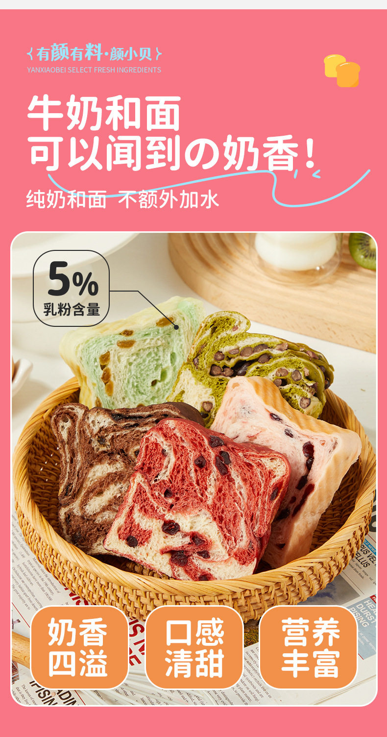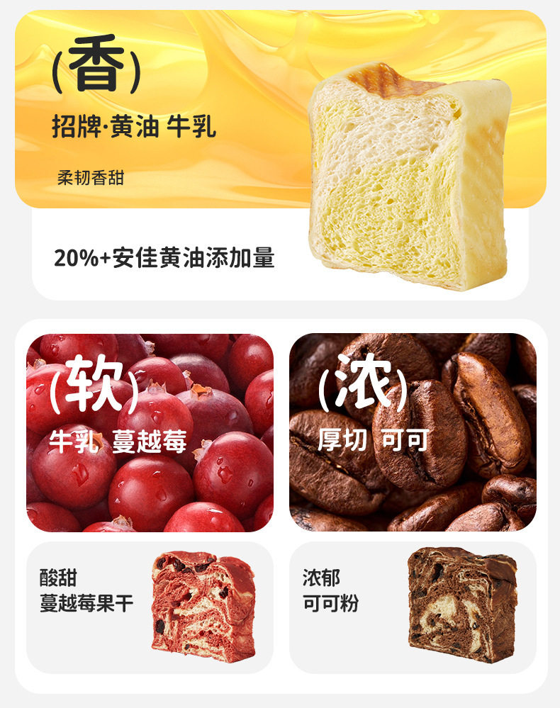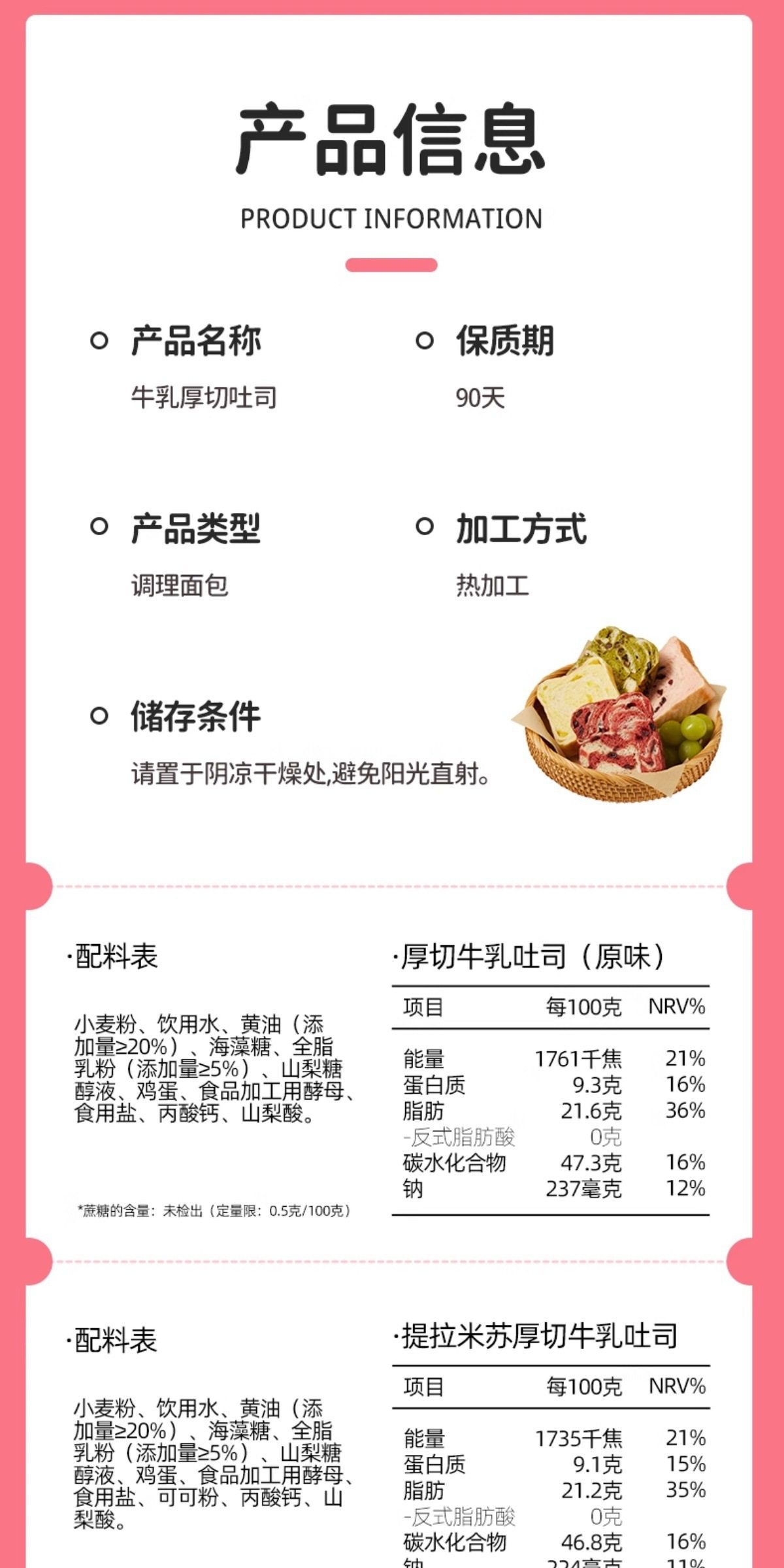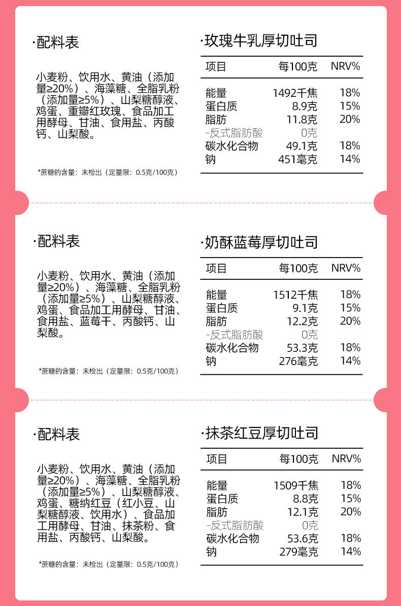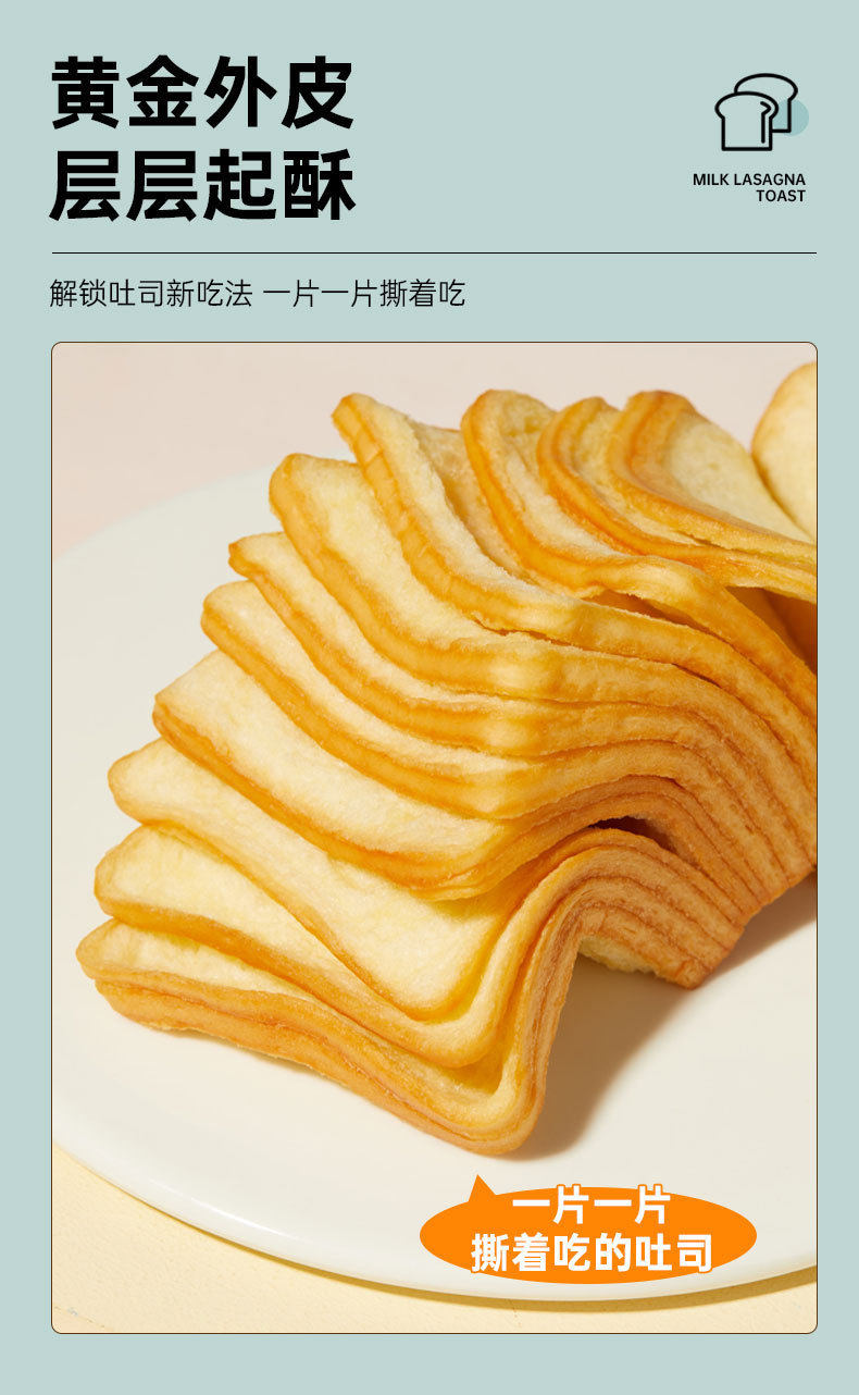 | Packaging specifications | 3 packs of 255g thousand-layer toast [cocoa brownie + fresh milk + fresh berry cheese],6 packs of thick-cut toast totaling 500g [mixed pack of 6 flavors],6 packs of thick-cut toast totaling 500g [original + tiramisu + cranberry] mixed,6 packs of thick-cut toast totaling 500g [pineapple cut + cherry cut + kiwi cut],6 packs of thick-cut toast totaling 500g [rose + milk puff blueberry + matcha red bean] mixed,6 packs of thick-cut toast totaling 500g [milk-flavored original flavor],6 packs of thick-cut toast totaling 500g [tiramisu],6 packs of thick-cut toast totaling 500g [cranberry],6 packs of thick-cut toast totaling 500g [pineapple fruit cut],6 packs of thick-cut toast totaling 500g [cherry fruit cut],6 packs of thick-cut toast totaling 500g [kiwi fruit cut],6 packs of thick-cut toast totaling 500g [milk rose],6 packs of thick-cut toast totaling 500g [sponge blueberry],6 packs of thick-cut toast totaling 500g [matcha red bean],12 packs of thick-cut toast totaling 1000g [mixed pack of 6 flavors],12 packs of thick-cut toast totaling 1000g [milk original flavor + tiramisu + cranberry] mixed,12 packs of 1000g thick-cut toast [pineapple cut + cherry cut + kiwi cut],12 packs of thick-cut toast totaling 1000g [rose + milk puff blueberry + matcha red bean] mixed,12 packs of thick-cut toast totaling 1000g [milk-flavored original flavor],12 packs of thick-cut toast totaling 1000g [tiramisu],12 packs of thick-cut toast totaling 1000g [cranberry],12 packs of thick-cut toast totaling 1000g [pineapple fruit cut],12 packs of thick-cut toast totaling 1000g [cherry fruit cut],12 packs of thick-cut toast totaling 1000g [kiwi fruit cut],12 packs of thick-cut toast totaling 1000g [milk rose],12 packs of thick-cut toast totaling 1000g [milk puff blueberry],12 packs of thick-cut toast totaling 1000g [matcha red bean],6 packs of 500g thousand-layer toast [cocoa brownie + fresh milk + fresh berry cheese] mixed,6 packs of 500g thousand layer toast [milk flavor],6 packs of 500g thousand layer toast [fresh berry cheese],6 packs of 500g thousand layer toast [cocoa brownie],12 packs of 1000g thousand-layer toast [cocoa brownie + fresh milk + fresh berry cheese],12 packs of 1000g thousand layer toast [milk flavor],12 packs of 1000g thousand layer toast [fresh berry cheese],12 packs of 1000g thousand layer toast [cocoa brownie] |