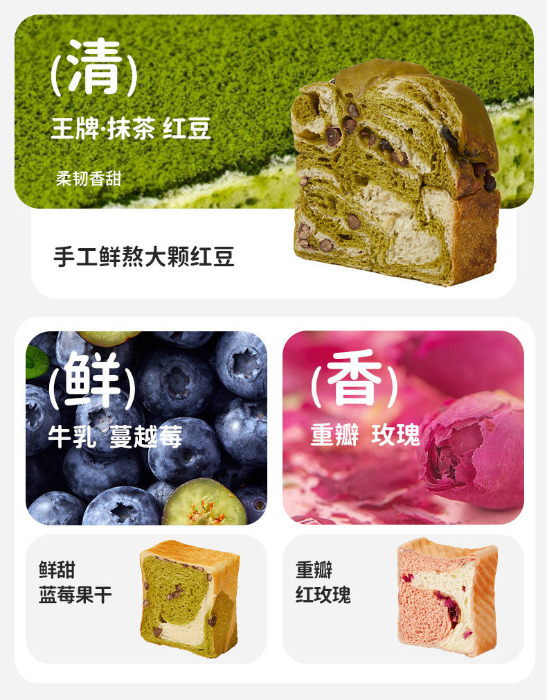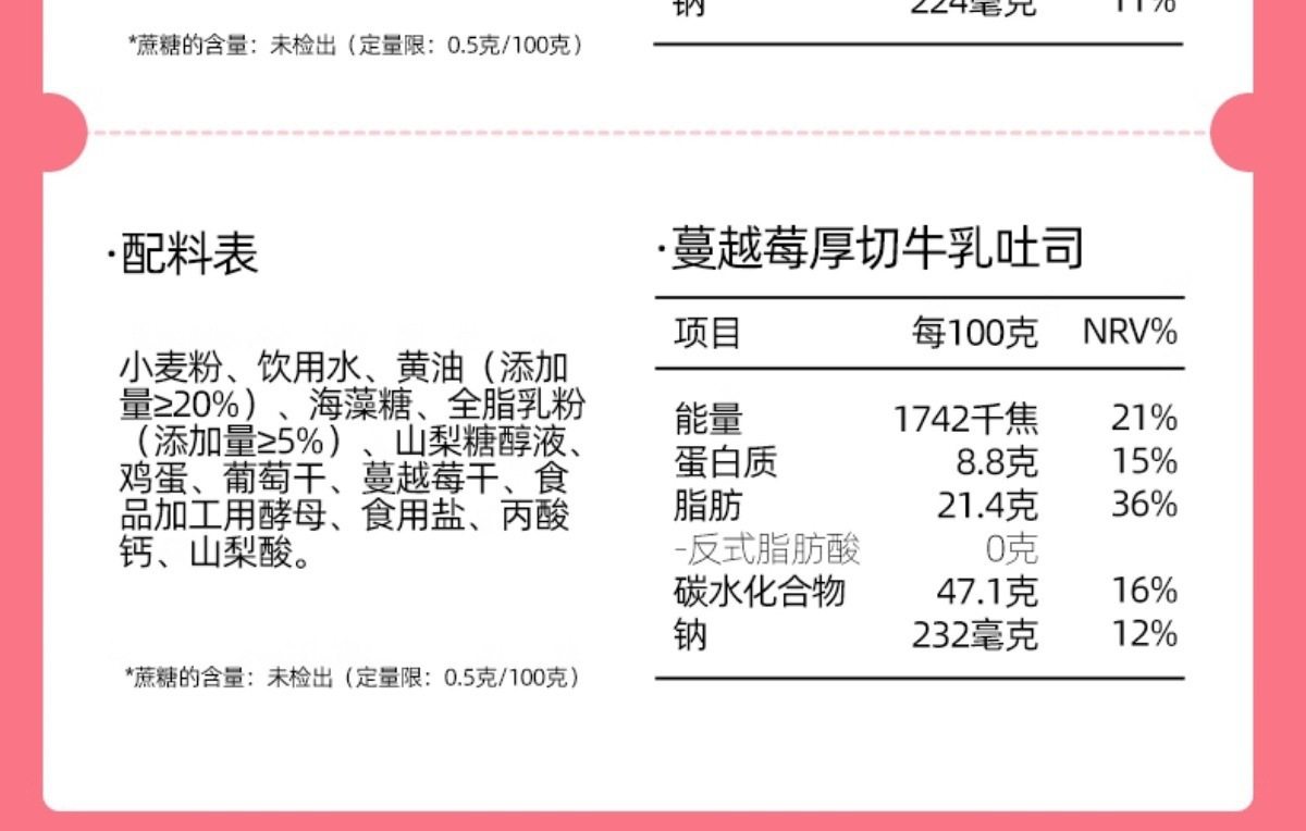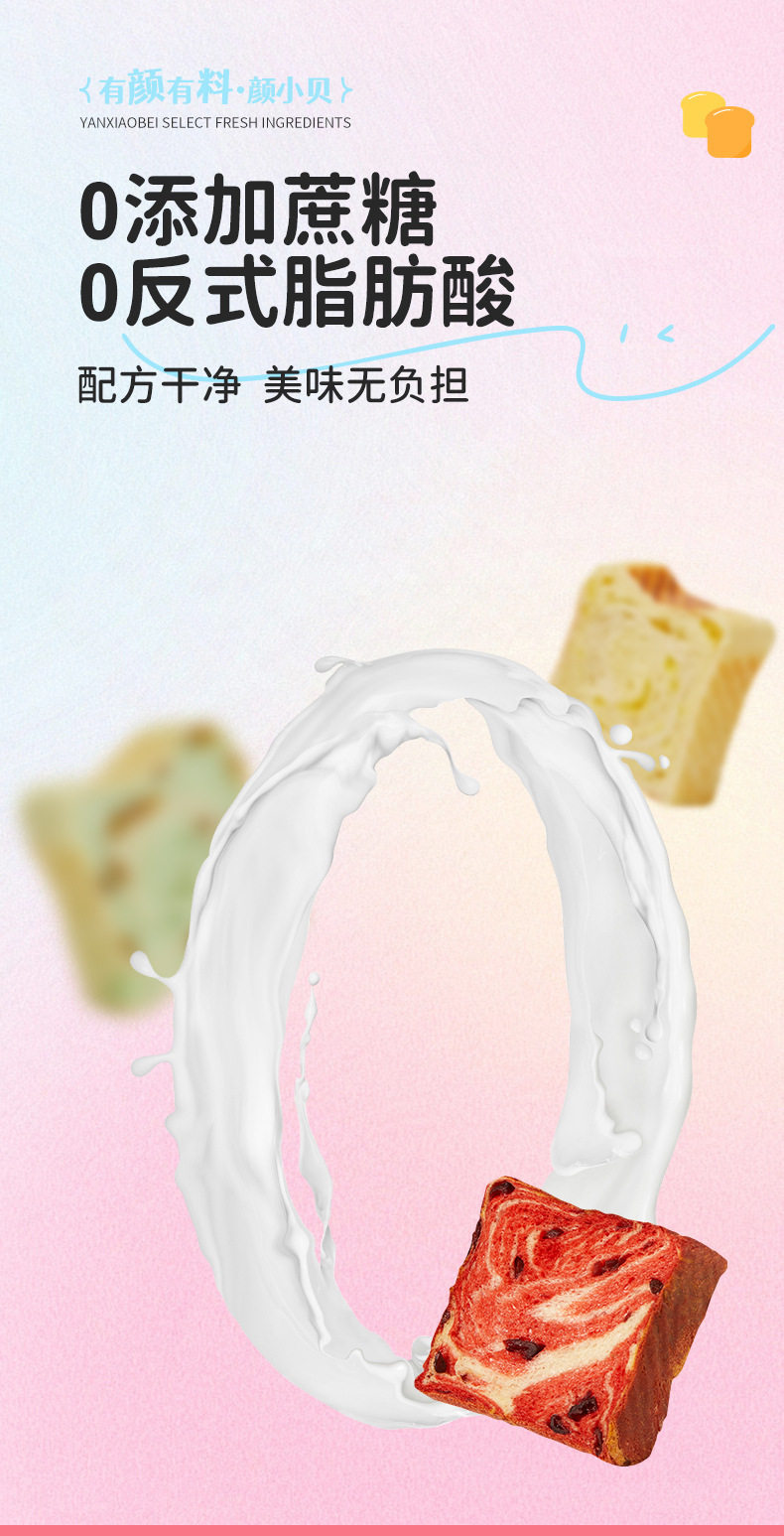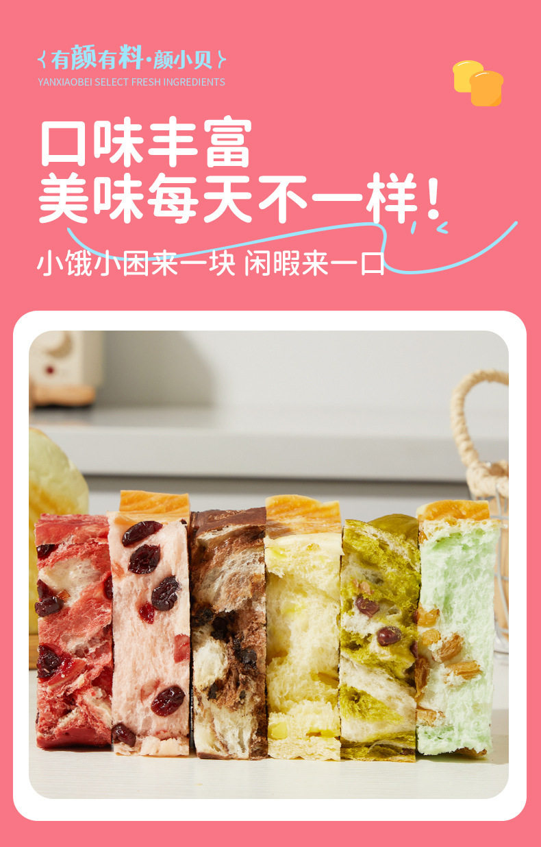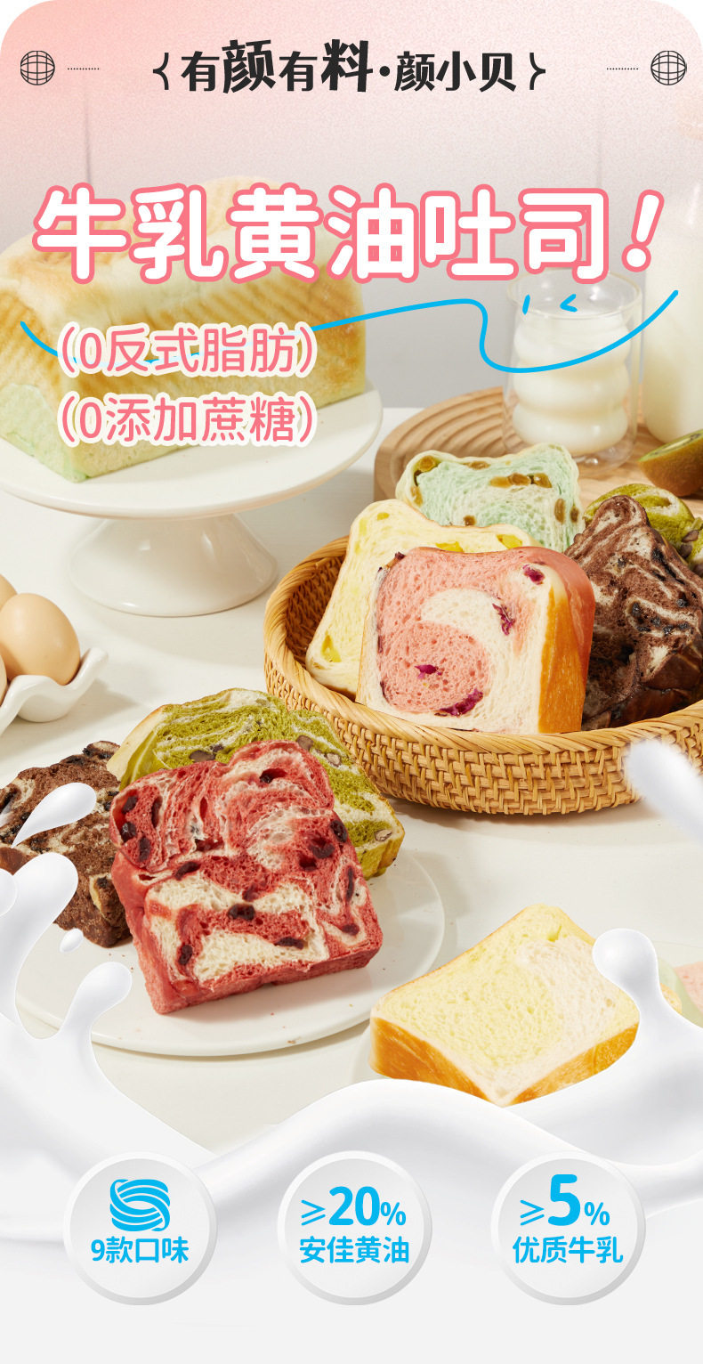 | Packaging specifications | 3 packs of 255g thousand-layer toast [cocoa brownie + fresh milk + fresh berry cheese],6 packs of thick-cut toast totaling 500g [mixed pack of 6 flavors],6 packs of thick-cut toast totaling 500g [original + tiramisu + cranberry] mixed,6 packs of thick-cut toast totaling 500g [pineapple cut + cherry cut + kiwi cut],6 packs of thick-cut toast totaling 500g [rose + milk puff blueberry + matcha red bean] mixed,6 packs of thick-cut toast totaling 500g [milk-flavored original flavor],6 packs of thick-cut toast totaling 500g [tiramisu],6 packs of thick-cut toast totaling 500g [cranberry],6 packs of thick-cut toast totaling 500g [pineapple fruit cut],6 packs of thick-cut toast totaling 500g [cherry fruit cut],6 packs of thick-cut toast totaling 500g [kiwi fruit cut],6 packs of thick-cut toast totaling 500g [milk rose],6 packs of thick-cut toast totaling 500g [sponge blueberry],6 packs of thick-cut toast totaling 500g [matcha red bean],12 packs of thick-cut toast totaling 1000g [mixed pack of 6 flavors],12 packs of thick-cut toast totaling 1000g [milk original flavor + tiramisu + cranberry] mixed,12 packs of 1000g thick-cut toast [pineapple cut + cherry cut + kiwi cut],12 packs of thick-cut toast totaling 1000g [rose + milk puff blueberry + matcha red bean] mixed,12 packs of thick-cut toast totaling 1000g [milk-flavored original flavor],12 packs of thick-cut toast totaling 1000g [tiramisu],12 packs of thick-cut toast totaling 1000g [cranberry],12 packs of thick-cut toast totaling 1000g [pineapple fruit cut],12 packs of thick-cut toast totaling 1000g [cherry fruit cut],12 packs of thick-cut toast totaling 1000g [kiwi fruit cut],12 packs of thick-cut toast totaling 1000g [milk rose],12 packs of thick-cut toast totaling 1000g [milk puff blueberry],12 packs of thick-cut toast totaling 1000g [matcha red bean],6 packs of 500g thousand-layer toast [cocoa brownie + fresh milk + fresh berry cheese] mixed,6 packs of 500g thousand layer toast [milk flavor],6 packs of 500g thousand layer toast [fresh berry cheese],6 packs of 500g thousand layer toast [cocoa brownie],12 packs of 1000g thousand-layer toast [cocoa brownie + fresh milk + fresh berry cheese],12 packs of 1000g thousand layer toast [milk flavor],12 packs of 1000g thousand layer toast [fresh berry cheese],12 packs of 1000g thousand layer toast [cocoa brownie] |