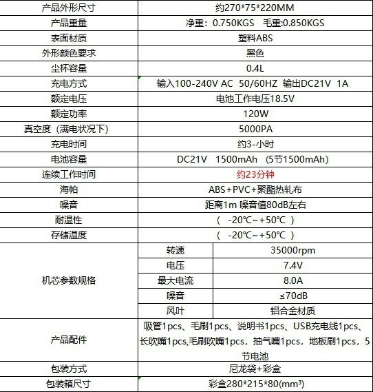 | Color classification | Blowing and suction integrated - five batteries - vacuum cleaner + small floor brush,Five batteries |