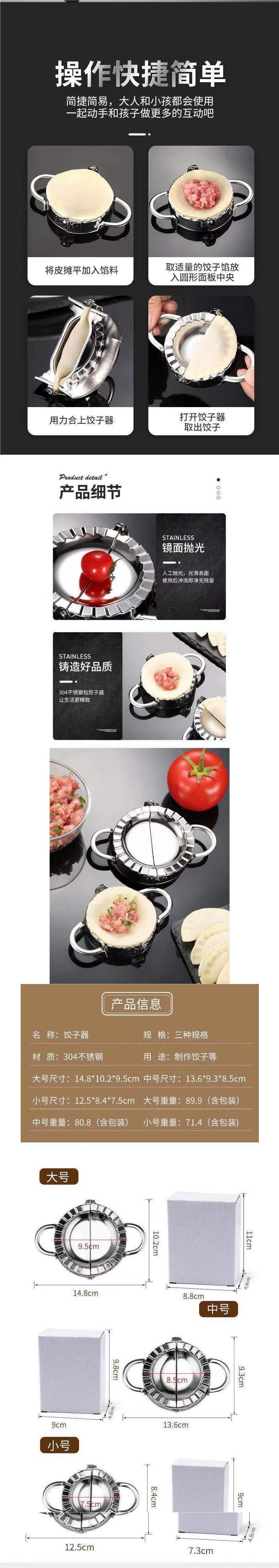 | Specifications | 304 stainless steel dumpling maker [small size thickened],304 stainless steel dumpling maker [medium thickened],304 stainless steel dumpling maker [large size thickened] |