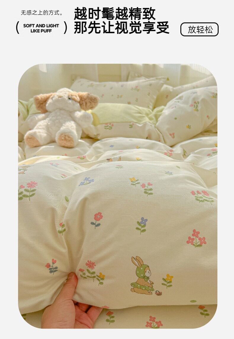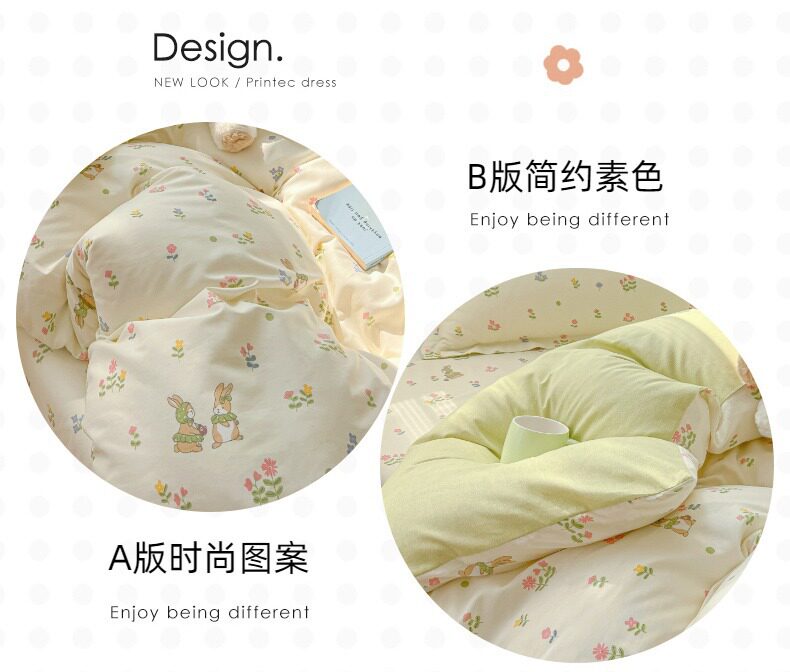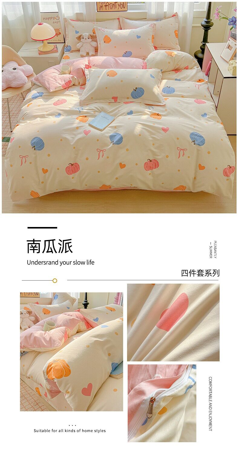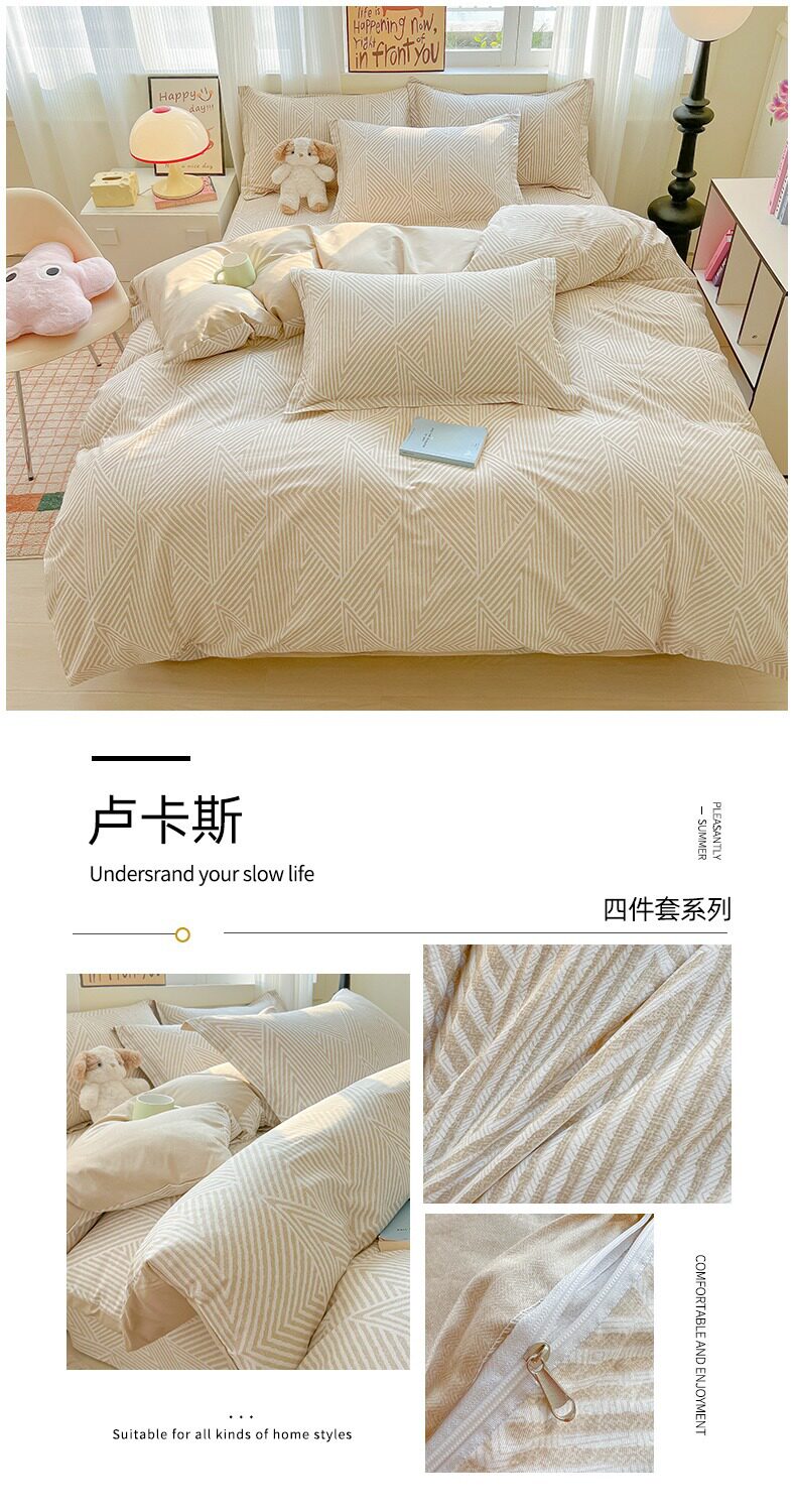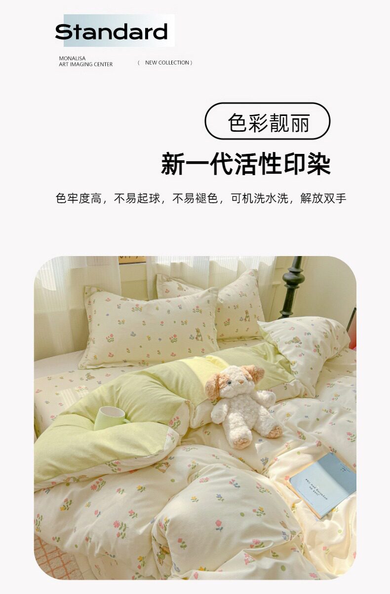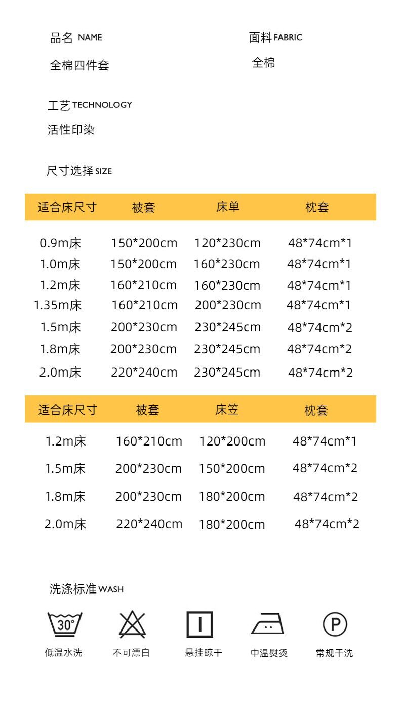 | Size specifications | 0.9m bed sheet three-piece set (quilt cover 1.5x2.0 bed sheet 1.2 pillowcase),1.0m bed sheet three-piece set (quilt cover 1.5x2.0 bed sheet 1.6 pillowcase),1.2m bed sheet three-piece set (quilt cover 1.6x2.1 bed sheet 1.6 pillowcase),1.35-sheet three-piece set (duvet cover 1.6x2.1 sheets 2.0 pillowcases),1.5m bed sheet four-piece set (quilt cover 2.0x2.3 sheets 2.3 pillowcases pair),1.8m bed sheet four-piece set (quilt cover 2.0x2.3 sheets 2.3 pillowcases pair),2.0m bed sheet four-piece set (quilt cover 2.2x2.4 sheets 2.3 pillowcases pair) |