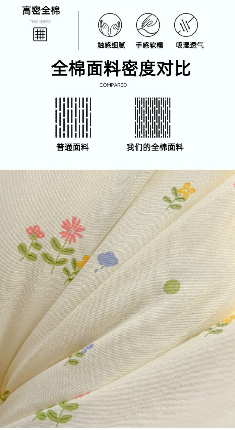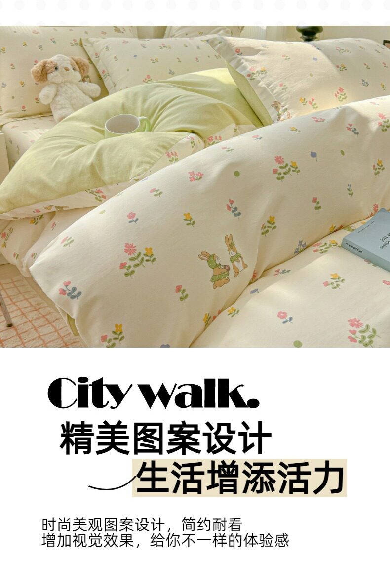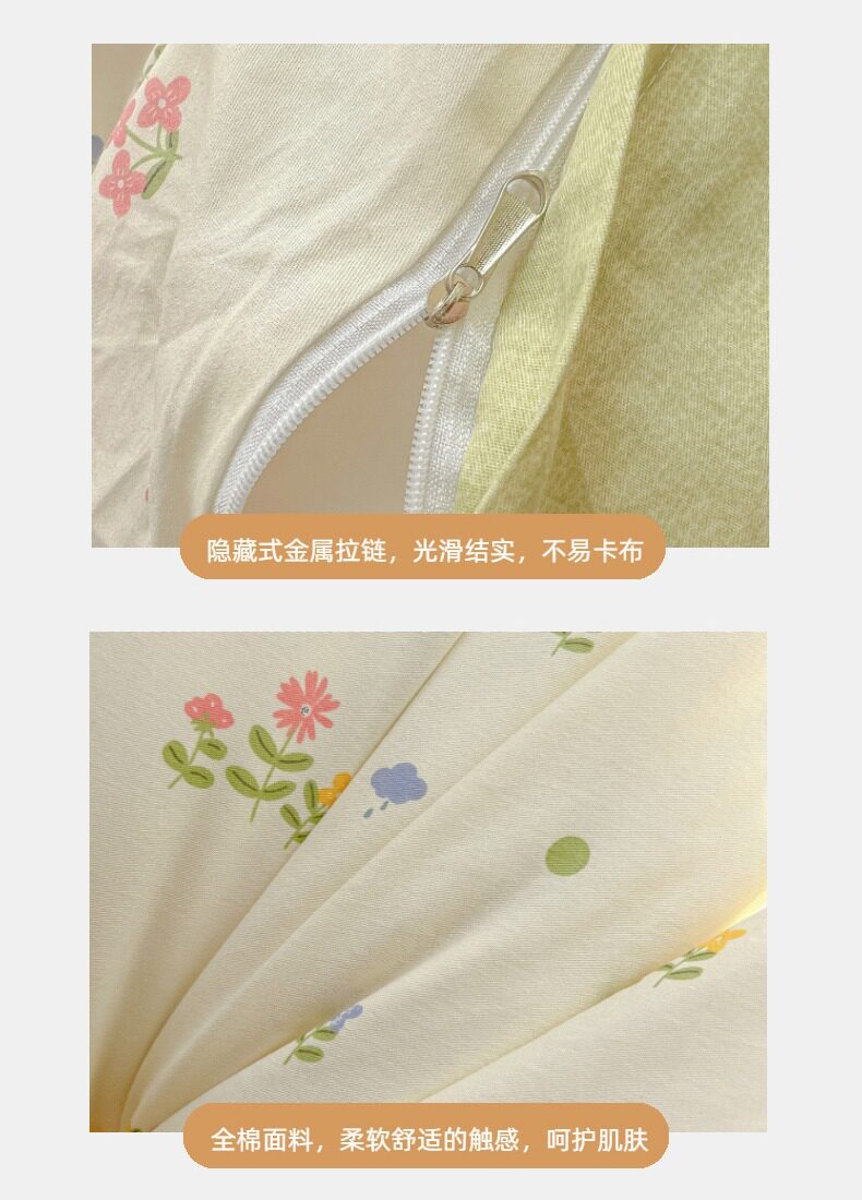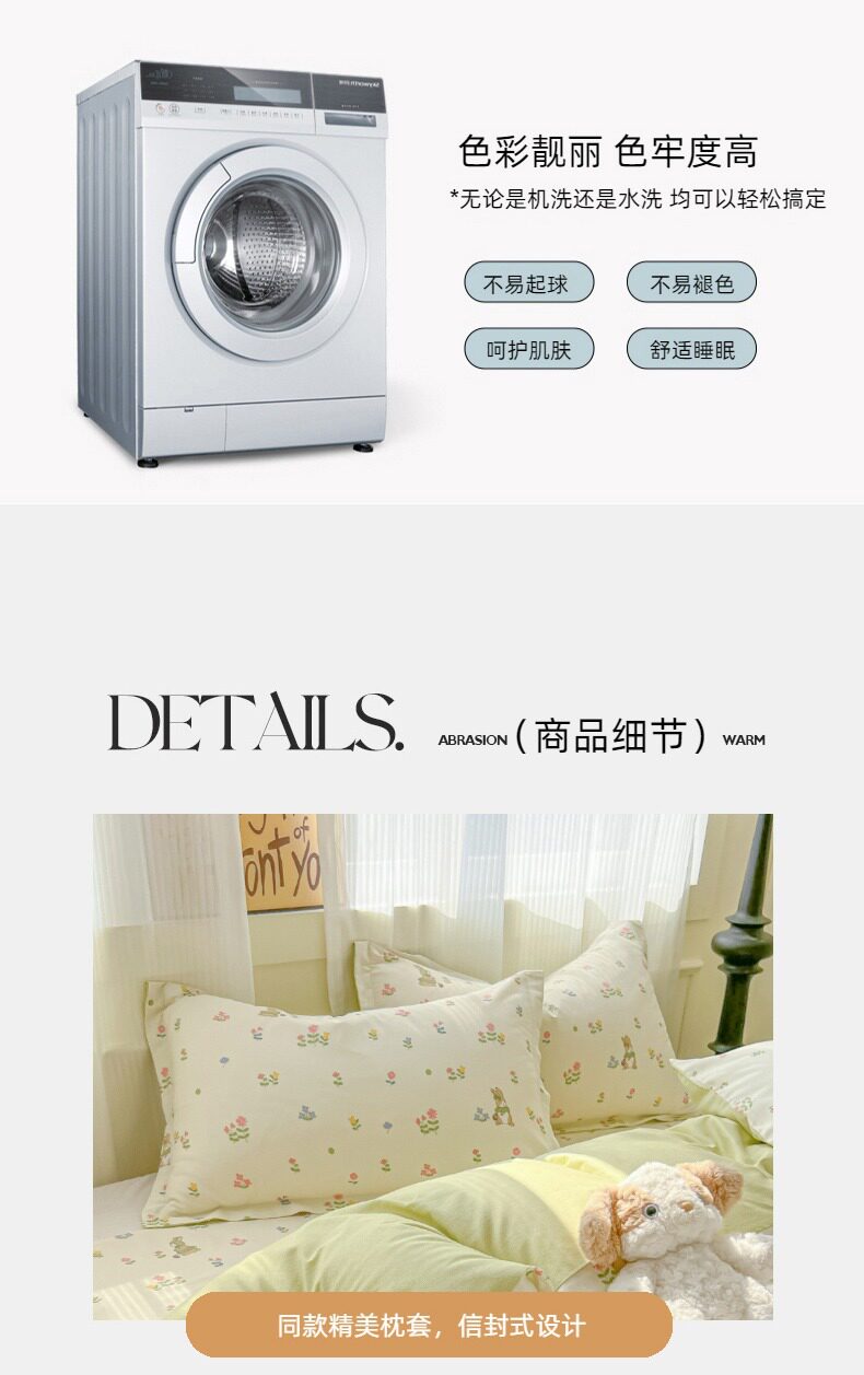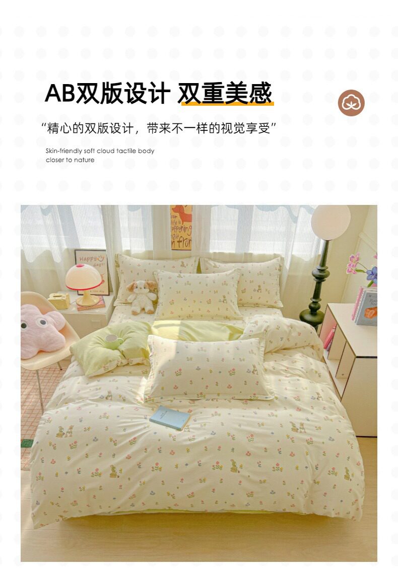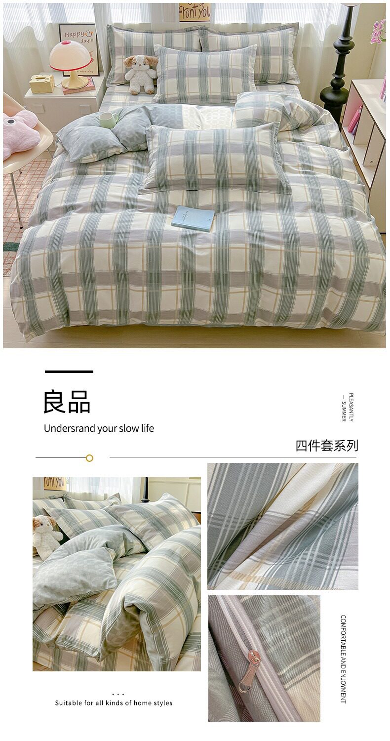 | Size specifications | 0.9m bed sheet three-piece set (quilt cover 1.5x2.0 bed sheet 1.2 pillowcase),1.0m bed sheet three-piece set (quilt cover 1.5x2.0 bed sheet 1.6 pillowcase),1.2m bed sheet three-piece set (quilt cover 1.6x2.1 bed sheet 1.6 pillowcase),1.35-sheet three-piece set (duvet cover 1.6x2.1 sheets 2.0 pillowcases),1.5m bed sheet four-piece set (quilt cover 2.0x2.3 sheets 2.3 pillowcases pair),1.8m bed sheet four-piece set (quilt cover 2.0x2.3 sheets 2.3 pillowcases pair),2.0m bed sheet four-piece set (quilt cover 2.2x2.4 sheets 2.3 pillowcases pair) |