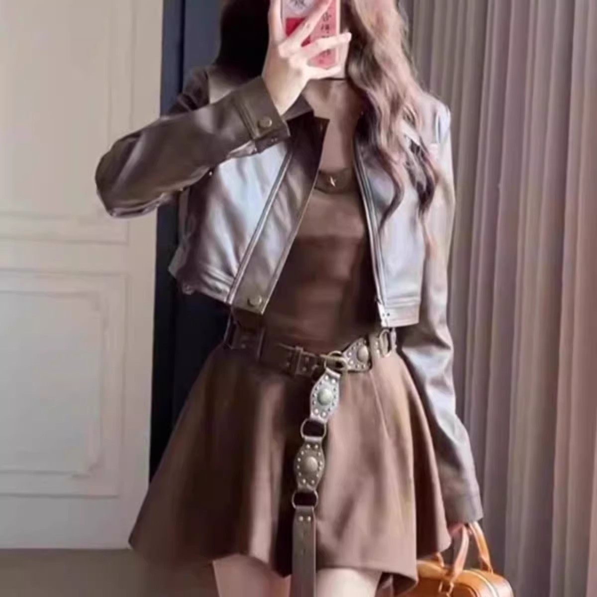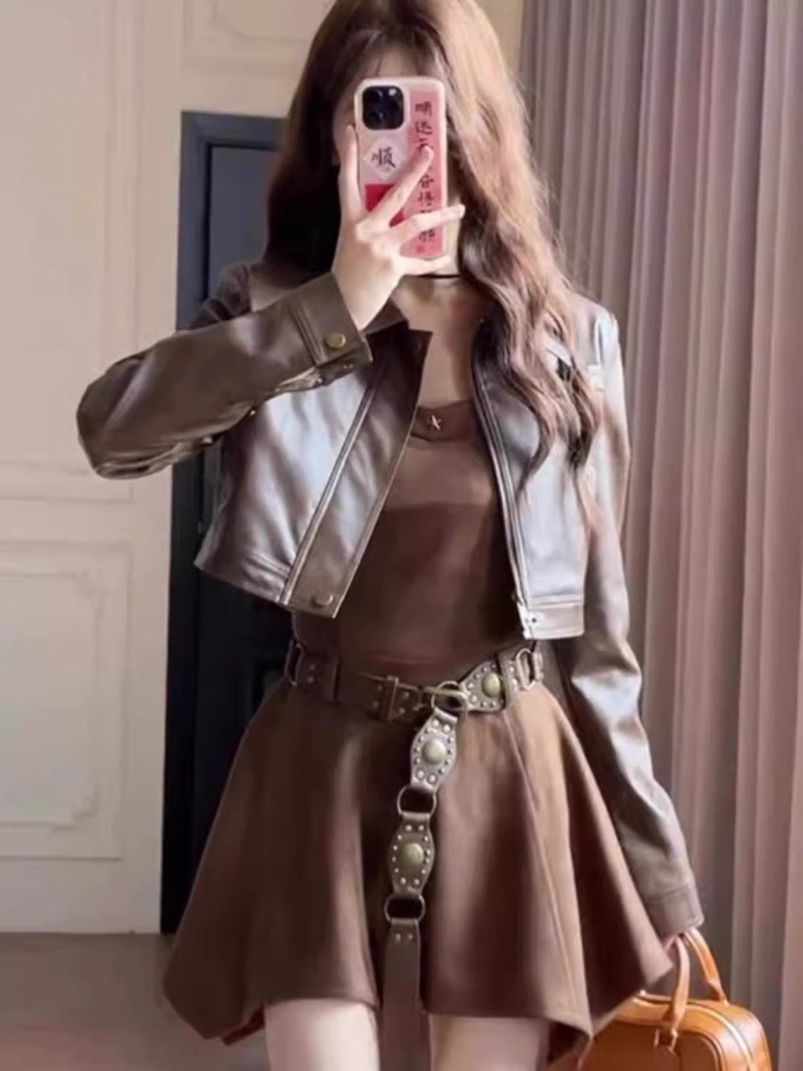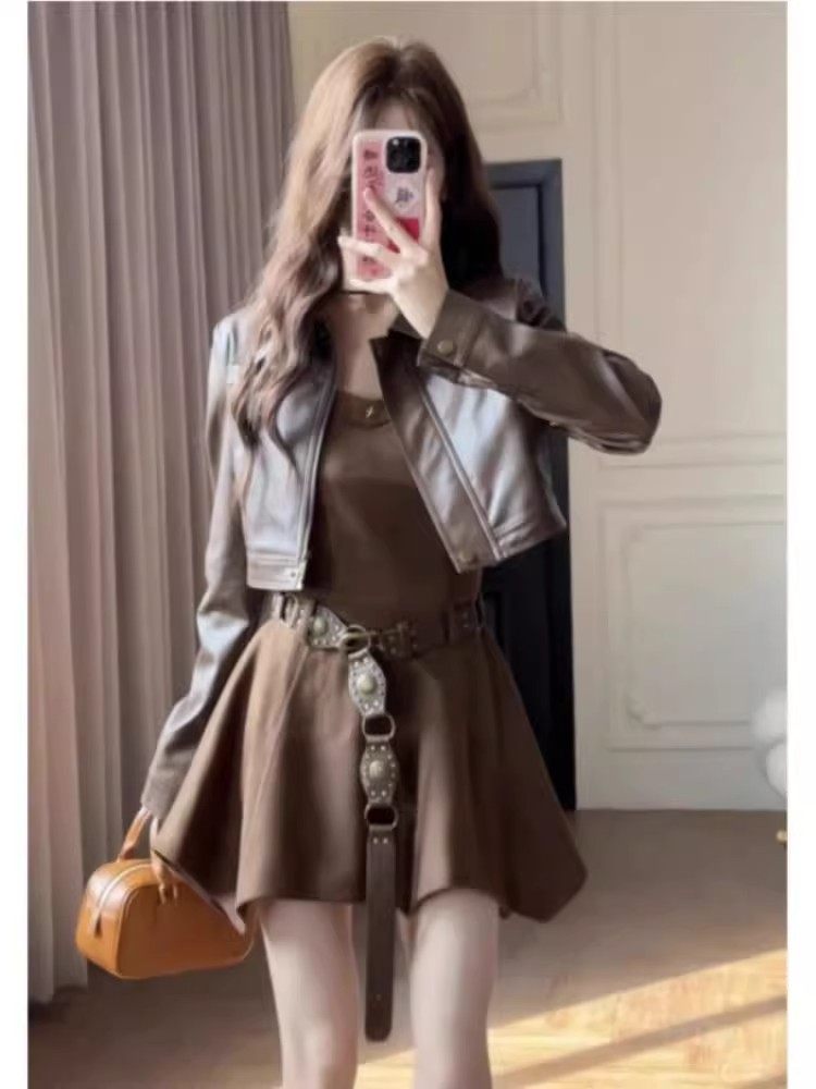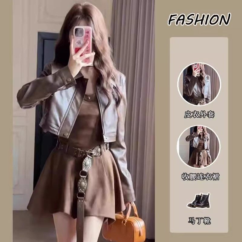 Suit for Women 2025 Spring and Autum Korean Sexy Short Jacket Leather Jacket Waist Suspender Dress Two-Piece Set