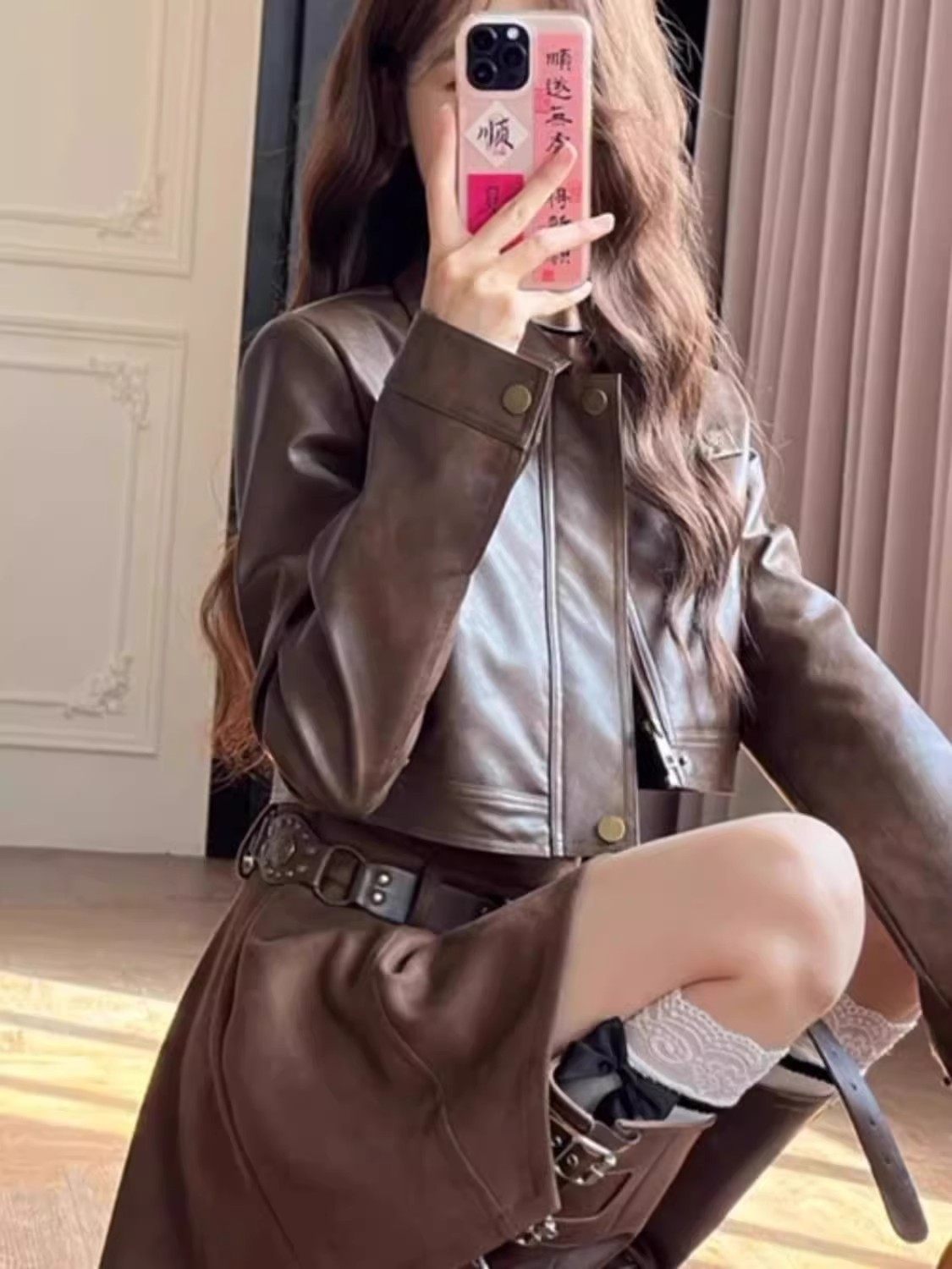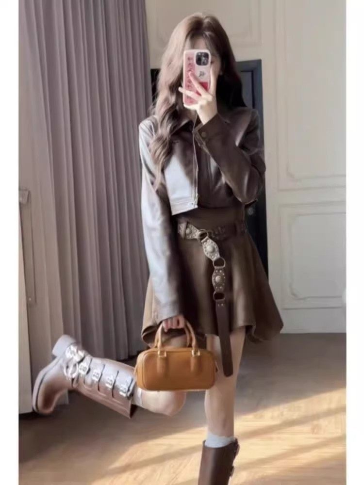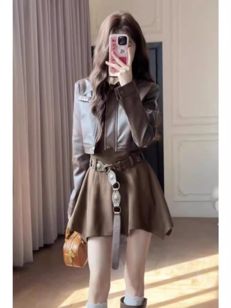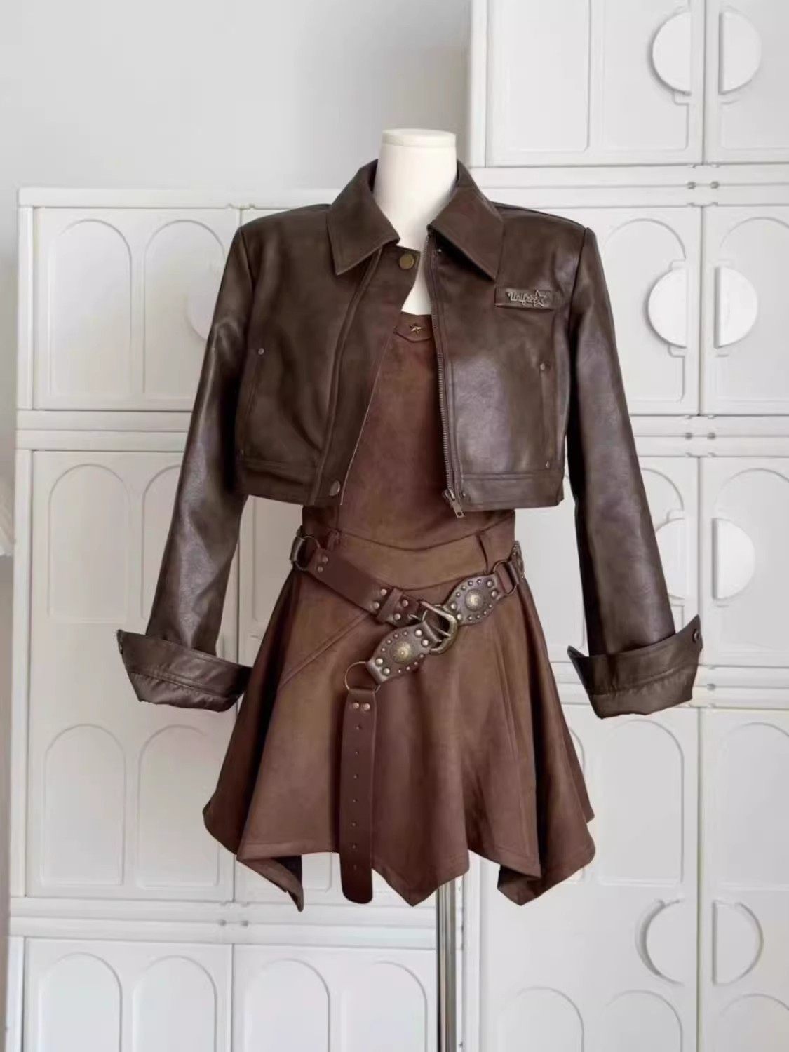 Suit for Women 2025 Spring and Autum Korean Sexy Short Jacket Leather Jacket Waist Suspender Dress Two-Piece Set