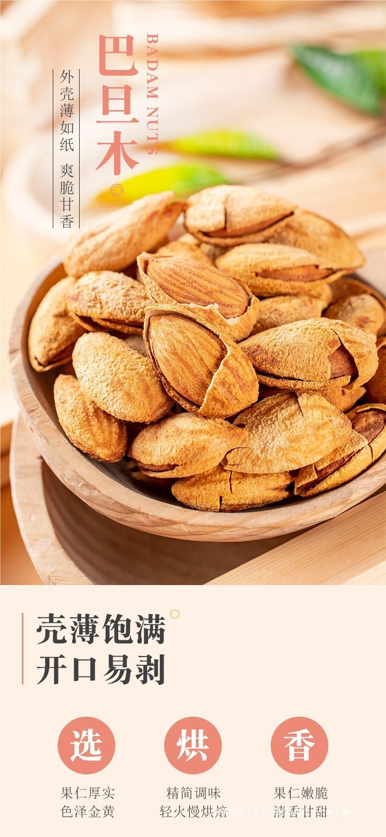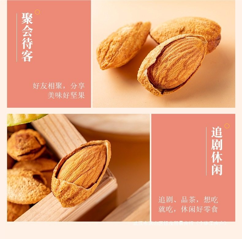 | Packaging specifications | Grab: impulse] 2 cans of almonds, totaling 500g (will be removed from the shelves after grabbing),[almond] half a catty in a bag: 250g*1 bag,[thin-skinned and easy to peel] 250g*1 bag (net weight half a catty),【almond】bag 0.5kg : 250g*2 bags,[thin-skinned and easy to peel] 250g*2 bags (net weight 0.5kg ),【almond】bag 1.0kg : 250g*4 bags,[thin-skinned and easy to peel] 250g*4 bags (net weight 1.0kg ),Canned】2 cans totaling 500g (canned) net weight 300g,Canned】4 cans totaling 1000g (canned) net weight 600g,50g almond wood (small bag) |