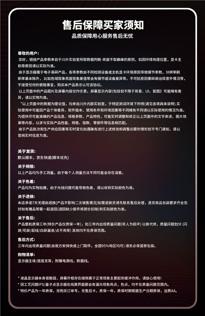 | Size | Cs24f【 24inch direct face 1k+180hz+fastips】-package 1,[chuansheng limited time 2-day event] collect and purchase, consult customer service and place an order. choose one of four free - package 1,Difficult after-sales service for large items - national door-to-door/quality package return/compensation, choose one of three - package 1,——————chuansheng special series——————-package 1,Cs385f【34inch curved surface 4k+165hz+1500r】limited time special offer-package 1,Cs3551【34inch curved surface 4k+nanoips+80hz】limited time special offer-package 1,Cs3555【34inch curved surface 4k+nanoips+144hz】limited time special offer-package 1,N270【27inch face 2k+180hz】high color gamut limited time special offer-package 1,Cs3225【 32inch face 2k+180hz】 limited time special offer-package 1,——————chuansheng 27inch series——————-package 1,Cs274k-27-inch 4k60hz-ips screen (design drawing/office)-package 1,Cs27 [27-inch 2k-144hz direct-facing 16:9 black-ips] extreme color/apple color/eye protection screen new product-set,N270【 27inch direct face 2k+fastips+180hz+gtg1ms】high color gamut fps game screen-package 1,N270【27inch directly face 2k+fastips+180hz+qled backlight screen】fps game eye protection screen-package 1,N270【27inch direct face+2k+180hz+nanoips】high color gamut-package 1,N270 【 27inch direct face+2k+180hz+nanoips】qled quantum dot-package 1,N270【27inch direct face+2k+190hz+fast-ips】high color gamut-package 1,N270 [ 27inch direct face+2k+190hz+qled screen] backlight quantum dot eye protection-package 1,Cs27x【 27inch directly face 2k+fastips+240hz+quantum dot+gtg1ms】-package 1,——————chuansheng 32inch series——————-package 1,Cs32q【 32inch face 2k+nanoips+180hz+hdr400】-package 1,Cs32x【32inch face-to-face 4k+fastips+144hz+hdr400】pre-sale-package 1,Cs3225【 32inch direct face 2k+fastips+180hz+hdr400】-package 1,——————chuansheng 34inch series——————-package 1,Cs385f【34inch curved surface 4k+144hz】10bit e-sports hot model-package 1,Cs385f【34inch curved surface 4k+165hz】piano paint-package 1,Cs3555【34inch curved 4k+nanoips+125hz+hdr400】-package 1,Cs3555【34inch curved 4k+nanoips+144hz+hdr400】-package 1,——————chuan sheng 24inch series——————-package 1,Cs24f【 24inch direct face 1k+200hz+fastips】-package 1,Cs25a【24inch face 1k+300hz】backlight quantum dot-package 1,Cs25a【24inch direct face 1k+300hz】high color gamut-package 1 |