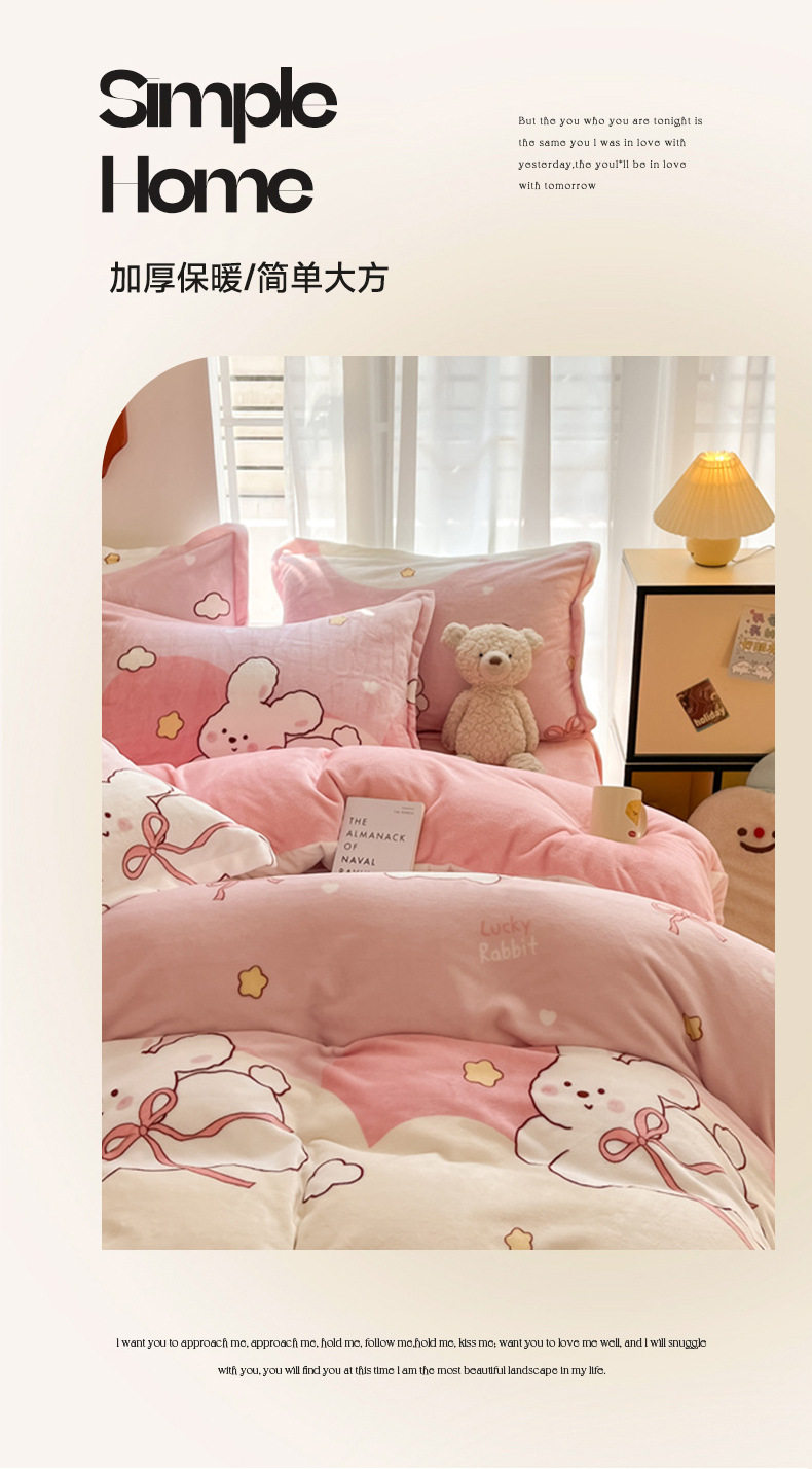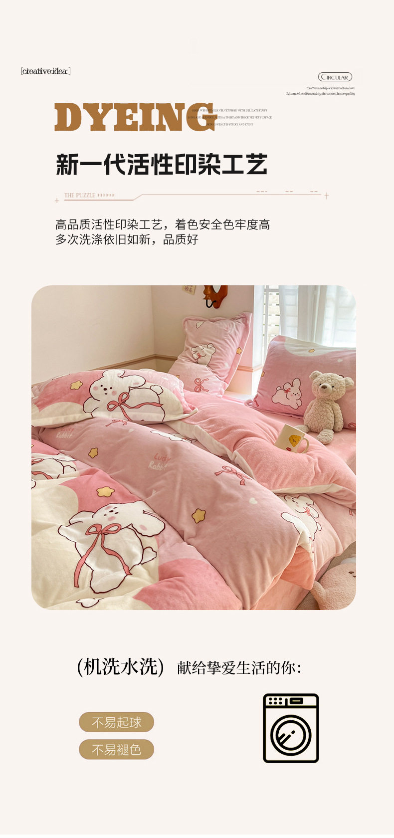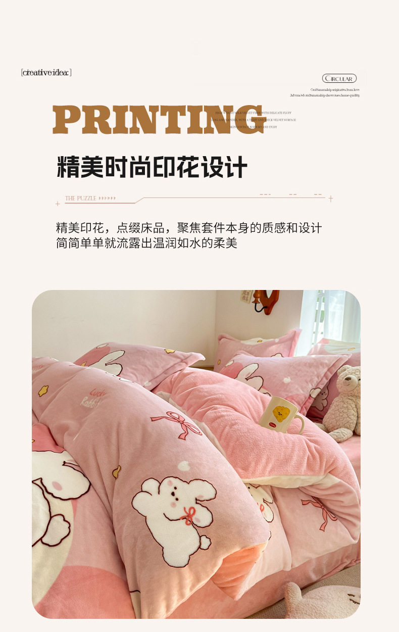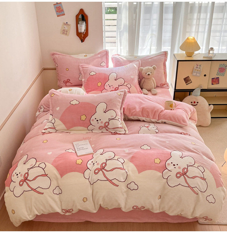 Winter Milk Velvet Four-Piece Dormitory Three-Piece Set, Warm and Thick Double-Sided Coral Fleece Printed Cute Duvet Cover and Sheet