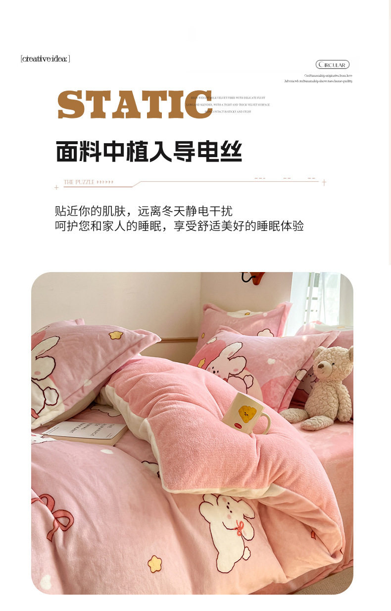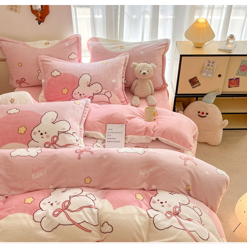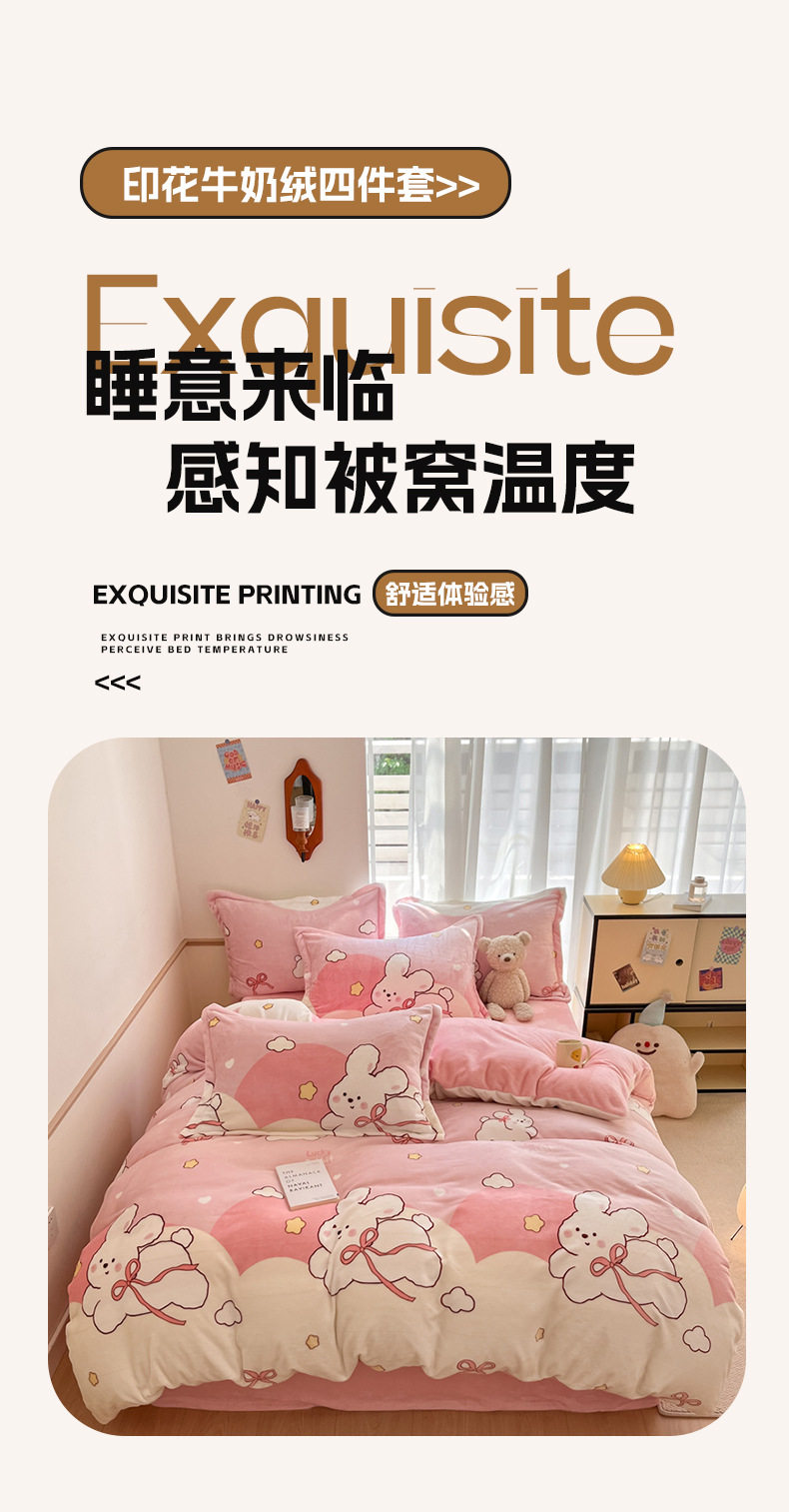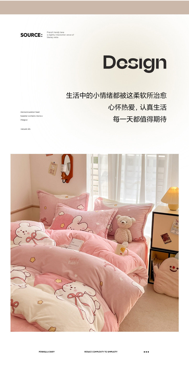 Winter Milk Velvet Four-Piece Dormitory Three-Piece Set, Warm and Thick Double-Sided Coral Fleece Printed Cute Duvet Cover and Sheet