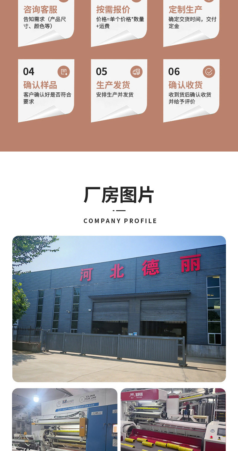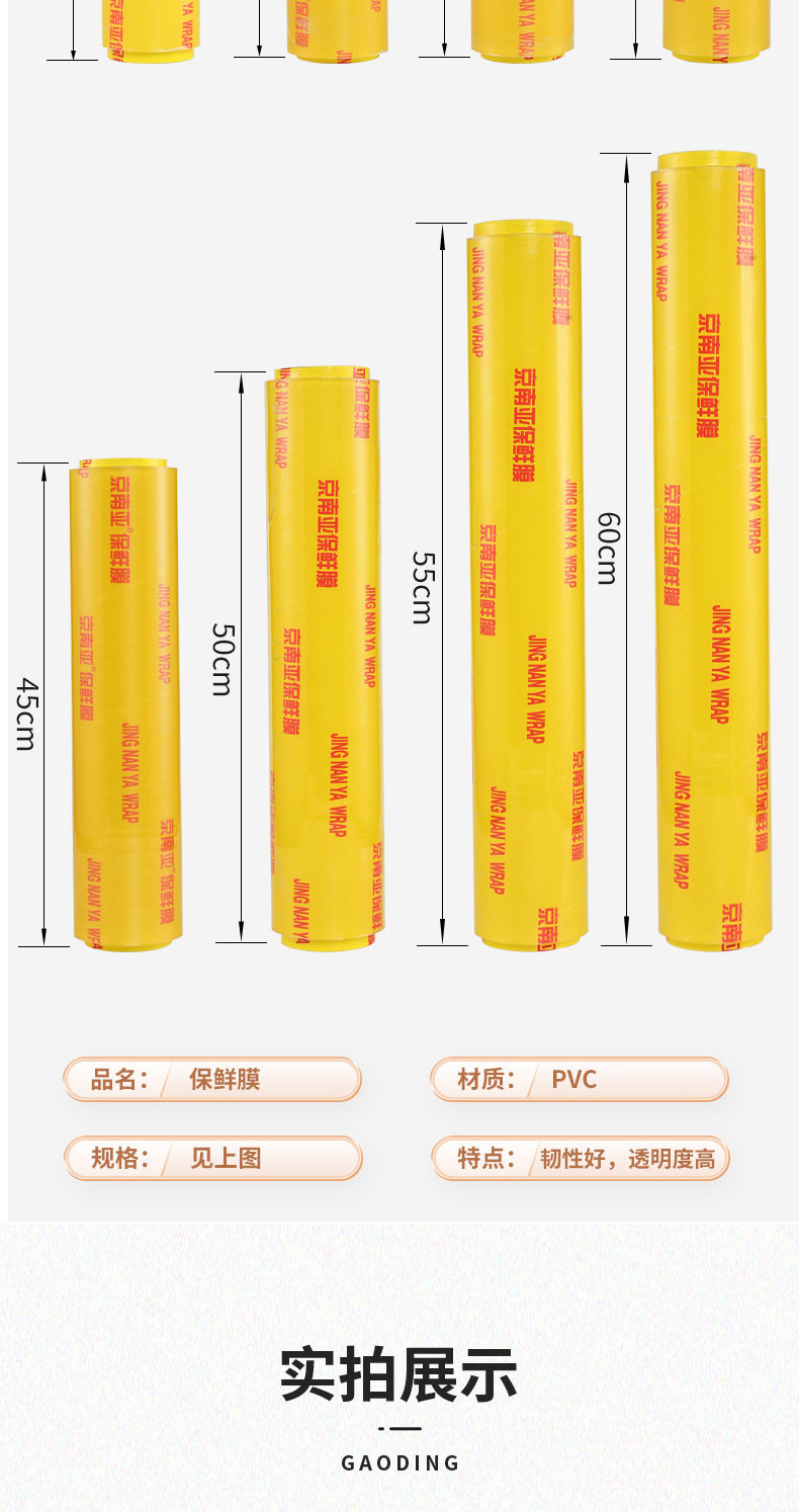 | Size | Strapping film 5cm*150 (about 80 grams),Strapping film 5cm*300 (about 180g),Strapping film 10cm*300 (about 360 grams),【0028】plastic wrap 25cm*150 (about 0.54kg ),【0028】plastic wrap 30cm*150 (about 0.64kg ),【0028】plastic wrap 35cm*150 (about 0.74kg ),【0028】plastic wrap 40cm*150 (about 0.89kg ),【0028】plastic wrap 45cm*150 (about 0.96kg ),【0028】plastic wrap 50cm*150 (about 1.09kg ),【0028】plastic wrap 60cm*150 (about 1.31kg ),【0048】plastic wrap 25cm*200 (about 0.69kg ),【0048】plastic wrap 30cm*200 (about 0.81kg ),【0048】plastic wrap 35cm*200 (about 0.94kg ),【0048】plastic wrap 40cm*200 (about 1.085kg ),【0048】plastic wrap 45cm*200 (about 1.23kg ),【0048】plastic wrap 50cm*200 (about 1.38kg ),【0048】plastic wrap 60cm*200 (about 1.58kg ),【0068】plastic wrap 25cm*300 (about 0.81kg ),【0068】plastic wrap 30cm*300 (about 0.98kg ),【0068】plastic wrap 35cm*300 (about 1.13kg ),【0068】plastic wrap 40cm*300 (about 1.49kg ),【0068】plastic wrap 45cm*300 (about 1.49kg ),【0068】plastic wrap 50cm*300 (about 1.63kg ),【0068】plastic wrap 55cm*300 (about 1.88kg ),【0068】plastic wrap 60cm*300 (about 1.98kg ),【0078】plastic wrap 25cm*400 (about 0.99kg ),【0078】plastic wrap 30cm*400 (about 1.18kg ),【0078】plastic wrap 35cm*400 (about 1.38kg ),【0078】plastic wrap 40cm*400 (about 1.58kg ),【0078】plastic wrap 45cm*400 (about 1.78kg ),【0078】plastic wrap 50cm*400 (about 1.98kg ),【0078】plastic wrap 60cm*400 (about 2.38kg ),【0088】plastic wrap 25cm*500 (about 1.23kg ),【0088】plastic wrap 30cm*500 (about 1.48kg ),【0088】plastic wrap 35cm*500 (about 1.73kg ),【0088】plastic wrap 40cm*500 (about 1.98kg ),【0088】plastic wrap 45cm*500 (about 2.23kg ),【0088】plastic wrap 50cm*500【about 2.48kg】,【0098】plastic wrap 25cm*700 (about 1.53kg ),【0098】plastic wrap 30cm*700 (about 1.855kg ),【0098】plastic wrap 35cm*700 (about 2.18kg ),【0098】plastic wrap 40cm*700 (about 2.48kg ),【0098】plastic wrap 45cm*700 (about 2.78kg ) |