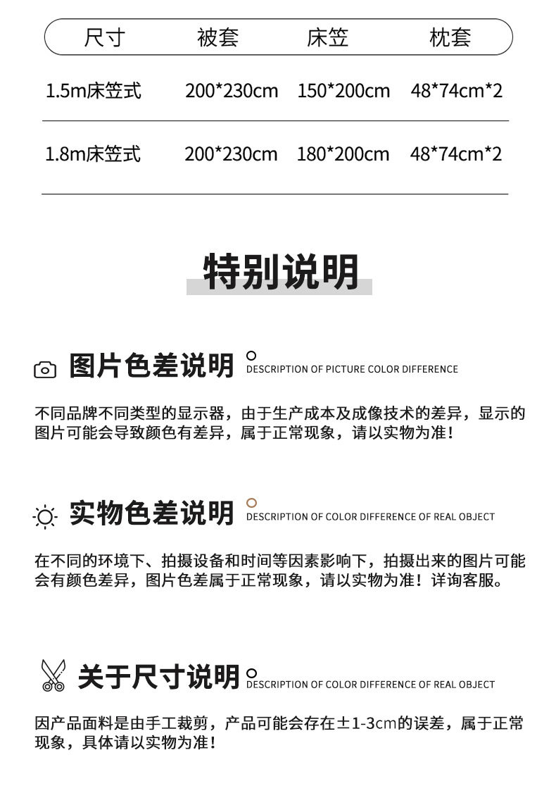Size specifications [bed sheets] 0.9 three-piece set-quilt cover 150x200,[bed sheets] 1.2 three-piece set-quilt cover 150x200,[sheet style] 1.5 four-piece set - quilt cover 200x230,【bed sheet style】1.8m four-piece bedding set - duvet cover 200x230cm,[sheet style] 2.0 four-piece set - quilt cover 220x240,[fitted sheet] 1.5 four-piece set-quilt cover 200x230,[fitted sheet] 1.8 four-piece set - quilt cover 200x230