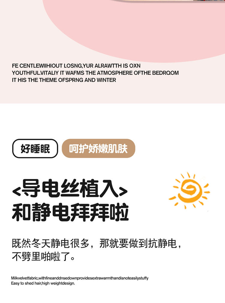 | Efficacy | Thickened milk velvet is skin-friendly and warm. it is implanted with conductive threads. it is more suitable for sleeping naked. it can be machine washed and frees your hands. it is easy to store and provides a more comfortable sleeping experience |