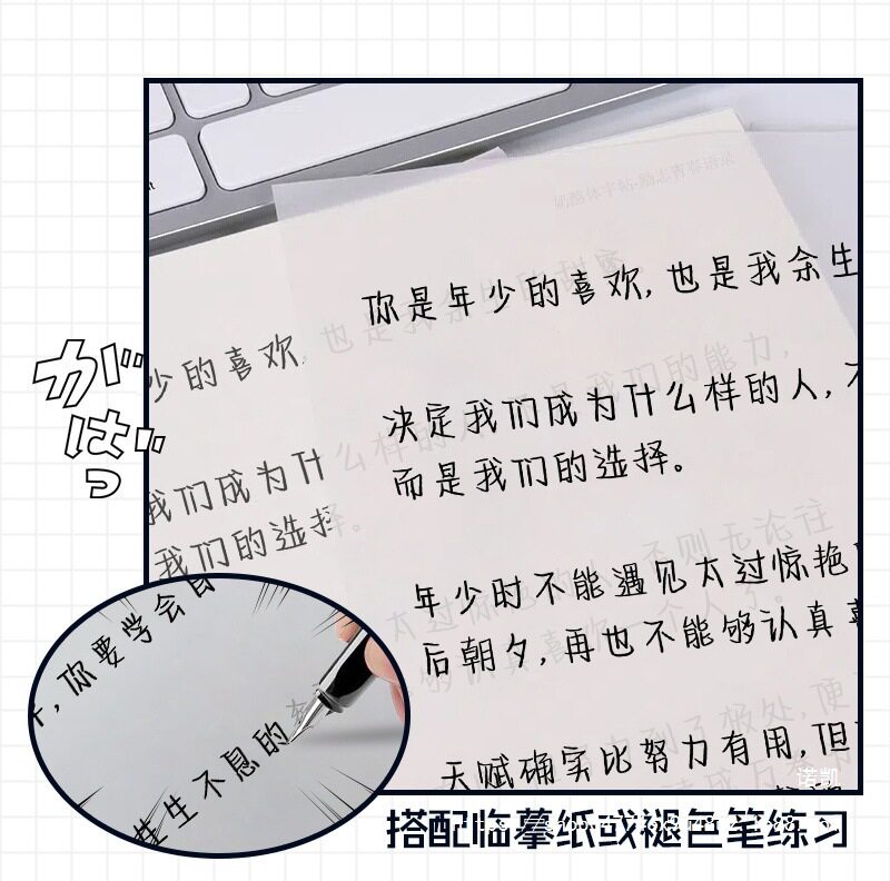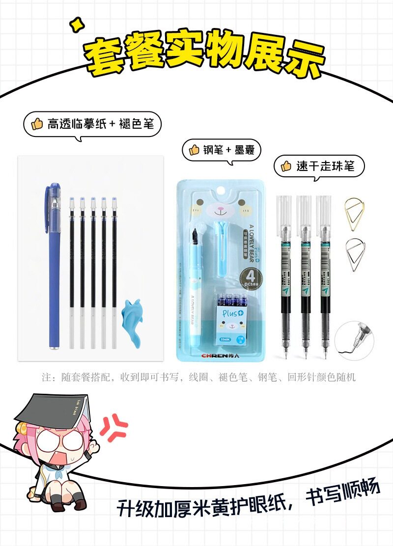 | Specifications | Single copybook [without copy paper] ✓,Copybook + faded pen [5 refills included] ✓,100 sheets of copybook + copy paper [free paper clips] ✓,Copybook + copy paper + quick-drying calligraphy pen [2 pens free] ✓,Copybook + copy paper + faded pen [5 refills included] ✓,Copybook + copy paper + pen [4 ink bags included] ✓ |