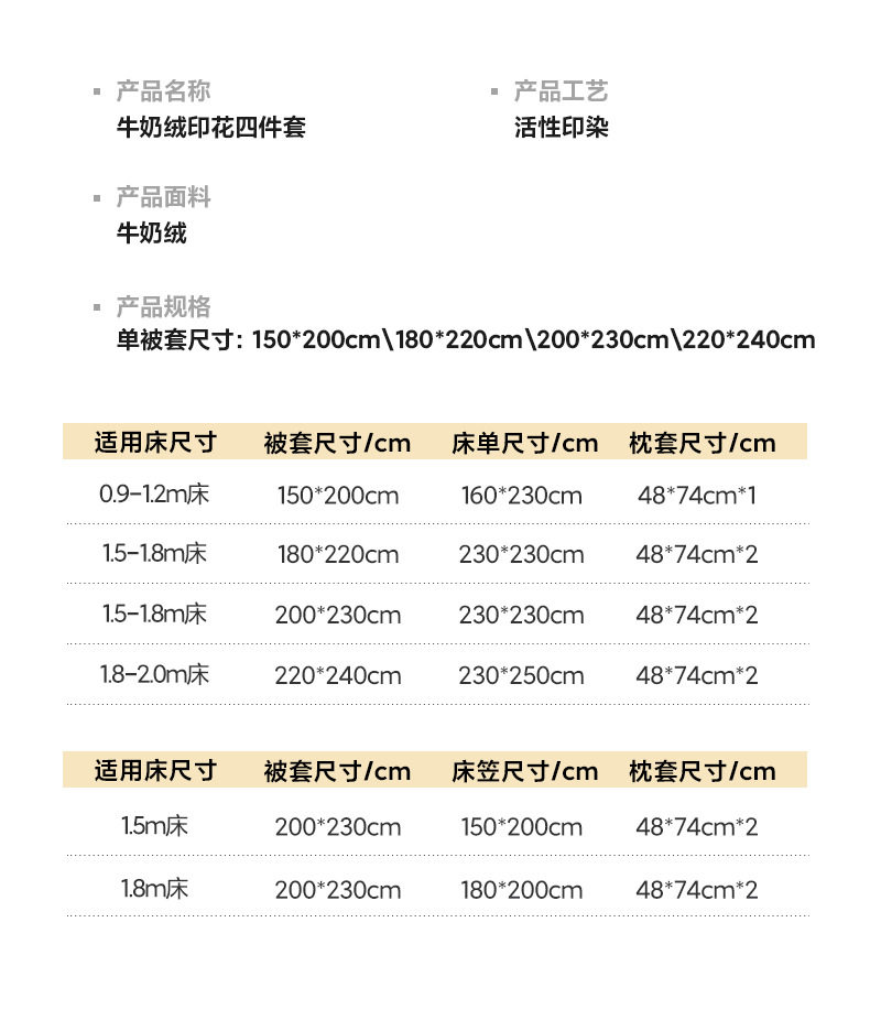 | Size specifications | Student bed [three-piece bed sheet set] - suitable for 150x200cm quilt core,1.2m bed [three-piece bed sheet set] - suitable for 150x200cm quilt core,1.5m bed [sheet set of four] - suitable for 150x200cm quilt core,1.8m bed [sheet set of four pieces] - suitable for 180x220cm quilt core,1.5m bed [sheet set of four] - suitable for 200x230cm quilt core,1.8m bed [sheet set of four pieces] - suitable for 200x230cm quilt core,2.0m bed [sheet set of four] - suitable for 220x240cm quilt core,1.5m bed [four-piece fitted sheet set] - suitable for 200x230cm quilt core,1.8m bed [four-piece fitted sheet set] - suitable for 200x230cm quilt core |