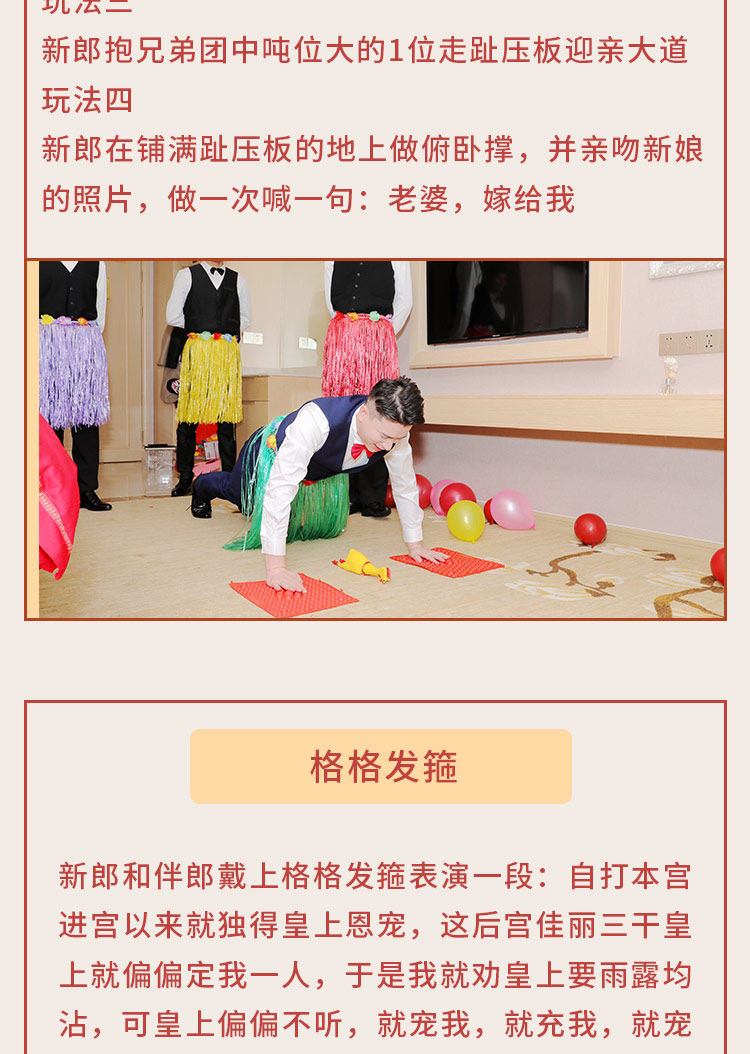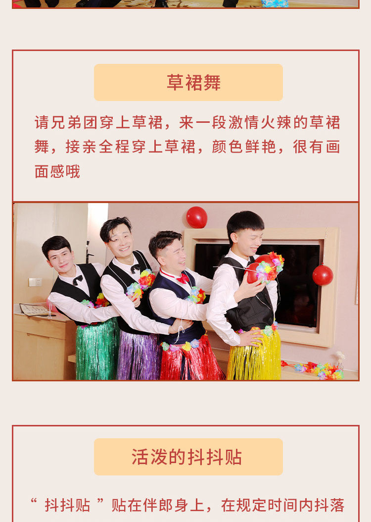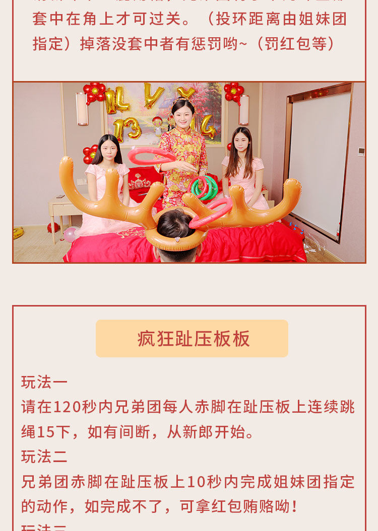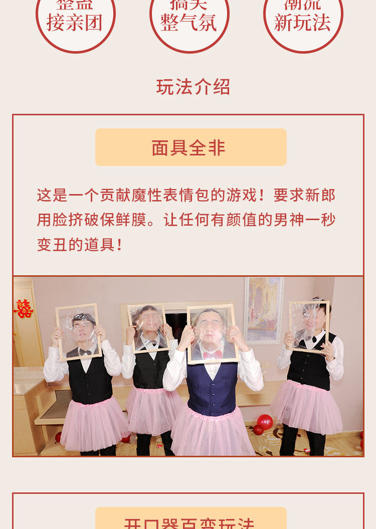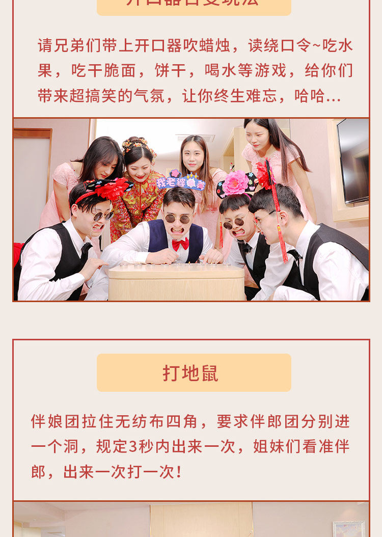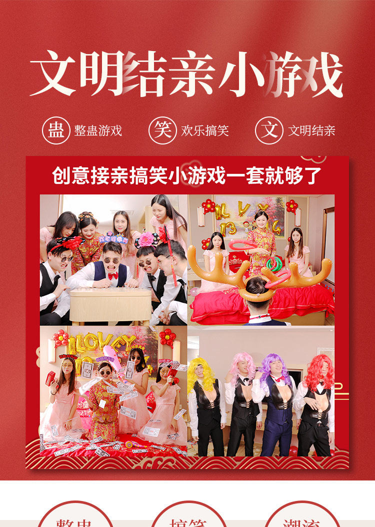 | Color | 5 openers,1 flower inflatable wedding hammer,Highly recommended_happy chopsticks for holding money [photo-taking tool],Highly recommended_twerking master [never-ending joy],Highly recommended_1 point east and look west,Highly recommended_ touch mahjong with eyes blindfolded,Antler hoop,Act like a big shot,Highly recommended_receive a kiss and throw a pot,Ferrule goose,Zhuge eats candy hat,Wedding shoe ferrule,5 photo microphones,10 festive confetti guns,Lottery tube,1 inflatable microphone,Pp expert,10 hand-thrown ribbons,1 koi goldfish,Chinese colorful dragon,Escape from crocodile mouth,Dinosaur ball gun,Atmosphere bubble machine,Connect to the vision chart,5 cartoon fans,1 antique double-sided fan [randomly sent],Photography pose,Opener reads tongue twisters [opener 5 cards 6 pieces],Jieqin sanziqi [we are getting married],2 screaming chickens,Fan for picking up relatives and groomsmen [randomly sent, please note],Guess the lines from the picture [the legend of zhen huan],Receiving the bride: the game of hua rong dao,Festive little colorful dragon,Bank card oath,Blindfolded lipstick,2 packs of pick-up and pick-up stickers,A pair of prince sunglasses,Sunflower saxophone 1 set,1 set of sausage mouth and big ears,Funny masks [randomly distributed, please note],Happy whack-a-mole set,1 set of garbage classification,In a hurry,Word guessing game (5 images + 1 answer sheet) - set of 2,Word guessing set 2 (10 pieces of content + 1 answer),10 photos of the wedding ceremony + free ink pad + pen,Pickup game card set 1,Eye-catching pattern challenge,Eye power challenge-text version |