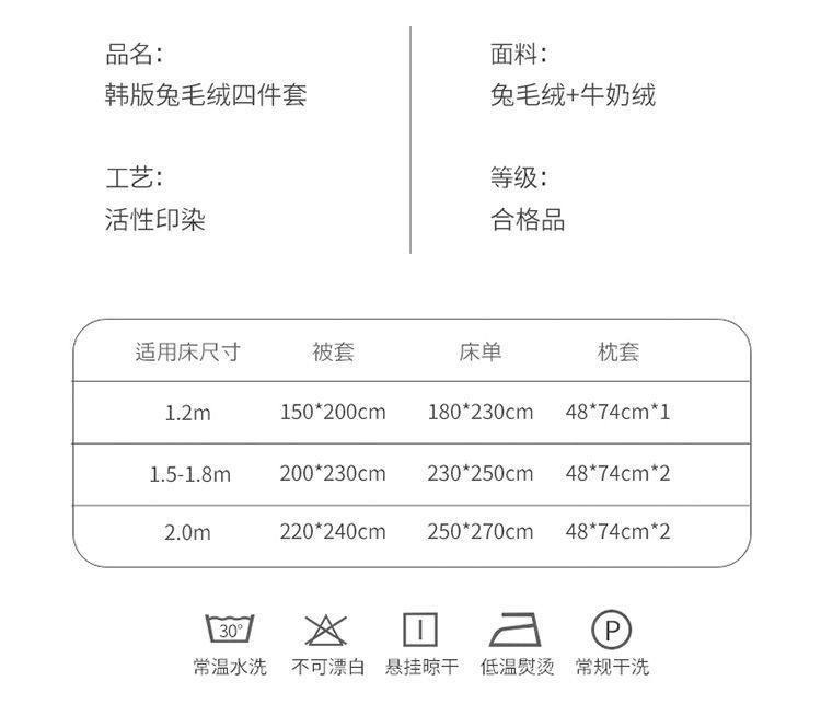 | Size specifications | 1.2 bed (150*200 quilt cover) three-piece set,1.5 bed (200*230 quilt cover) four-piece set,1.8 bed (200*230 quilt cover) four-piece set,2.0 bed (200*230 quilt cover) four-piece set,2.2 bed (220*240 quilt cover) four-piece set |