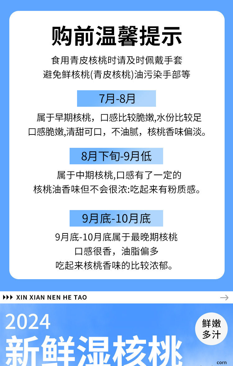 | Packaging specifications | Fresh wet walnuts with green skin removed 1.5kg [free clip],Peeling 1.5kg without clip,Fresh wet walnuts with green skin removed 2.5kg [free clip],Peeling 2.5kg without clip |