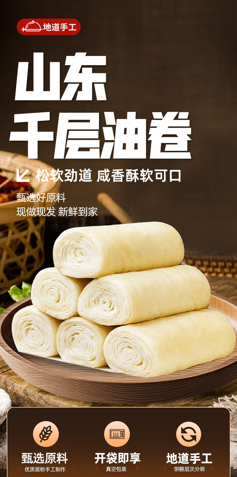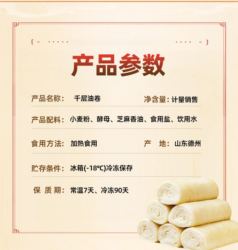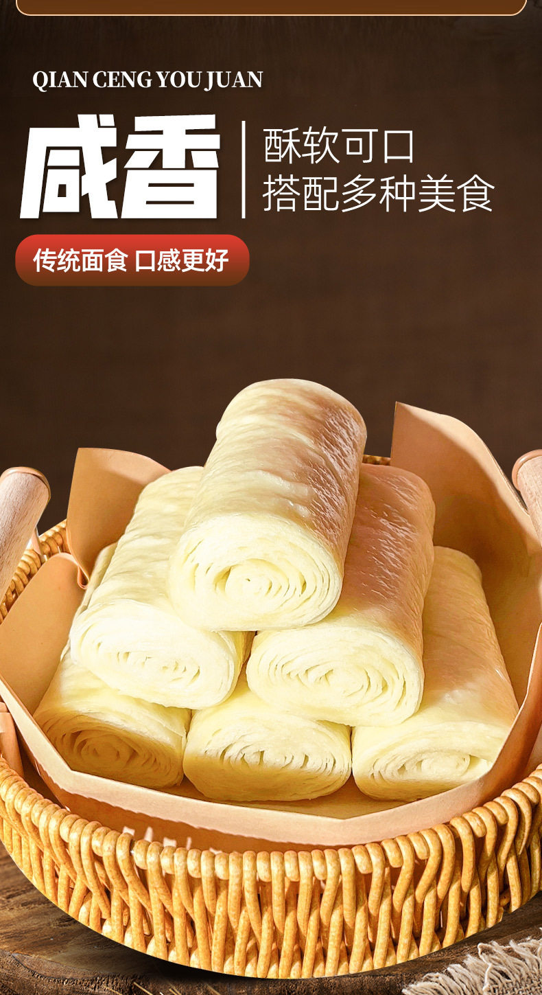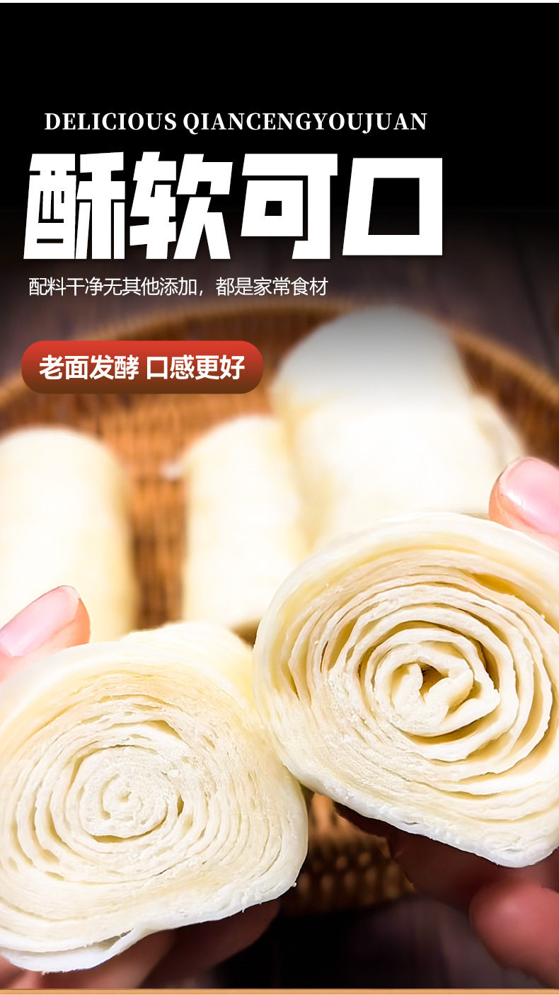| Packaging specifications | 6 pieces of thousand-layer oil rolls (480g/1 bag),12 pieces of thousand-layer oil rolls (960g/2 bags),18 thousand-layer oil rolls (1440g/3 bags) |