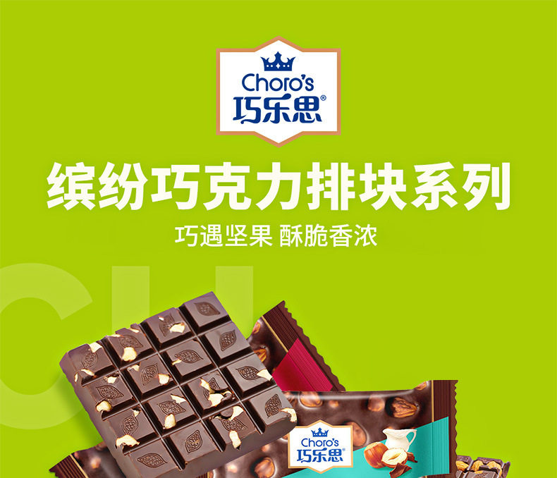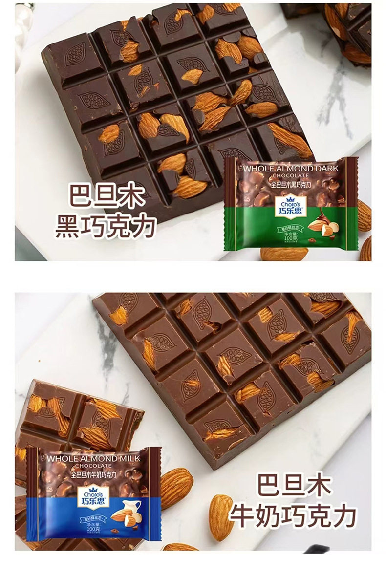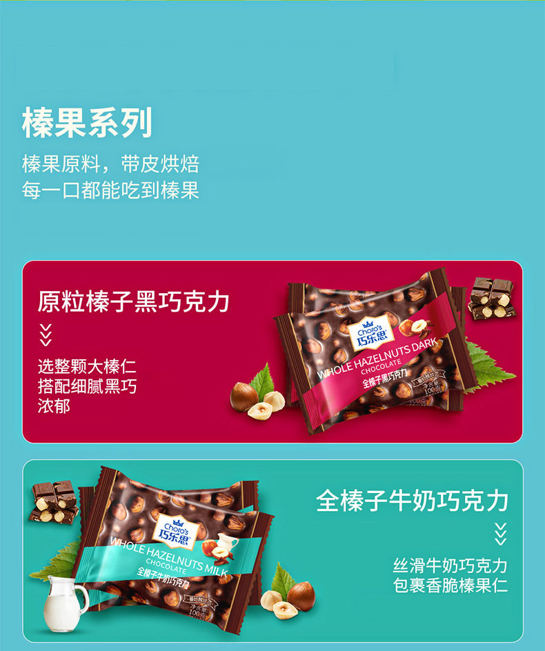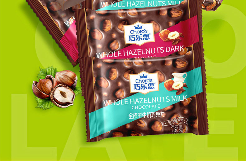 | Packaging specifications | Qiaolesi whole hazelnut milk chocolate 100g pieces,Qiaolesi whole hazelnut dark chocolate 100g pieces,Qiaolesi almond dark chocolate 100g pieces,Qiaolesi almond milk chocolate 100g bar |