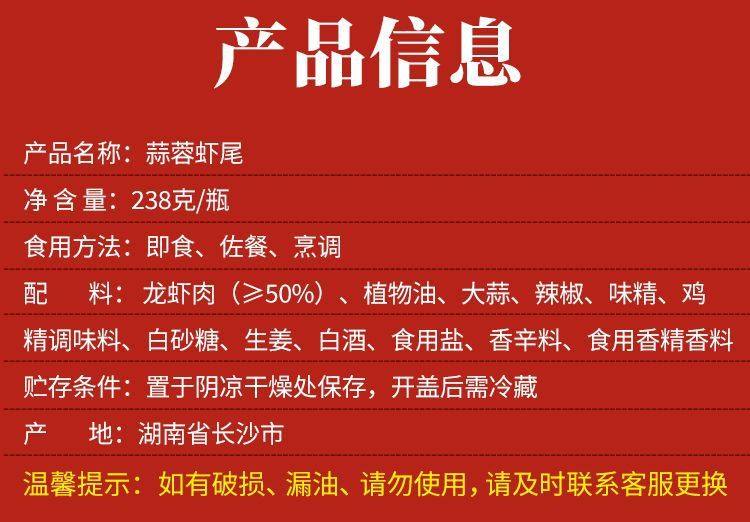 | Packaging specifications | Garlic shrimp tails 238g two bottles -ningshifu&,Garlic shrimp tails 238g bottle -ningshi fu&,Garlic shrimp tail 238g + grandma's bacon 238g -ningshi fu&,Garlic shrimp tail 238g + firewood fish 238g -ningshifu& |