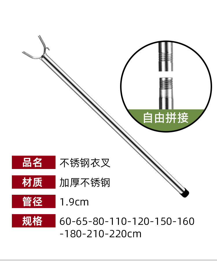 304 Stainless Steel Clothes Drying Rod with Integrated Fork, Extended Clothes Drying Rod with Fork, Clothes Drying Rod with Fork, Fixed Clothes Drying Fork