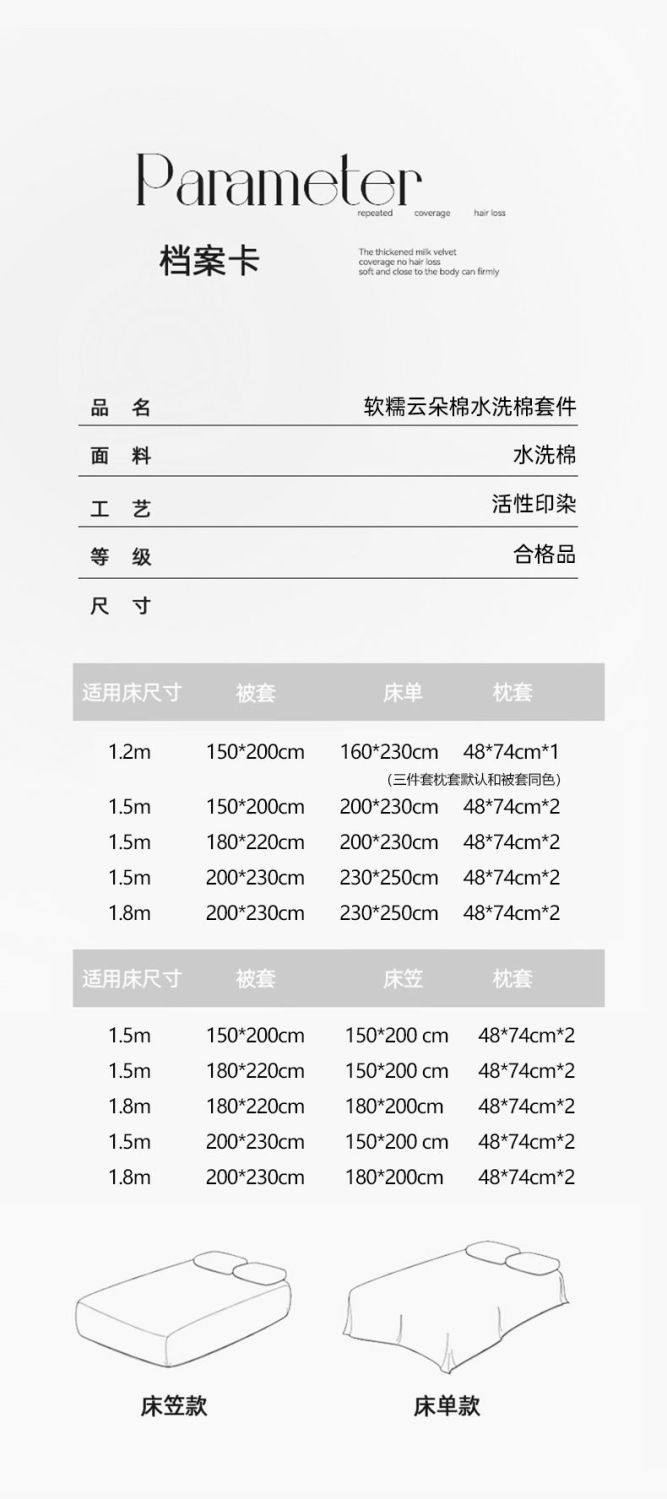 | Size specifications | Three-piece dormitory bed set-quilt cover 150x200,1.2m bed three-piece set-quilt cover 150x200,1.5m bed four-piece set-quilt cover 150x200,1.8m bed four-piece set-quilt cover 180x220,2.0m bed four-piece set-quilt cover 200x230,1.5 fitted sheet set of four - quilt cover 150x200,1.5 fitted sheet set of four - quilt cover 180x220,1.8m fitted sheet four-piece bedding set - duvet cover 180x220 cm,1.5 fitted sheet set of four-quilt cover 200x230,1.8m fitted sheet four-piece bedding set - duvet cover 200x230cm |