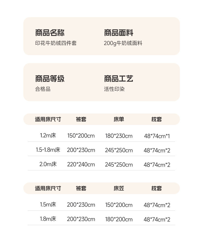 | Size specifications | 1.2m bed sheet three-piece set [quilt cover 150x200],1.5m bed sheet four-piece set [quilt cover 200x230],1.8m bed sheet four-piece set [quilt cover 200x230],2.0m bed sheet four-piece set [quilt cover 220x240],1.5m fitted sheet set of four [quilt cover 200x230],1.8m fitted sheet set of four [quilt cover 200x230] |