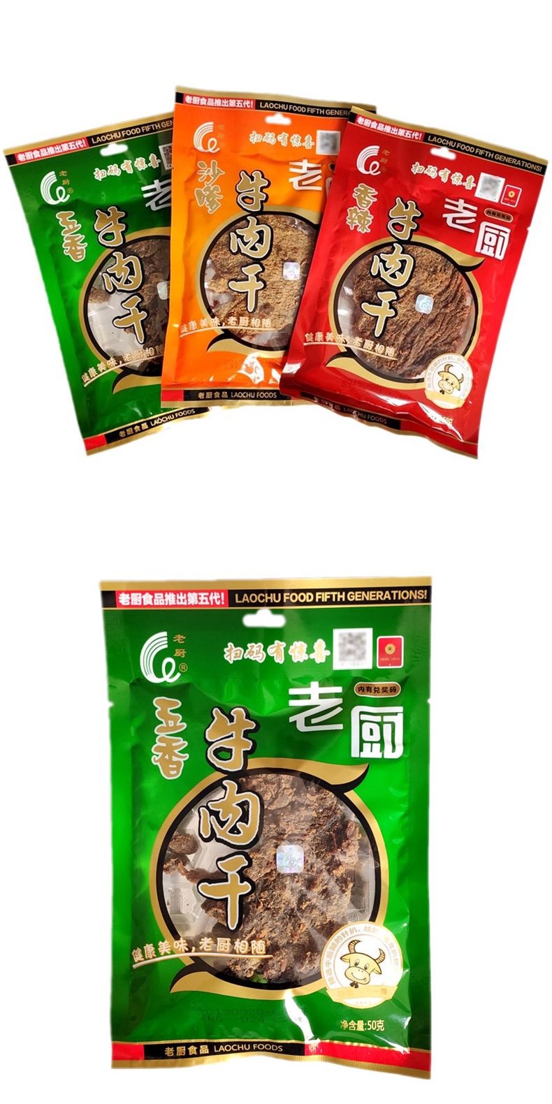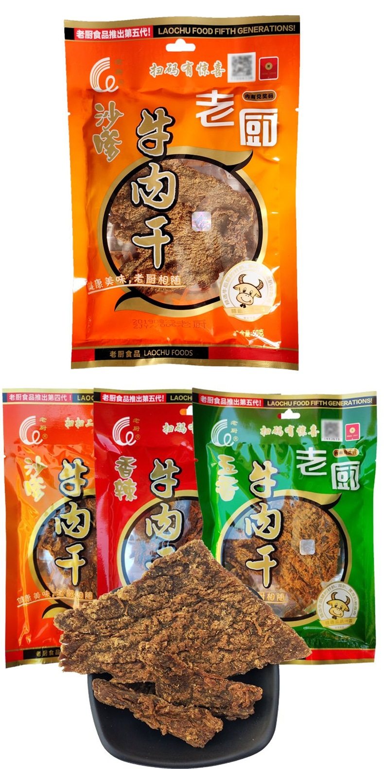 Beef Jerky 50g 3 Bags Spicy Five-Spice Satay Flavor Office Casual Snacks Small Food Source Factory One Piece Wholesale