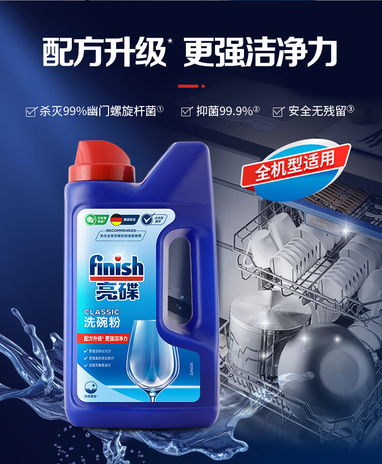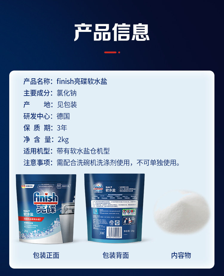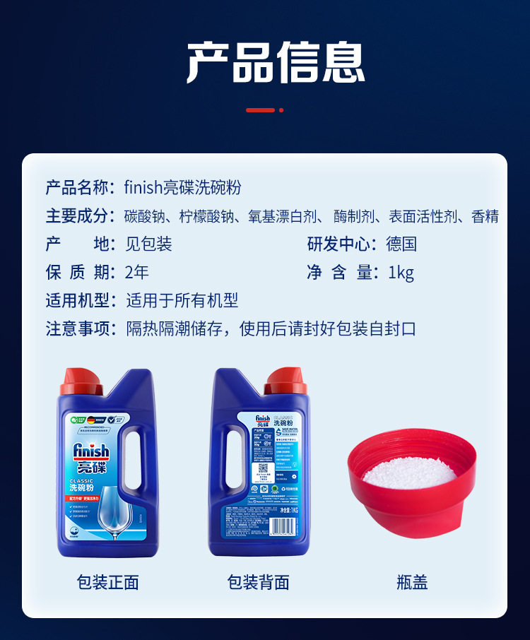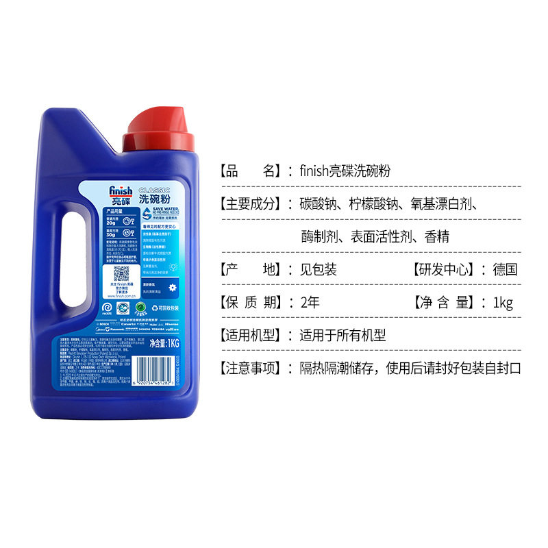 | Specifications | Finish dishwashing powder 1kg,Finish disc-soft water salt 2kg,Finish dish rinse agent 500ml,All-in-one small dishwashing cubes 24 pieces,Multi-effect-in-one dishwashing liquid 700ml |