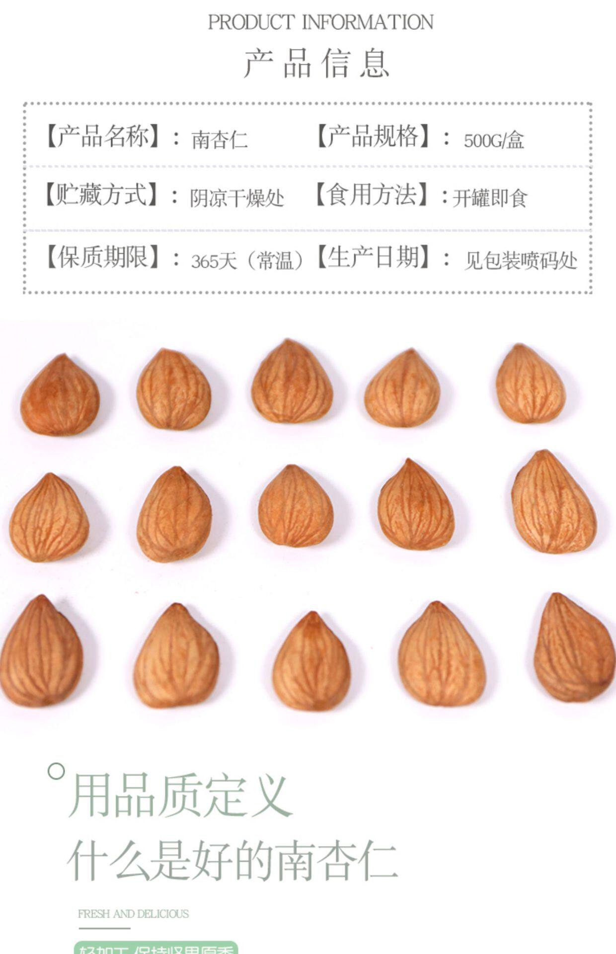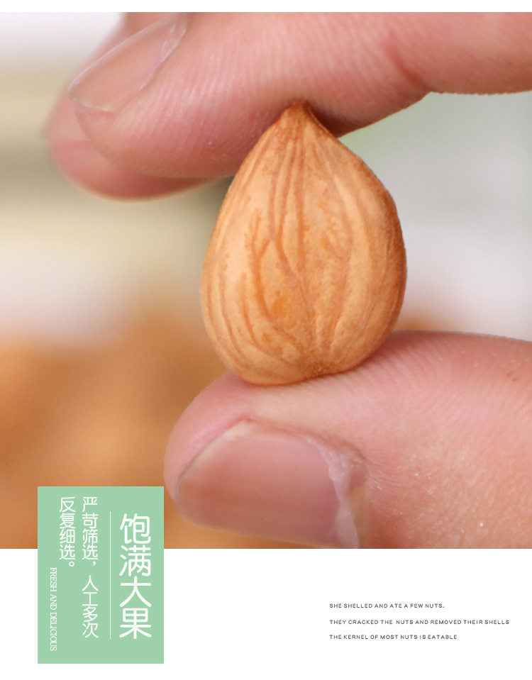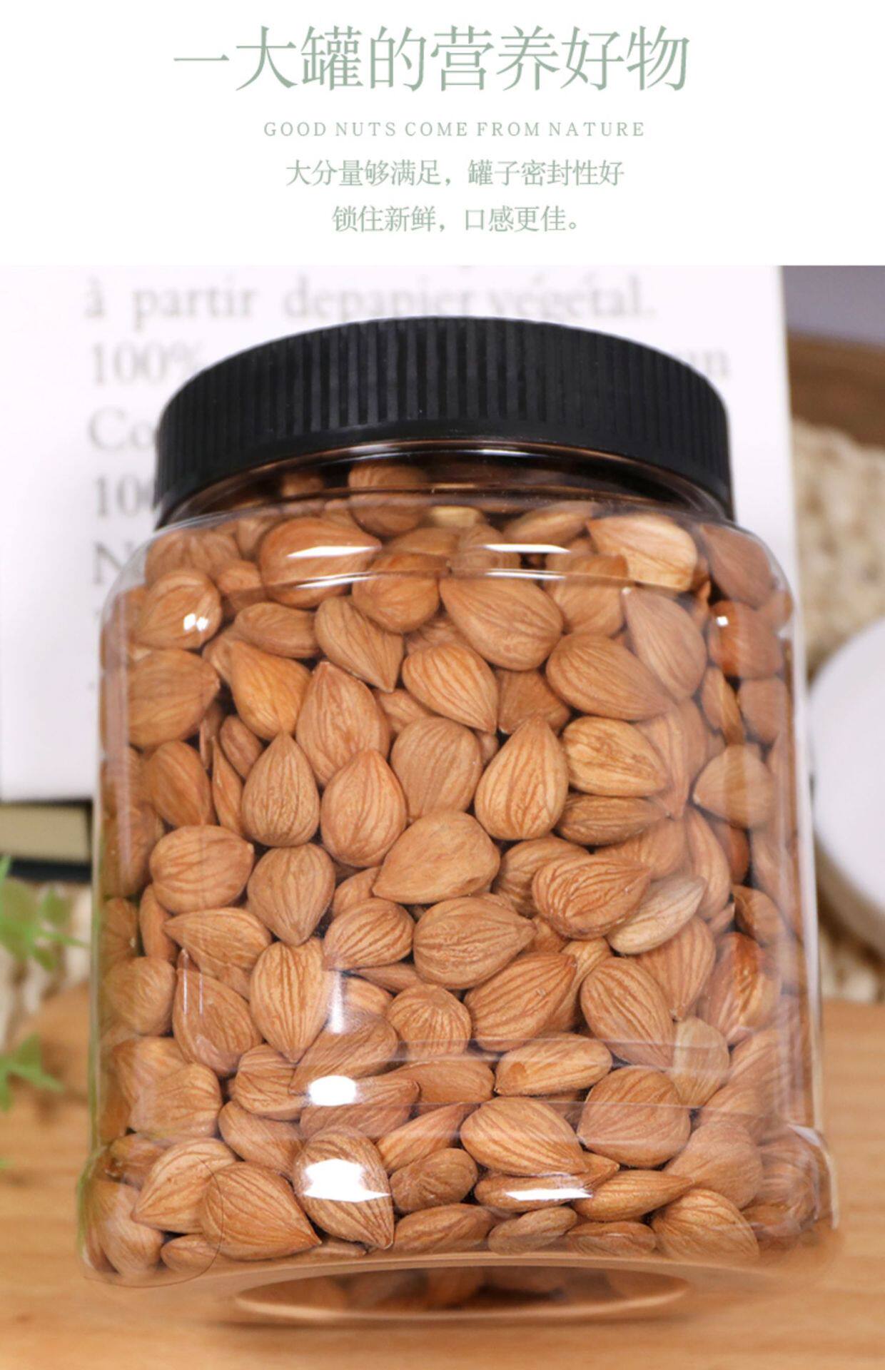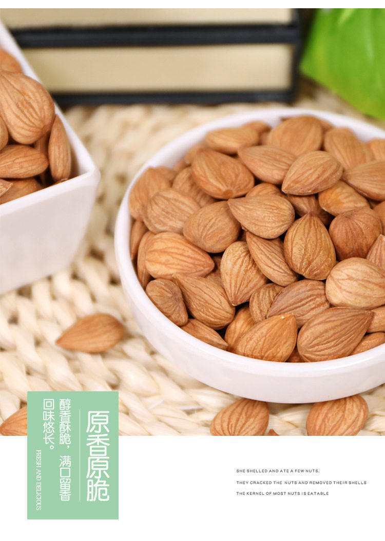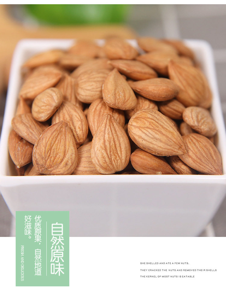 | Packaging specifications | [large south almond, dragon emperor apricot] 500g original raw (large can affordable),[large south almond, dragon emperor apricot] 500g original flavor cooked (large can affordable),[large south almonds, dragon emperor apricot] 500g lightly salted and cooked (large can at an affordable price) |