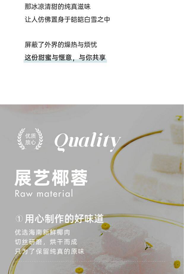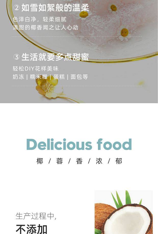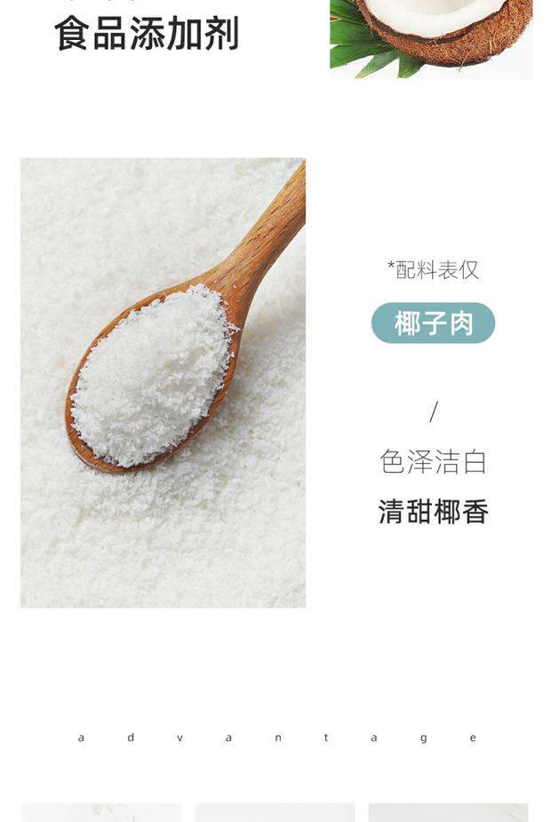 | Packaging specifications | [early tasting pack] coconut 100g,[convenient to try] coconut 100g*2 bags,[super cost-effective] coconut 100g*5 bags,【more customer choices】coconut 500g,[affordable] coconut 500g*2 bags,[coconut milk recipe] 100g coconut + 10 slices of gelatine + 400ml coconut milk,500g coconut + 400ml coconut milk,[coconut matcha] coconut 100g*2 bags + matcha powder 20g,[nuomi ci] coconut 100g*2 bags + sanxiang glutinous rice flour 500g,Zhanyi milk powder 100g,Zhanyi milk powder 100g*2 bags |